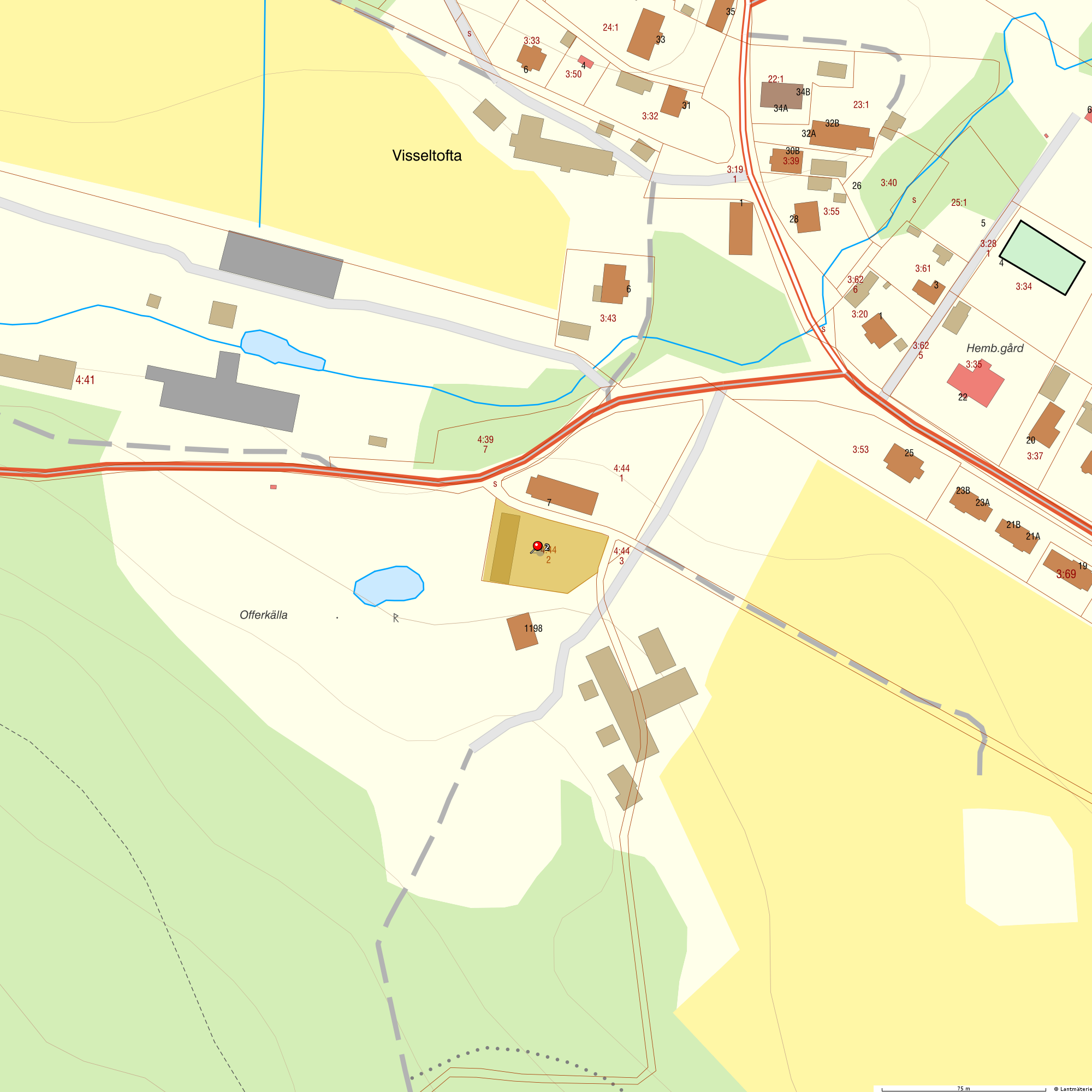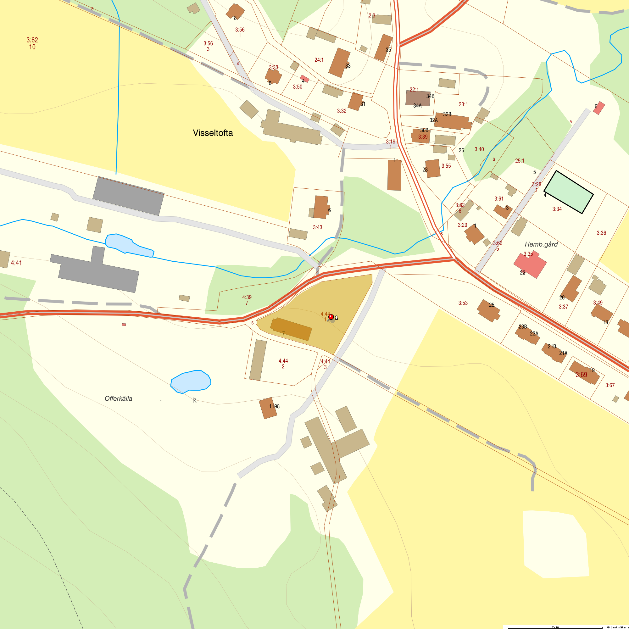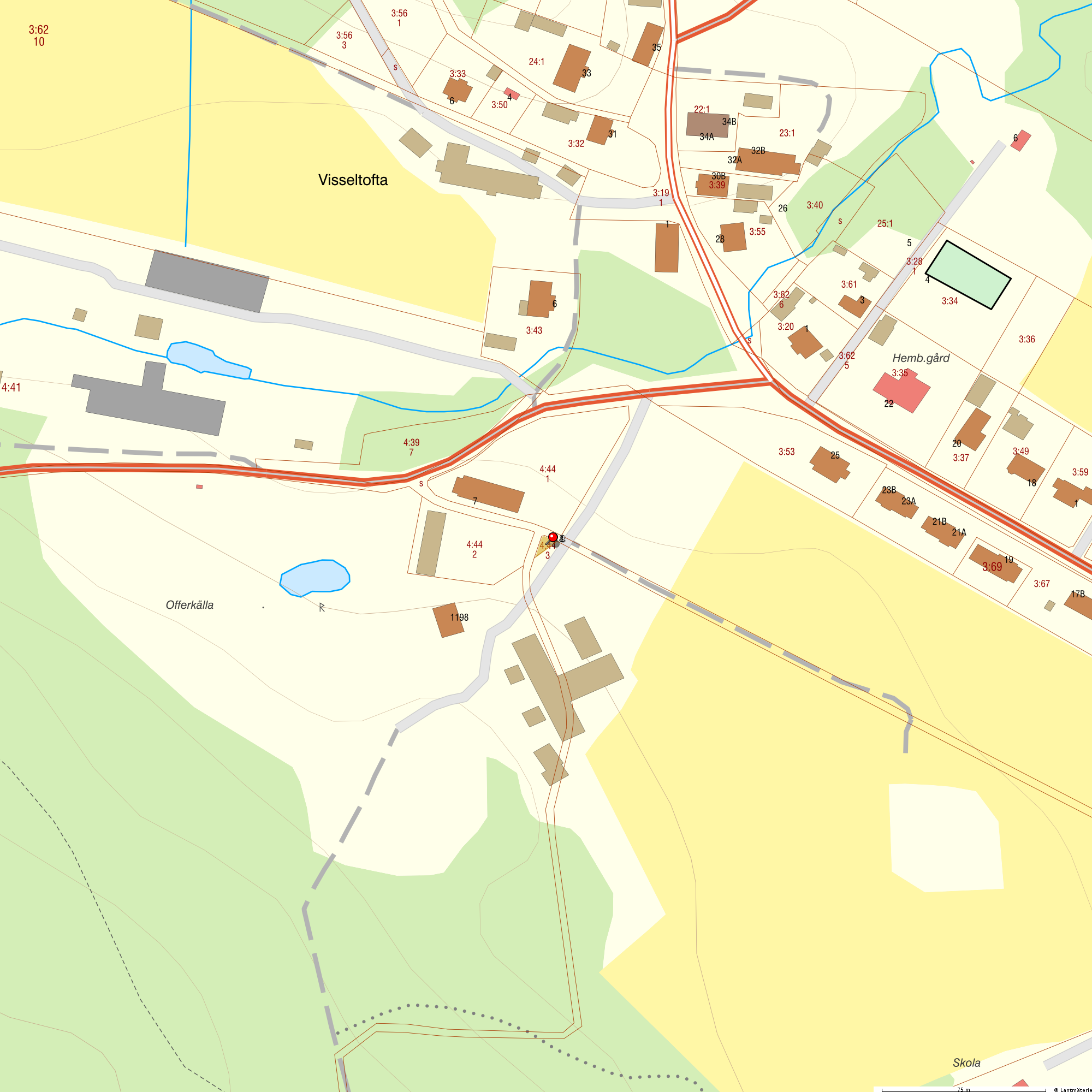 Officialservitut. Förmån. Väg. Akt. 11-VIT-414.2. Förmån: Osby Visseltofta 4:44, Last: Osby Visseltofta 4:39. Beskrivning: Rätt att för utfart använda området x till en bredd av 4,5 meter. Officialservitut. Förmån. Vattentäckt, vattenledning. Akt. 11-VIT-414.3. Förmån: Osby Visseltofta 4:44, Last: Osby Visseltofta 4:39. Beskrivning: Rätt att ta vatten från källan y, behålla och vid behov förnya vattenledning dit.