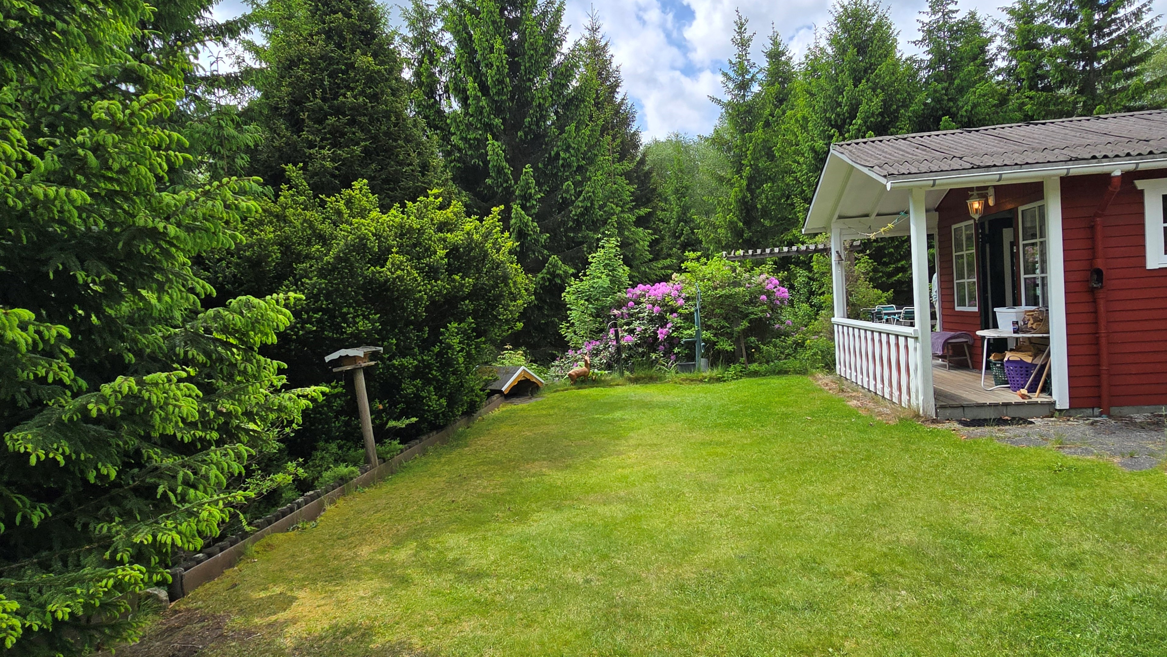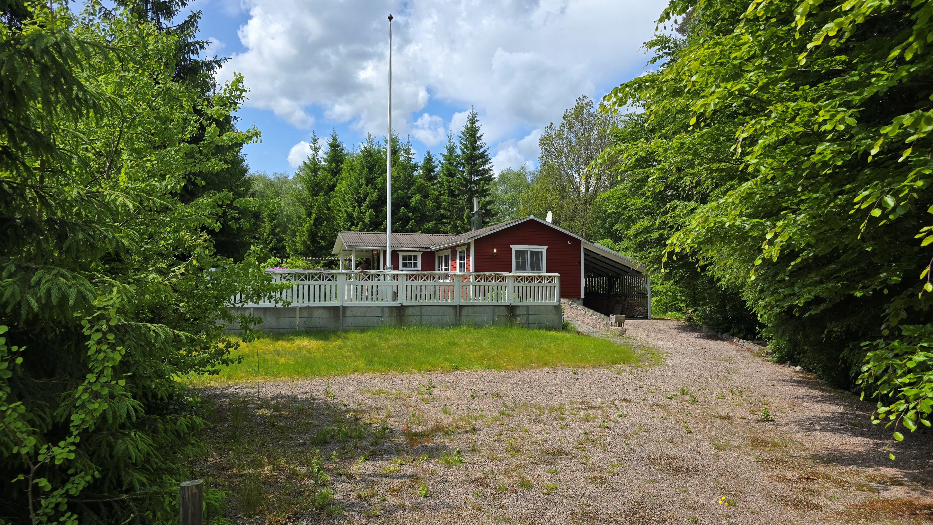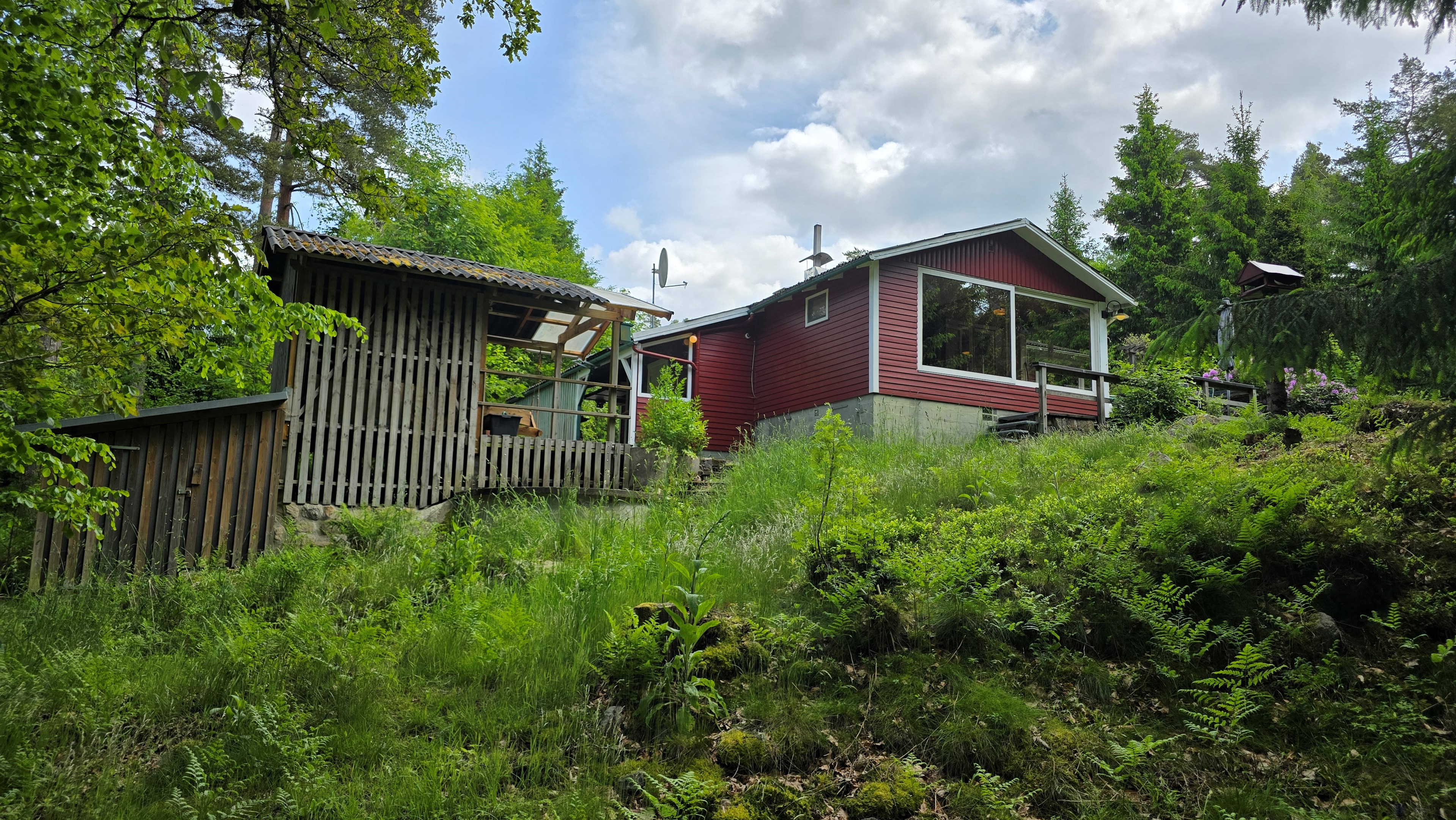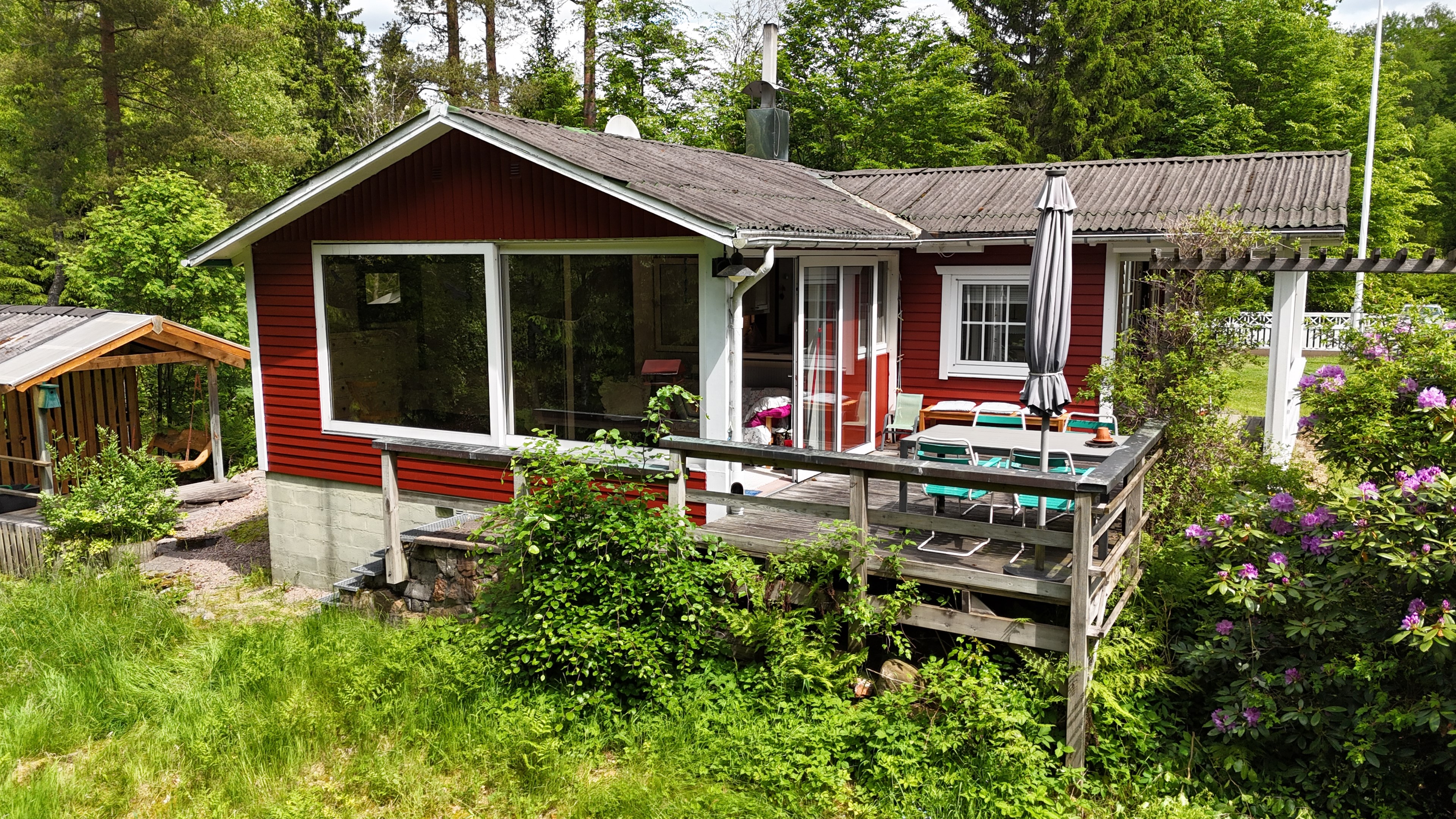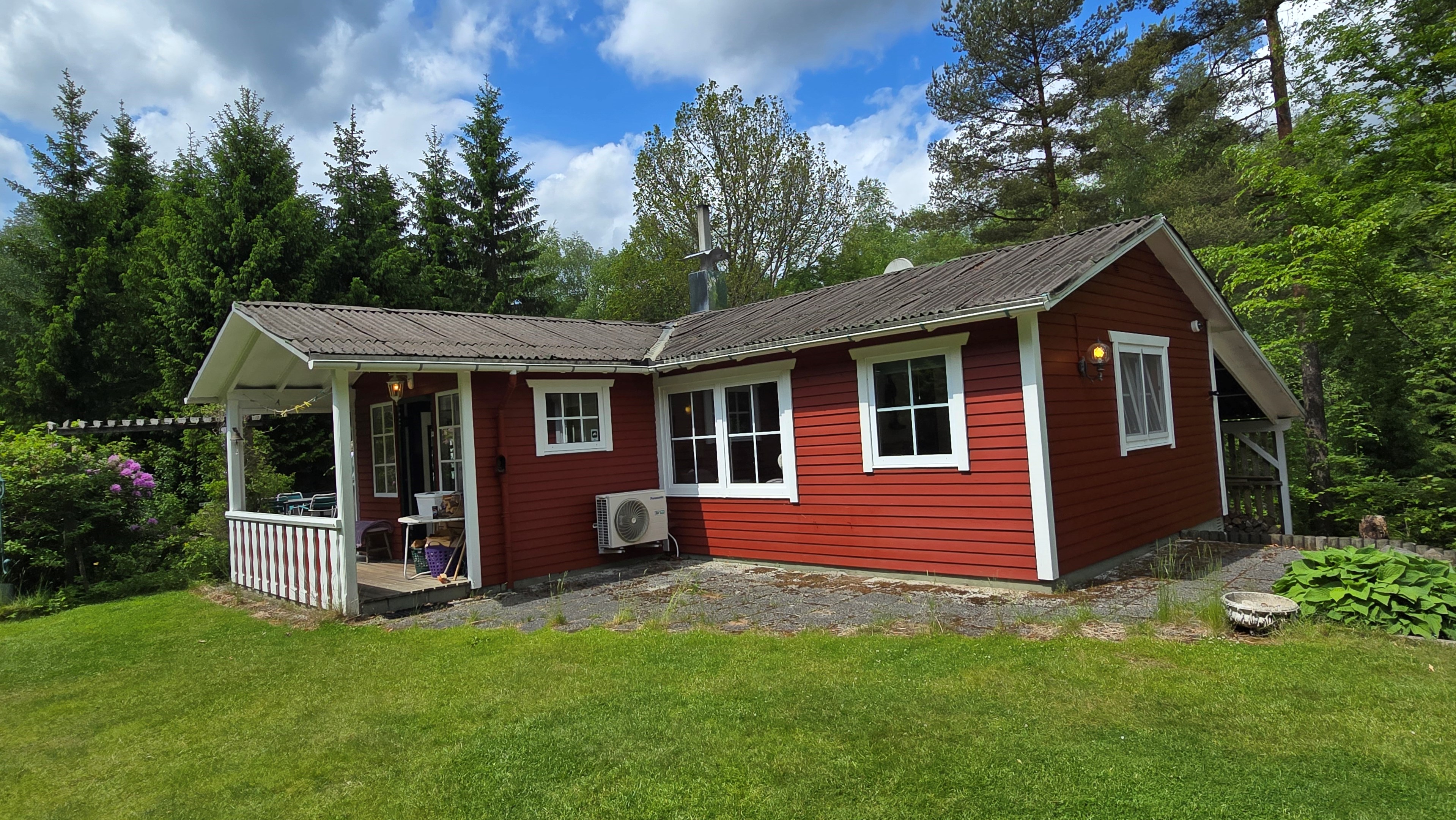 Fritidshus i gott skick på 79 m² med terrasser och uthus. 2 279 m² naturtomt, 500 m. till Smedjeån.