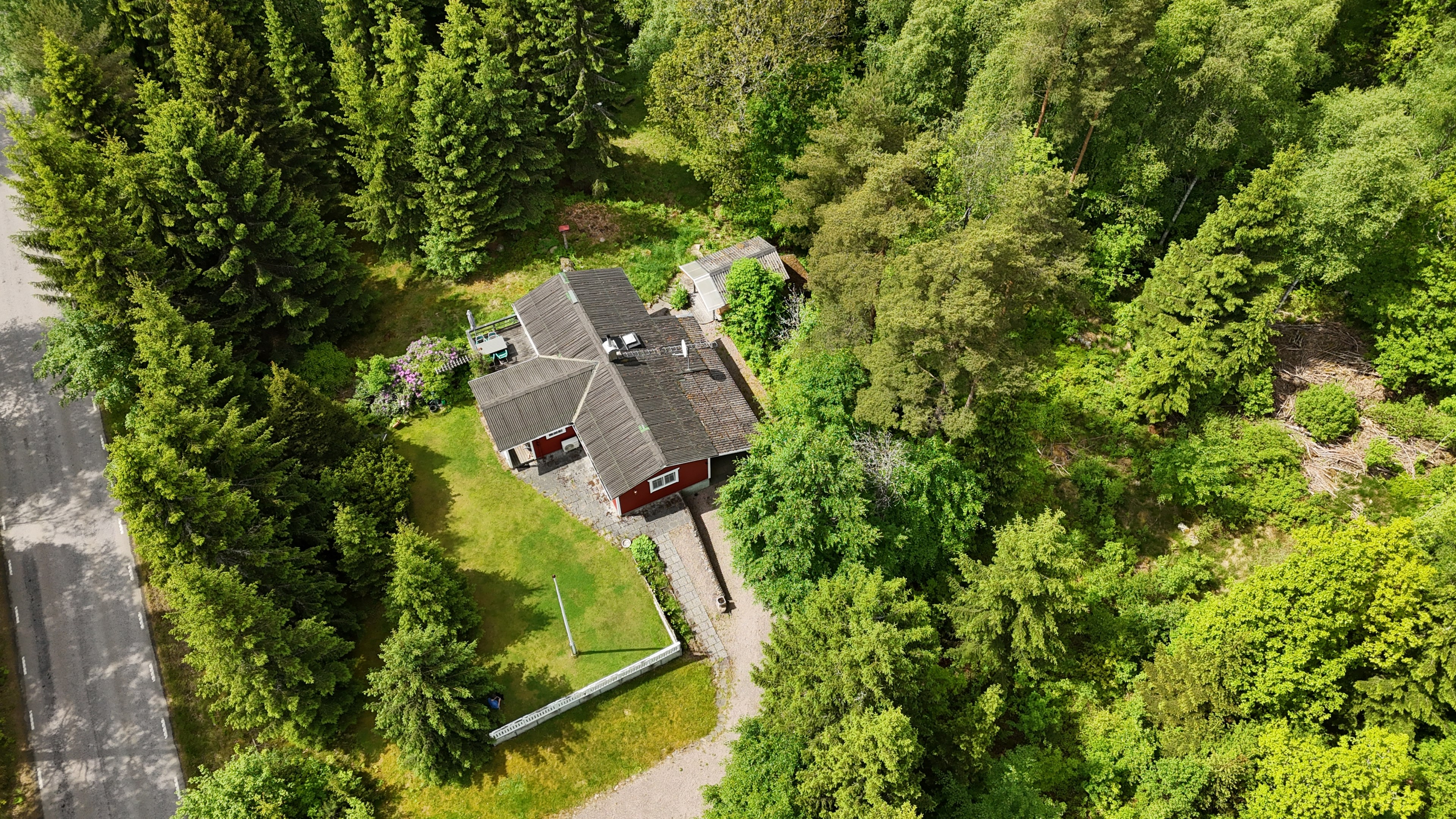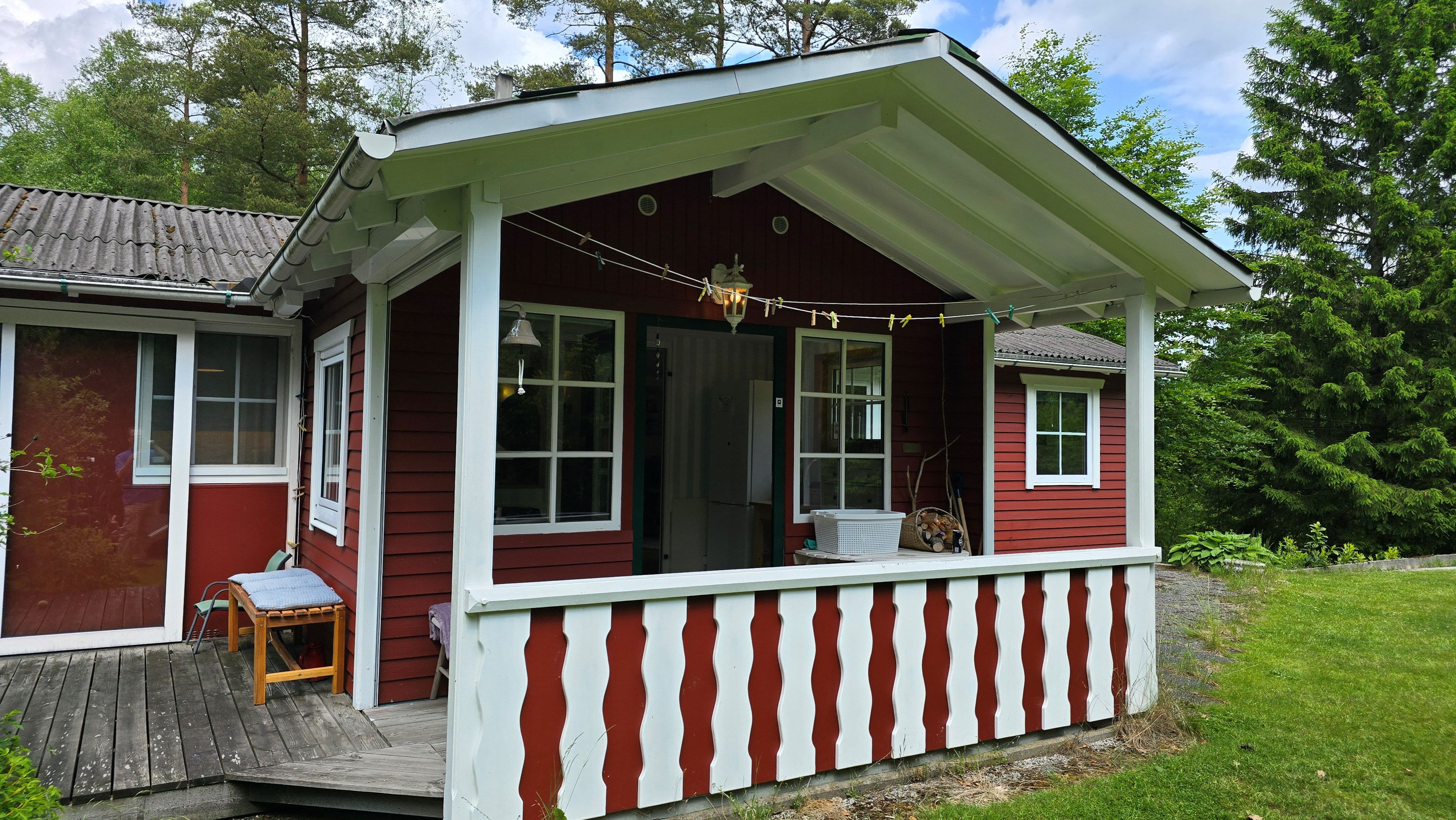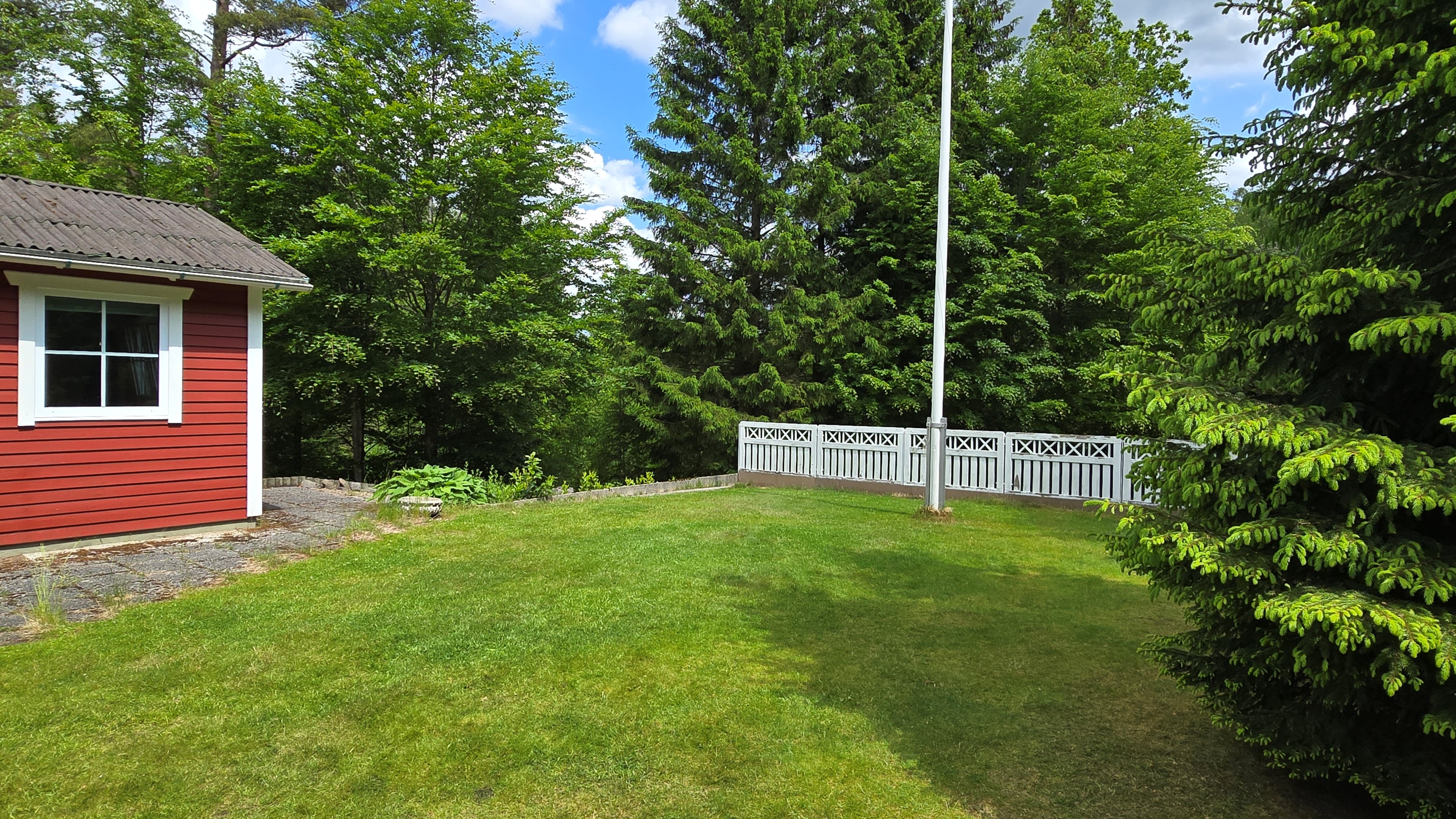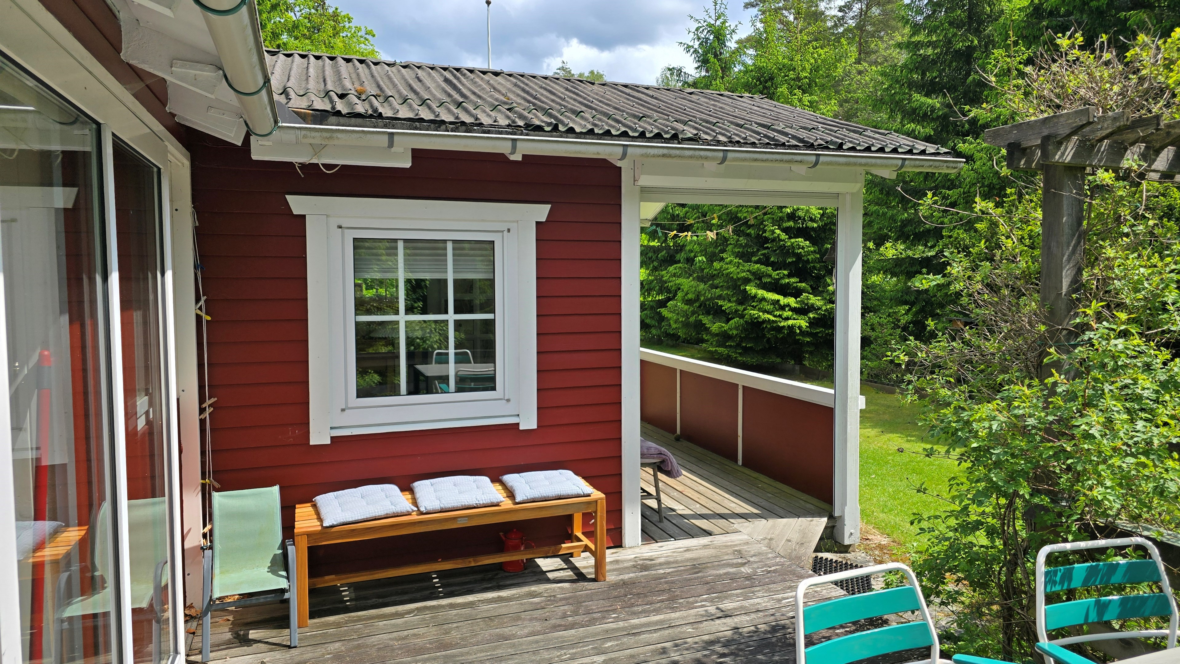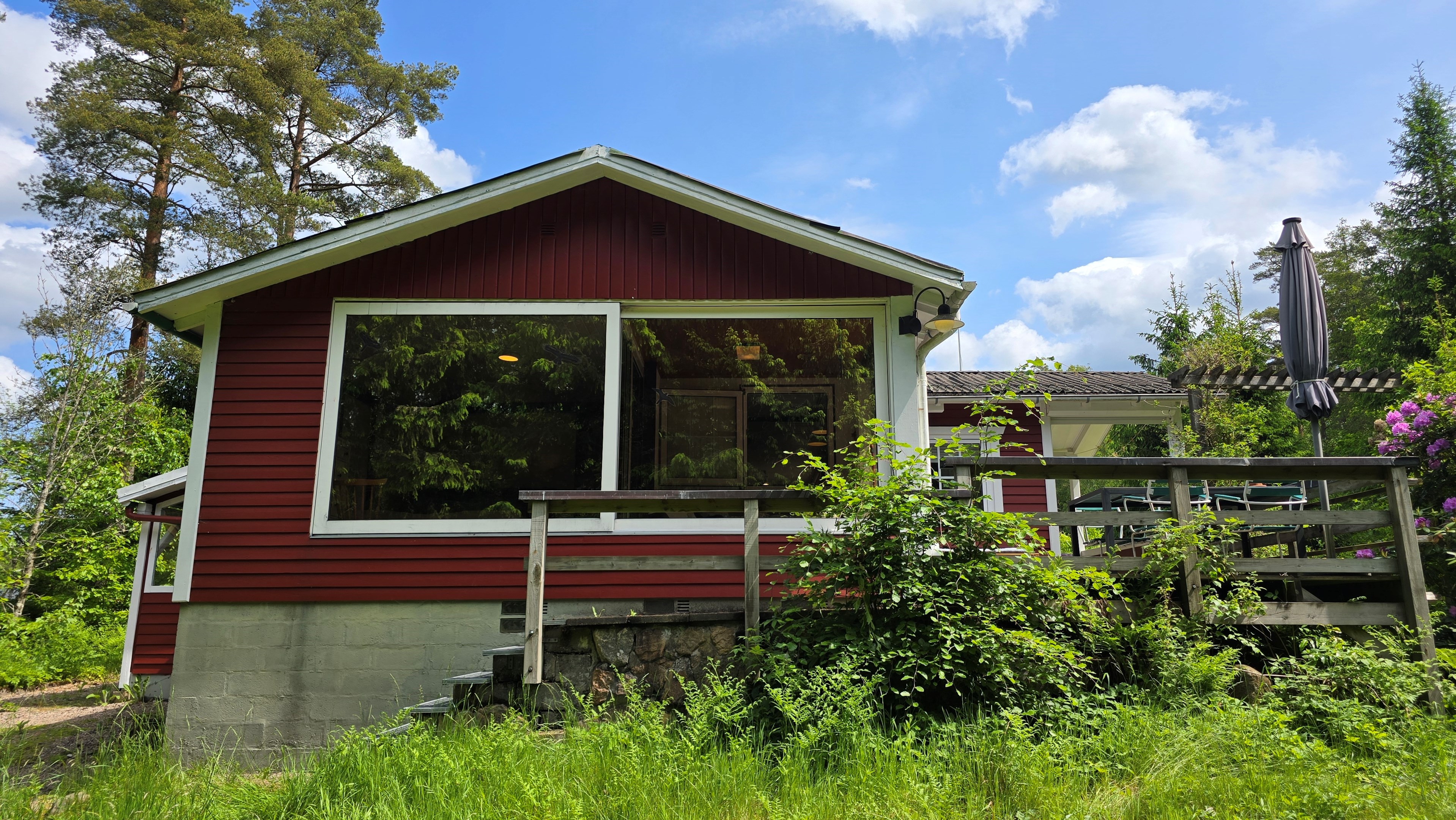 Fritidshus i gott skick på 79 m² med terrasser och uthus. 2 279 m² naturtomt, 500 m. till Smedjeån.