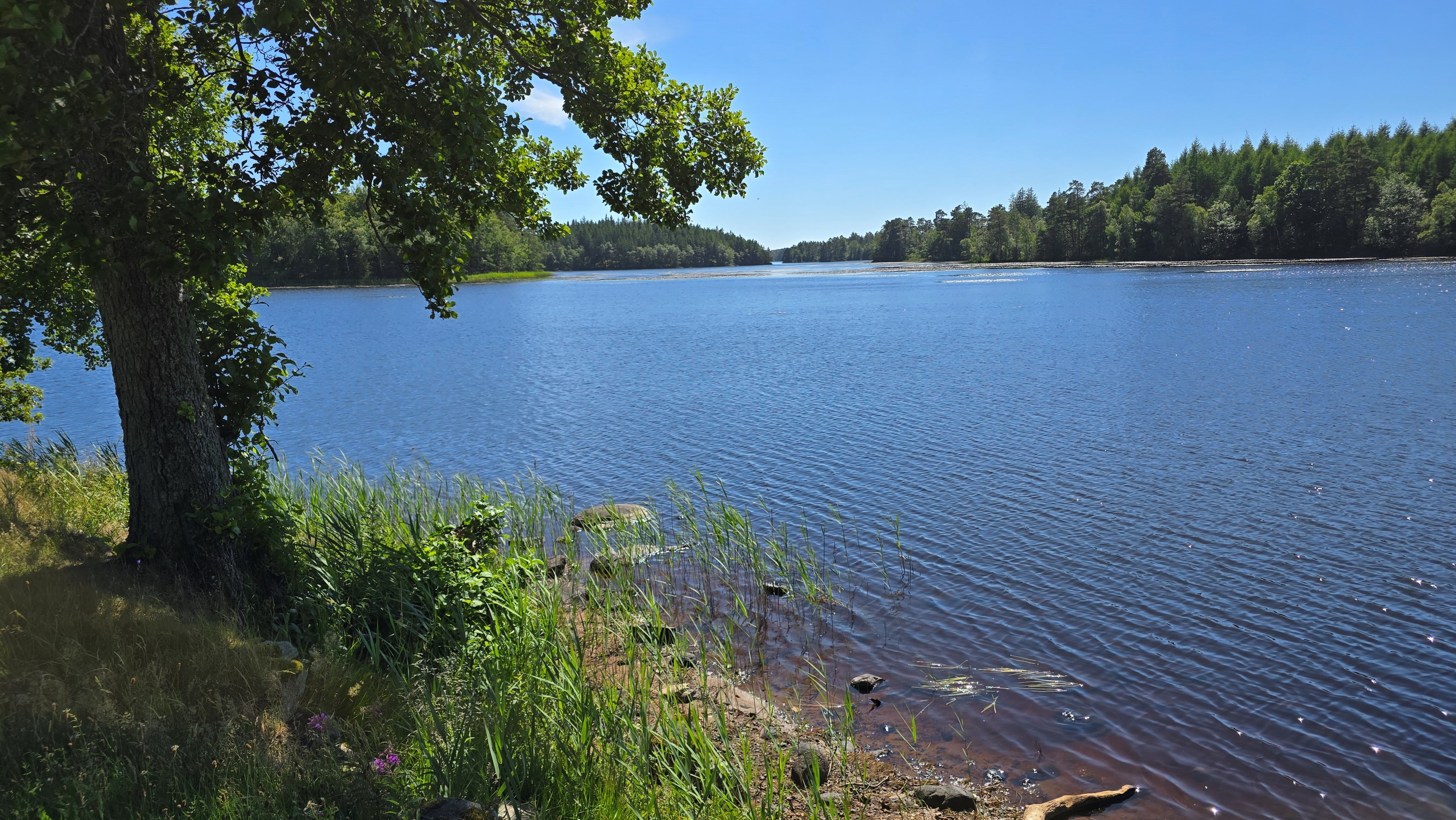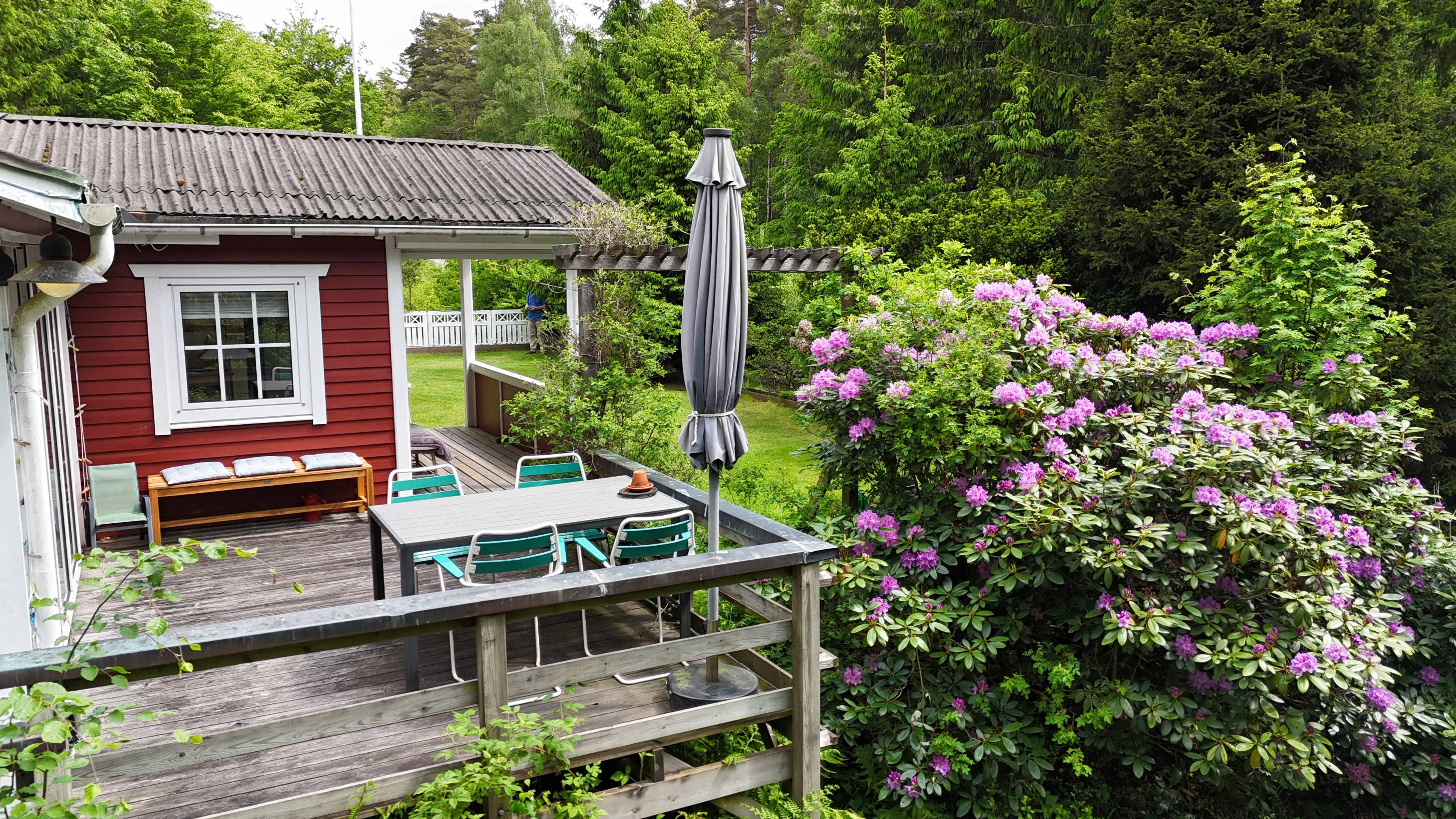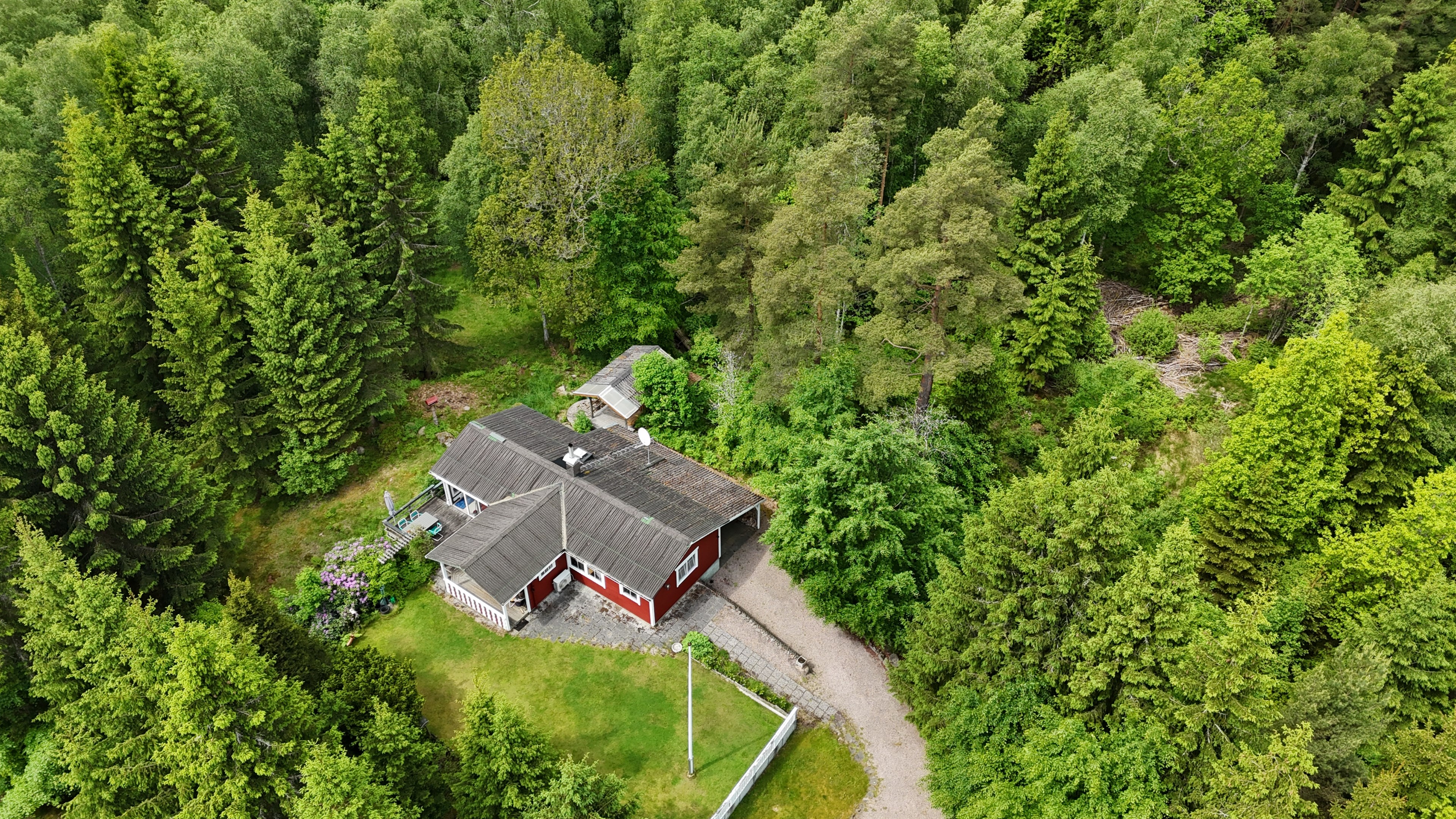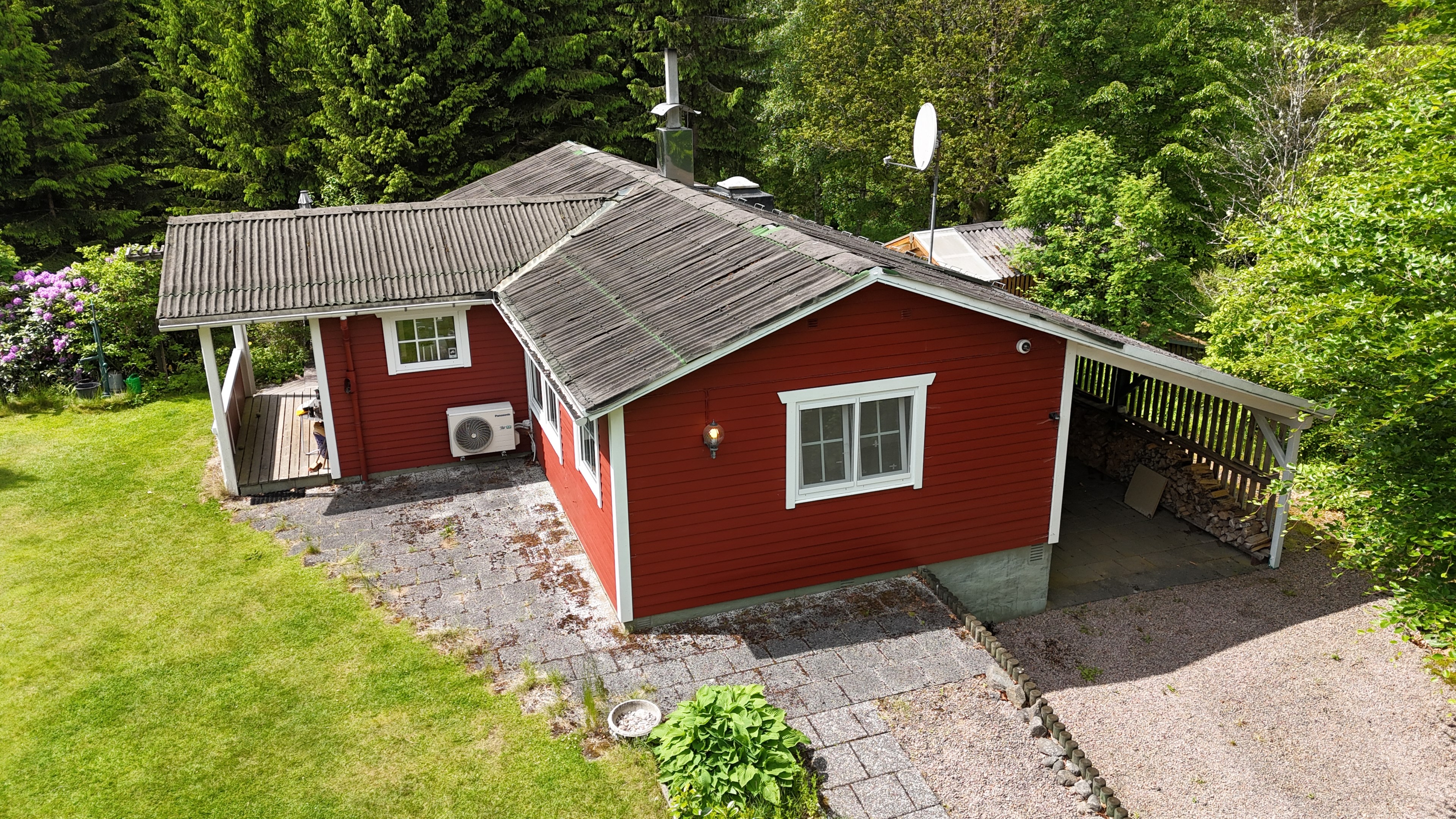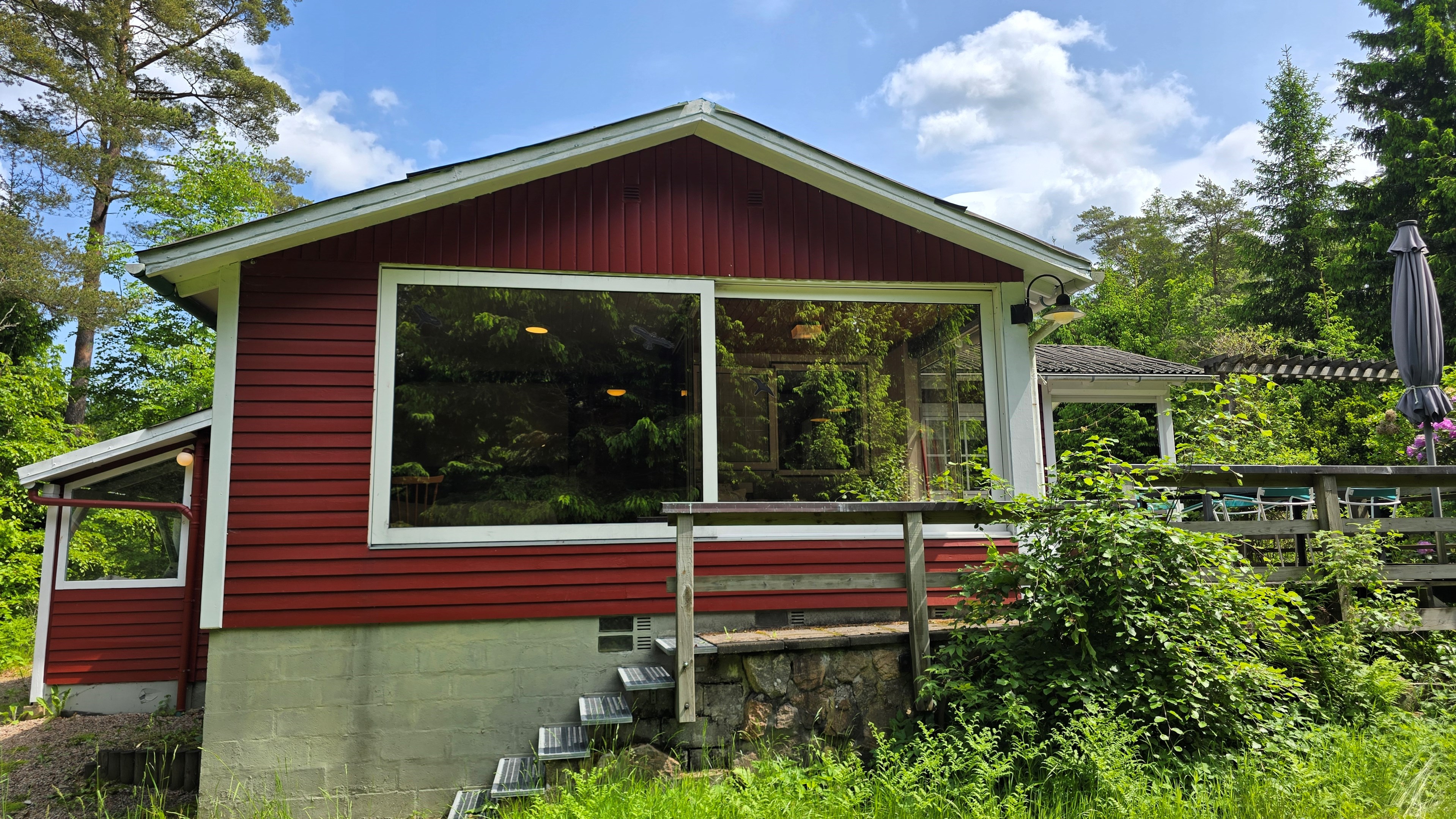 Fritidshus i gott skick på 79 m² med terrasser och uthus. 2 279 m² naturtomt, 500 m. till Smedjeån.