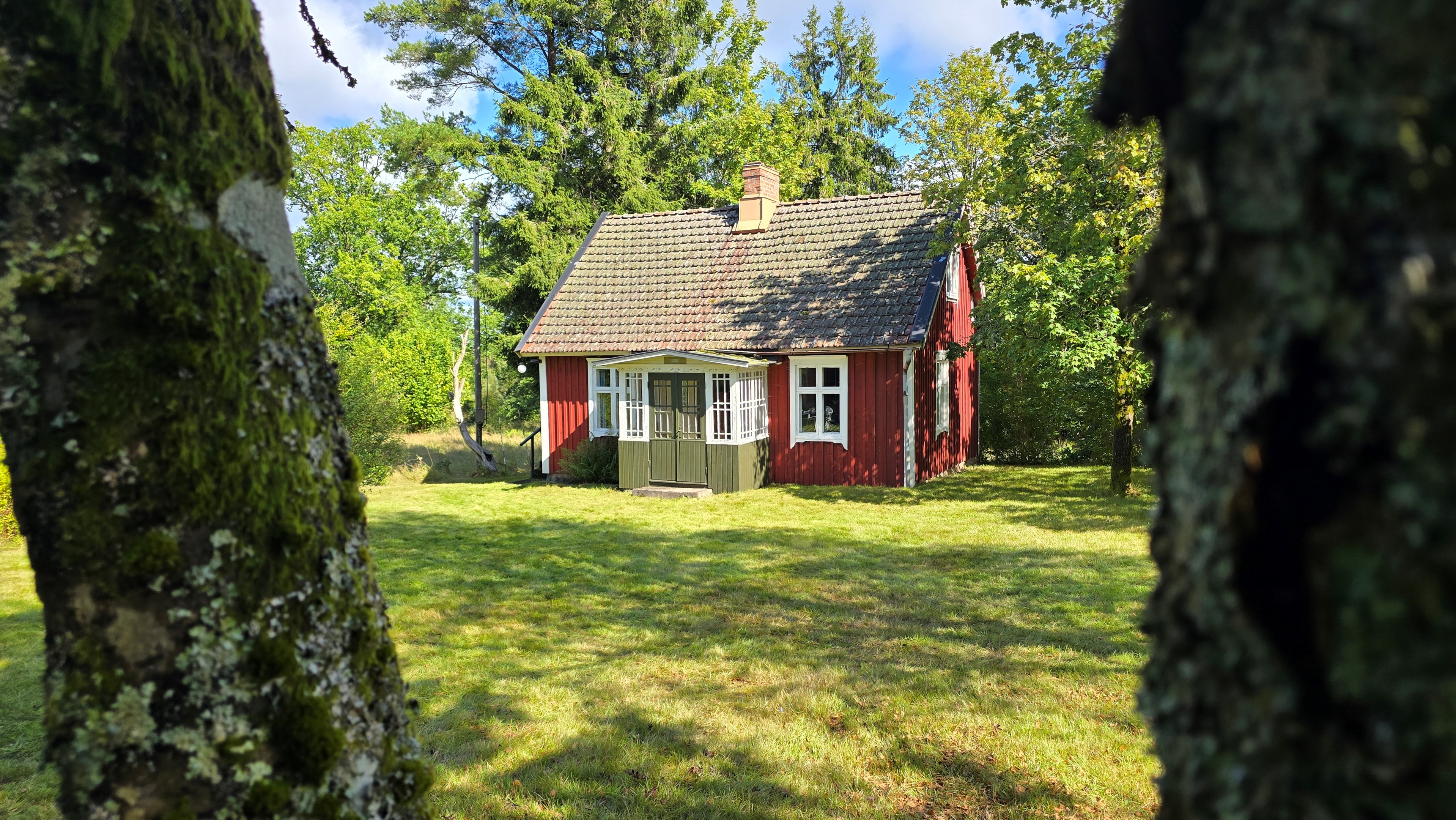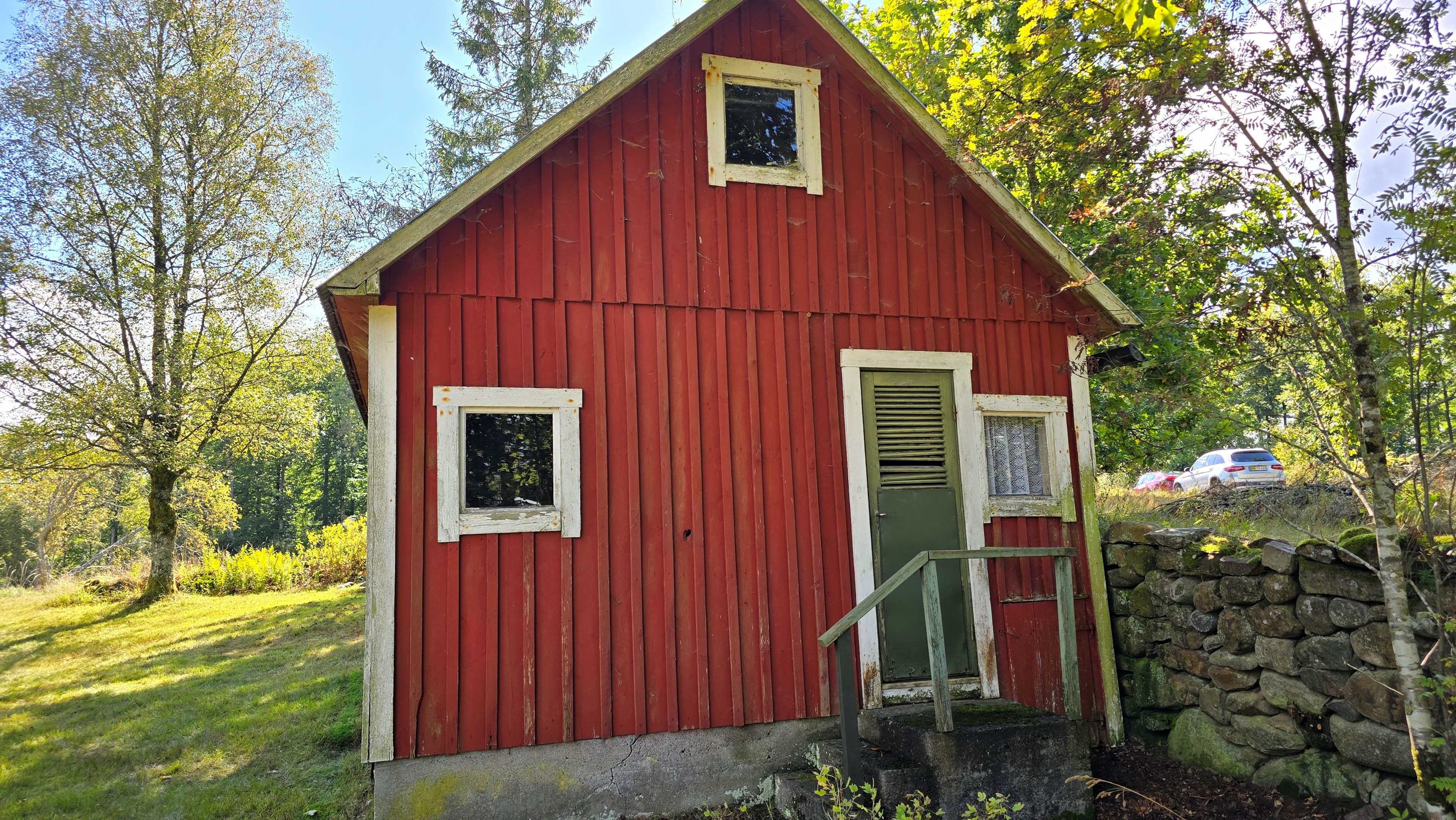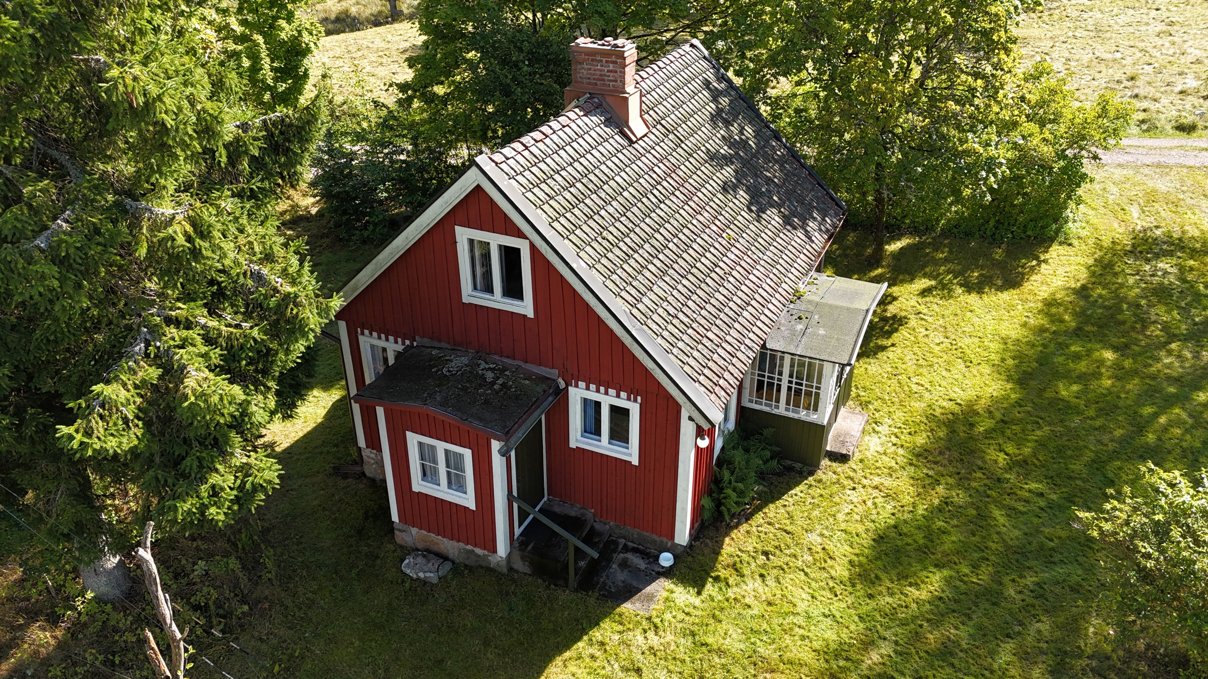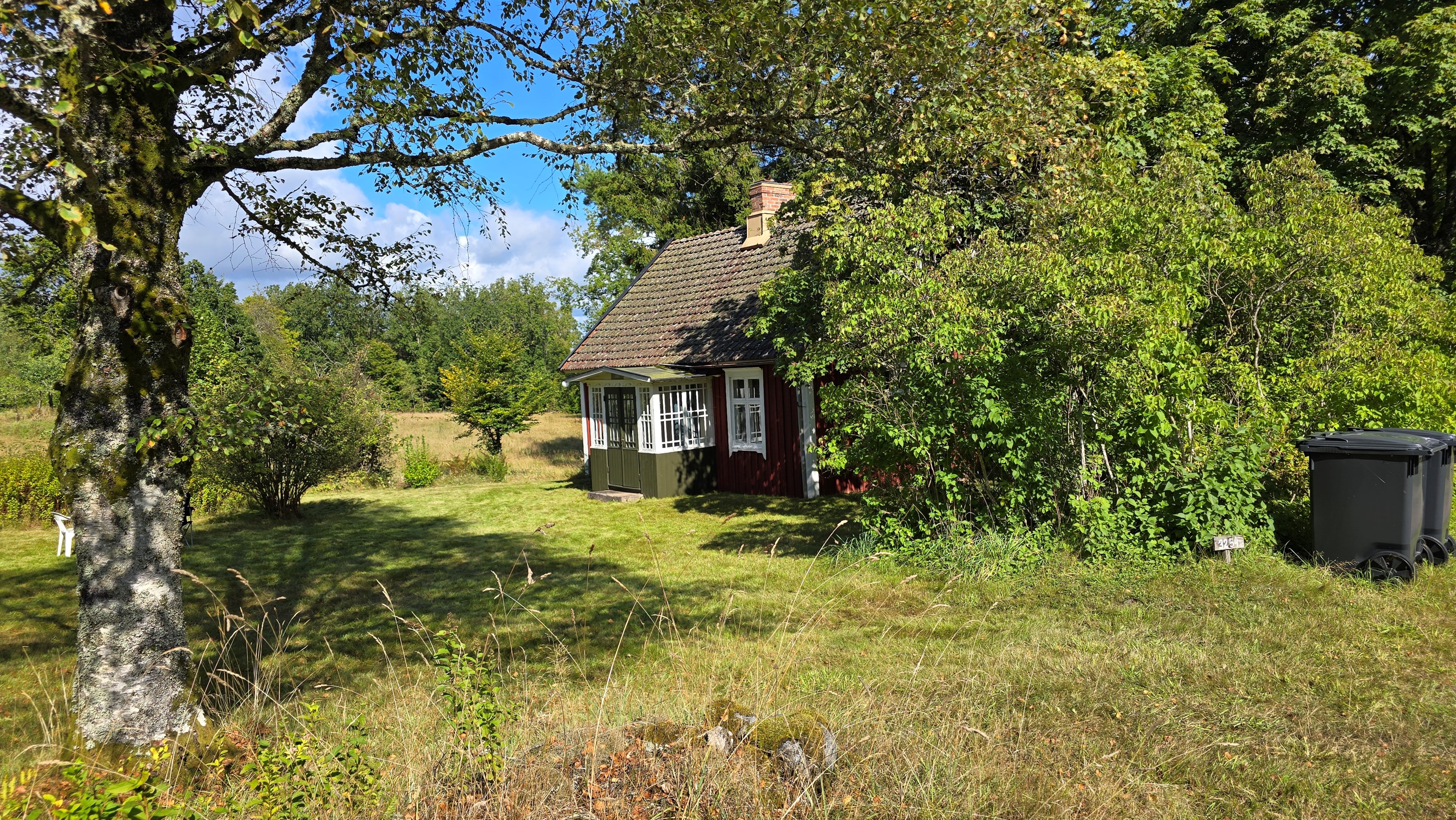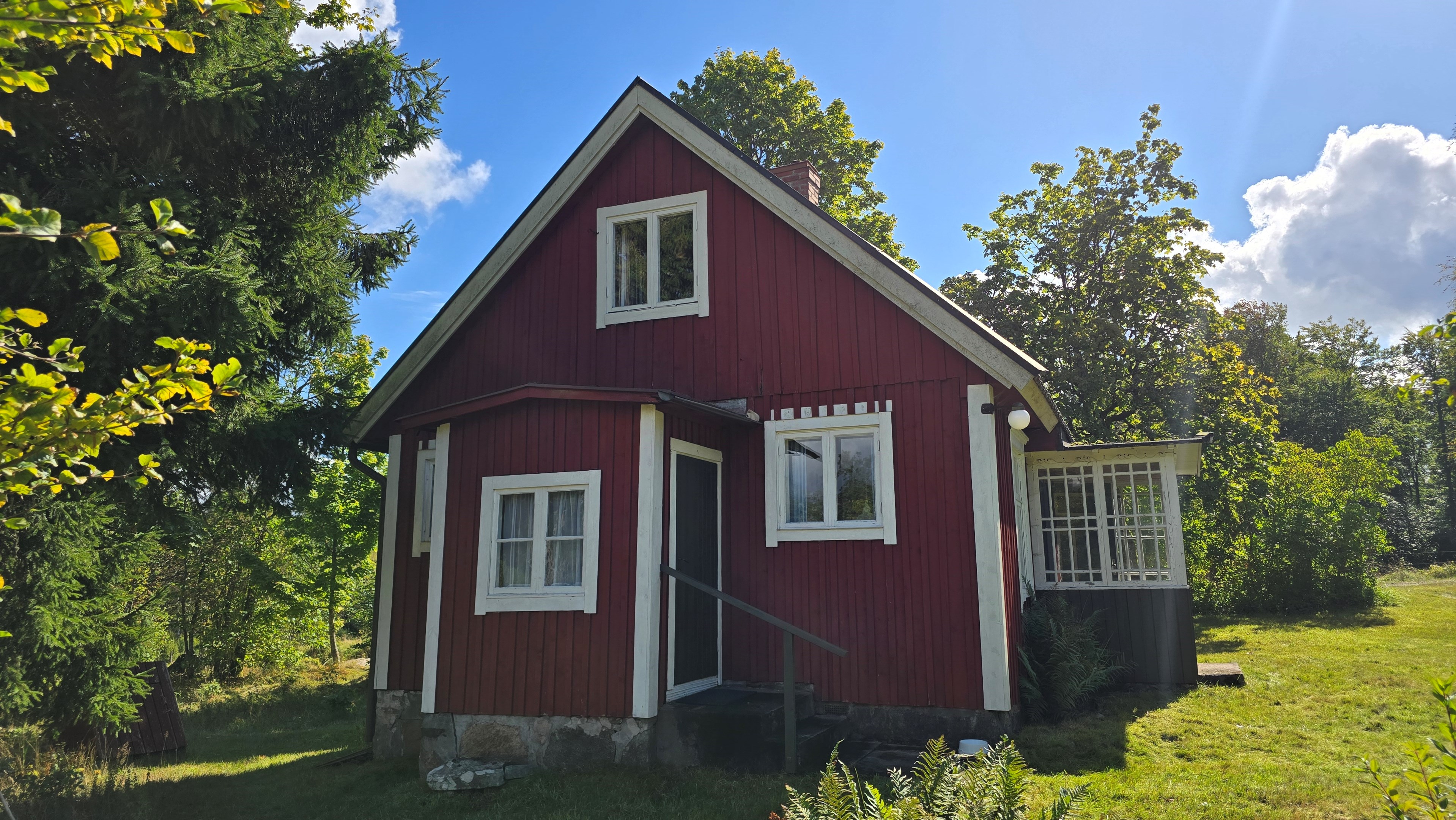 Torp från 1908 på ca 72 m2 + källare och uthus på ca 20 m2. Enkel standard, el indraget men ej vatten. Utedass. 1 545 m2 naturskön och enslig tomt, omgiven av ängar och blandad skog. 6 km till Lagan och 13 km till Össjöasön. 100 km från Helsingborg. Filmvisning: https://youtu.be/IXhzmSxTAjY Hässlehult 3254 vid Markaryd är ett mysigt torp från 1908 på ca 72 m2 boyta + ca 20 m2 i källaren där det finns gammal bakugn och vedspis (ej i bruk). Huset har varit i samma danska familjs ägo sedan 1964 och har en gång varit på framsidan av tidningen Bo Bedre. Huset är i grundläggande gott skick, men har en enkel standard utan indraget vatten eller badrum. Utedass finns i uthuset. El finns indraget med äldre installationer och det finns grävd brunn på tomten, där man hämtar vatten med spann. Brunnen kan sina på hösten och då hämtas vatten hos grannen. På taket ligger gamla tegelpannor, men undertaket har varit bytt en gång och de gamla pannorna återanvändes. Otäthet fanns förr omkring skorstenen, men detta har åtgärdats med ny plåt omkring skorstenen, så det som syns på övervåningen är endast kosmetiskt. Hängrännor saknas delvist och borde monteras. Fönster är enkelglas med innerfönster i bottenvåningen (ett par glas har sprickor) och på övervåningen är det kopplade dubbelglas från omkring 1965 när övervåningen inreddes. Värme från enstaka direktverkande element och därutöver en effektiv Jøtul braskamin i vardagsrummet (godkänd). Det finns även vedspis i köket och en braskamin på övervåningen, som inte är i bruk, ut över vedspisen och bakugnen i källaren, som heller inte är i bruk. Huset består av köksingång i tillbyggnad med plastmatta på golvet, pärlspont på väggarna, plank i taket och säkringsskåp. Rymligt kök med linoleum på golvet (trä under), mjuk masonit i taket (trä bakom), matplats, skåp och emaljerad vedspis. Liten hall med trappa till övervåningen och lucka i golvet till källaren. Ytterligare köksrum med plastmatta på golvet, diskbänk (ej vatten, avlopp till skogen eller enkel stenkista), elspis med två plattor, kyl/frys och inbyggda skåp. I detta rum kunde man ev. inreda badrum i framtiden, om man önskar. Vardagsrum med trägolv, mjuk masonit i taket, bäddsoffa, Jøtul braskamin och utgång till trädgården via den mysiga glasverandan. Sovrum med trägolv och våningssäng. På övervåningen finns ett stort rum, som delas i två sektionen av skorstenen. Trägolv och träpanel på väggar och tak. I sektionen närmast trappan finns dubbelsäng, garderob och en emaljerad Husqvarna braskamin (ej i bruk). I den andra sektionen finns det fyra platsbyggda enkelsängar längs med väggarna. De flesta möbler och annat lösöre kan köpas till eller medfölja, enl. önskemål och avtal med säljarna. Ut över huset finns ett uthus på ca. 20 m2 + vind till lagring. Uthuset har bra plåttak och ett rum till vedlager, ett rum till lagring av redskap och maskiner och ett trippel utedass. 1 545 m2 (friköpt) trädgård och naturtomt, omgiven av gräsängar och blandad skog, med fina stengärdsgårdar i tomtgränsen och inne på tomten. Vacker utsikt över ängarna och vägen hit är en liten otrafikerad grusväg, som slutar en kort bit förbi huset, där det enda grannhuset ligger. Grannhuset är inte bebott, utan ägs av de som äger den stora gården i området. Huset sköts och gräset klipps, men används i övrigt sparsamt på helgerna och är inte störande på något vis. Ca. 1,5 km. från huset till Vänneån med goda fiskemöjligheter och ca. 6 km. till den stora ån Lagan. Ca. 12 km. till Knäred samhälle med affärer och utomhusbadet Flammabadet samt Prästaskogens naturreservat med vandringsleder och Kvarnfallet i Krokån. Ca. 13 km. till fin barnvänlig badplats i Össjöasjön. Ca. 17 km. till Markaryd samhälle och ca. 20 km. till Skogaby golfklubb. Ca. 23 km. till Mästocka Ljunghed naturreservat och ännu en fin badplats i Björsjön. Ca. 35 km. till Vallåsen Bike-Park och skidbacke på Hallandsås och till Kungsbygget Äventyrspark med zipline och rodelbana sommartid. Ca. 38 km. till havet och Mellbystrand. Ca. 100 km. från Helsingborg och ca. 155 km. från Malmö.