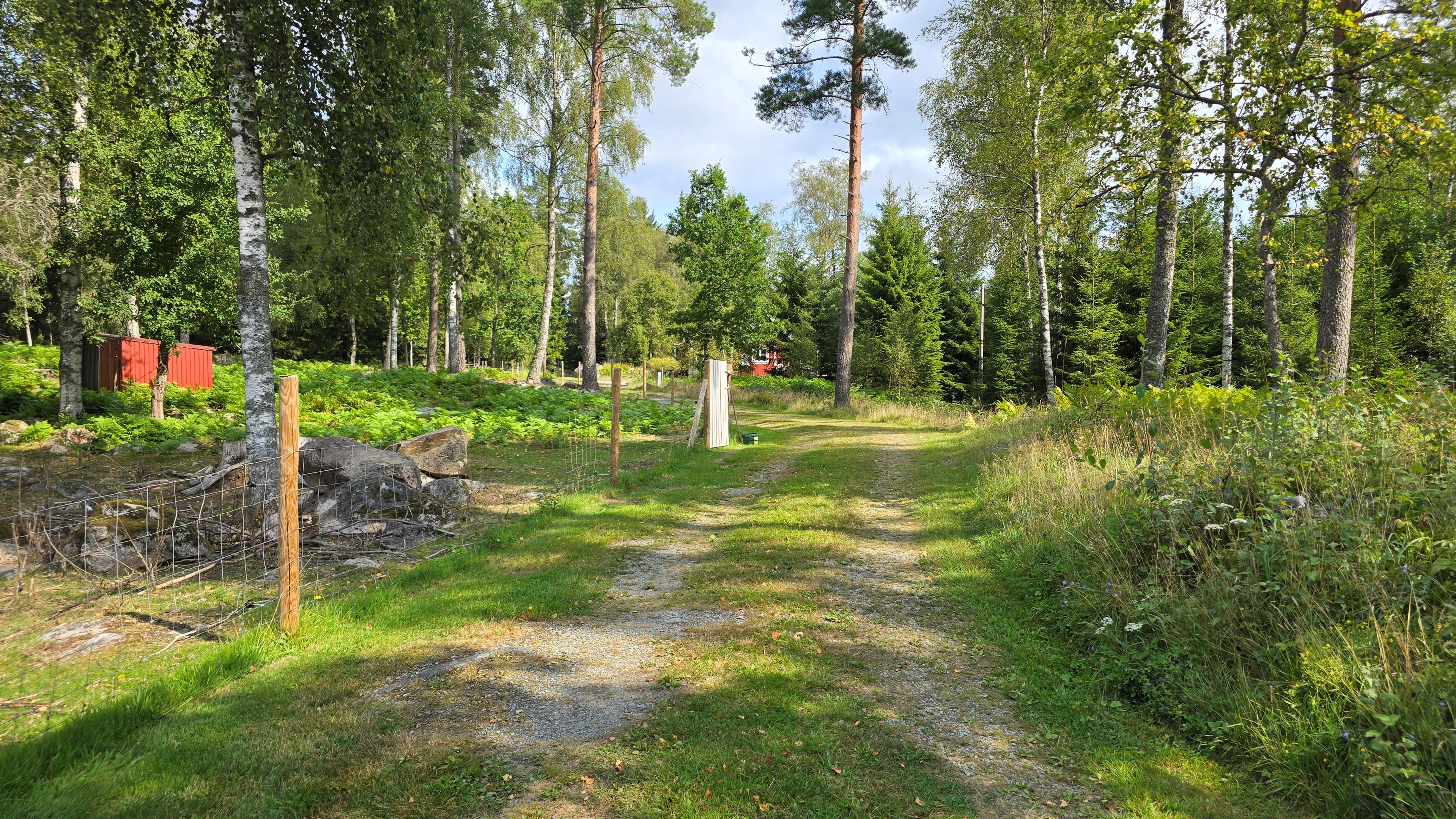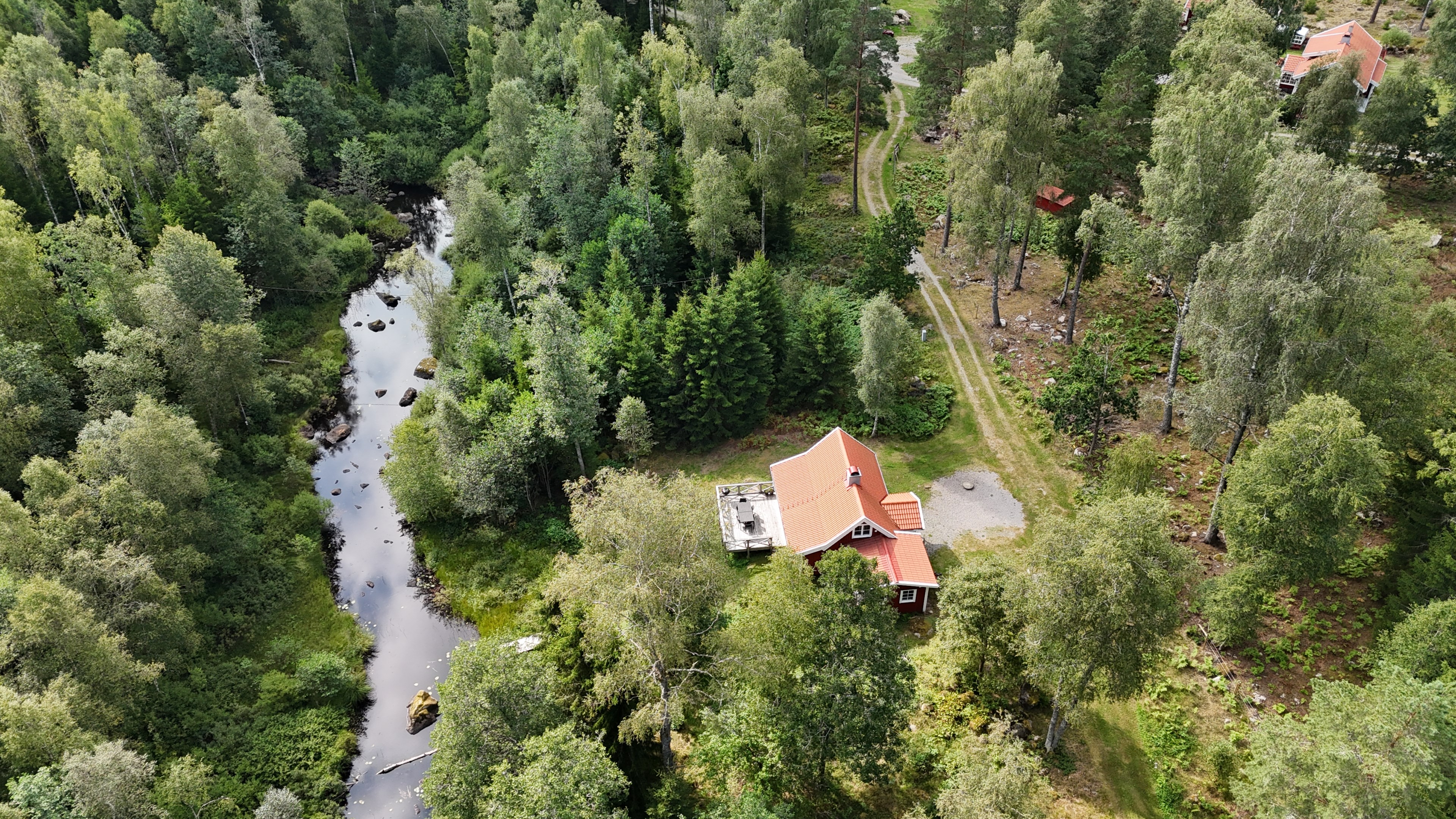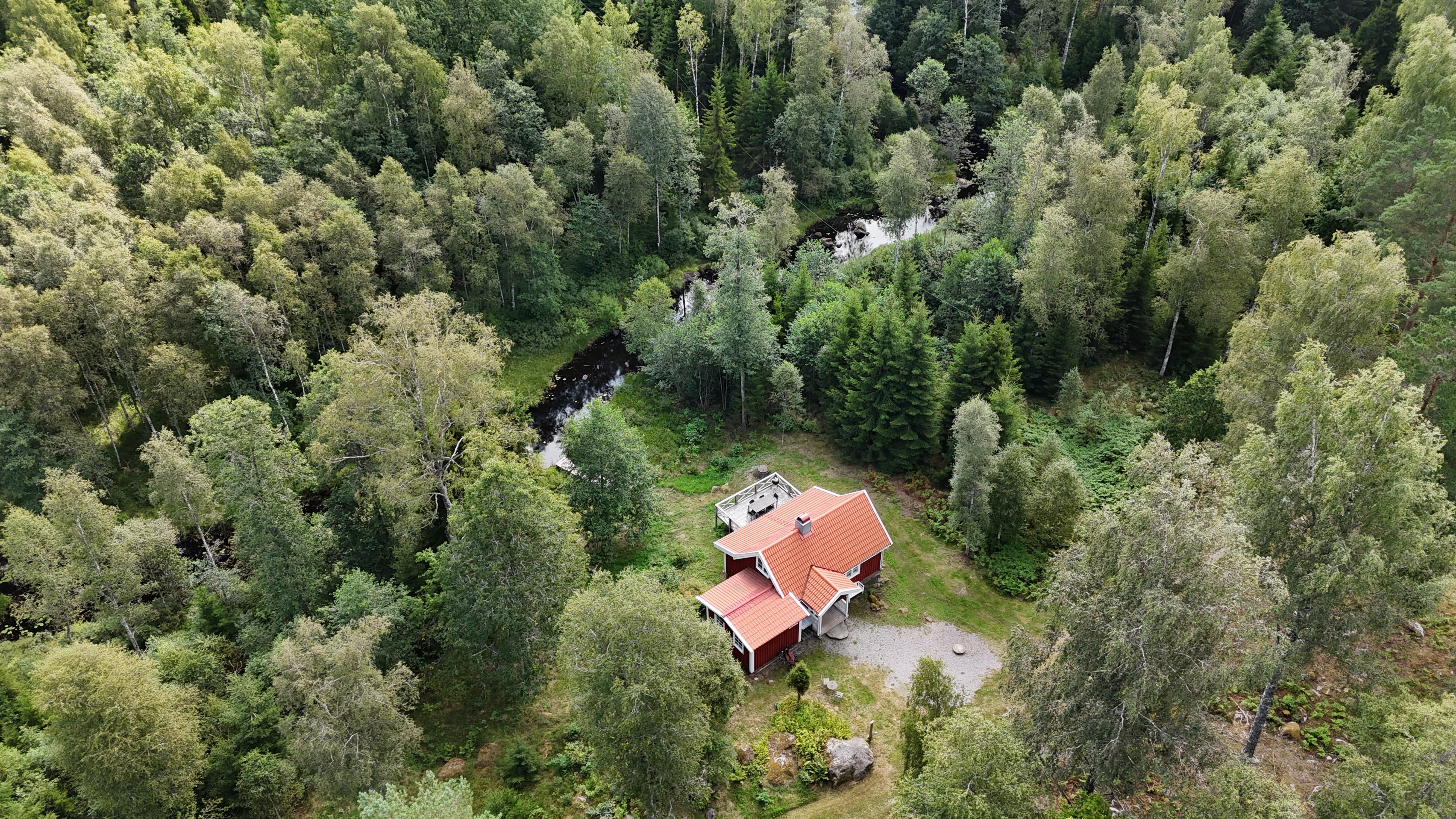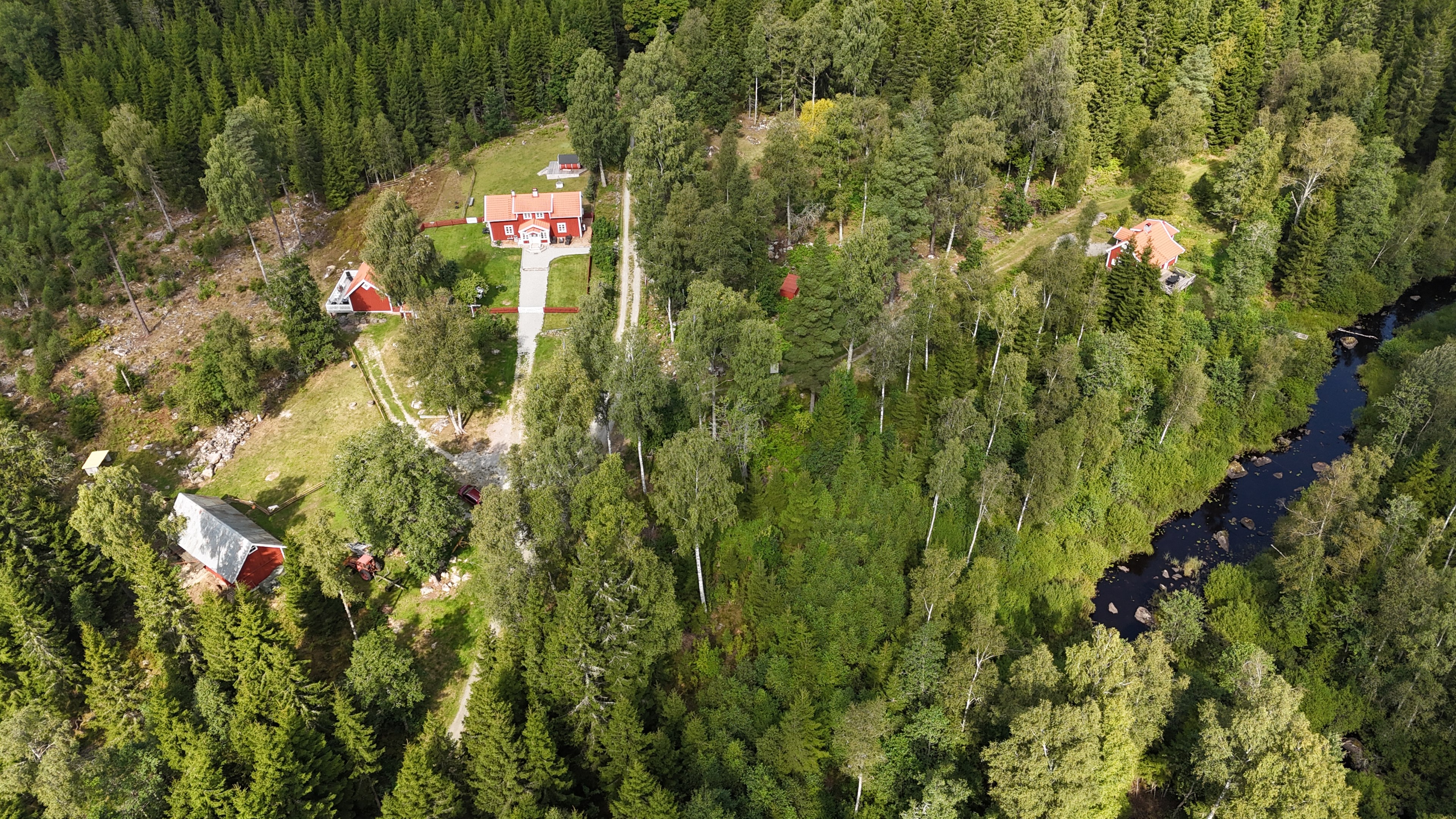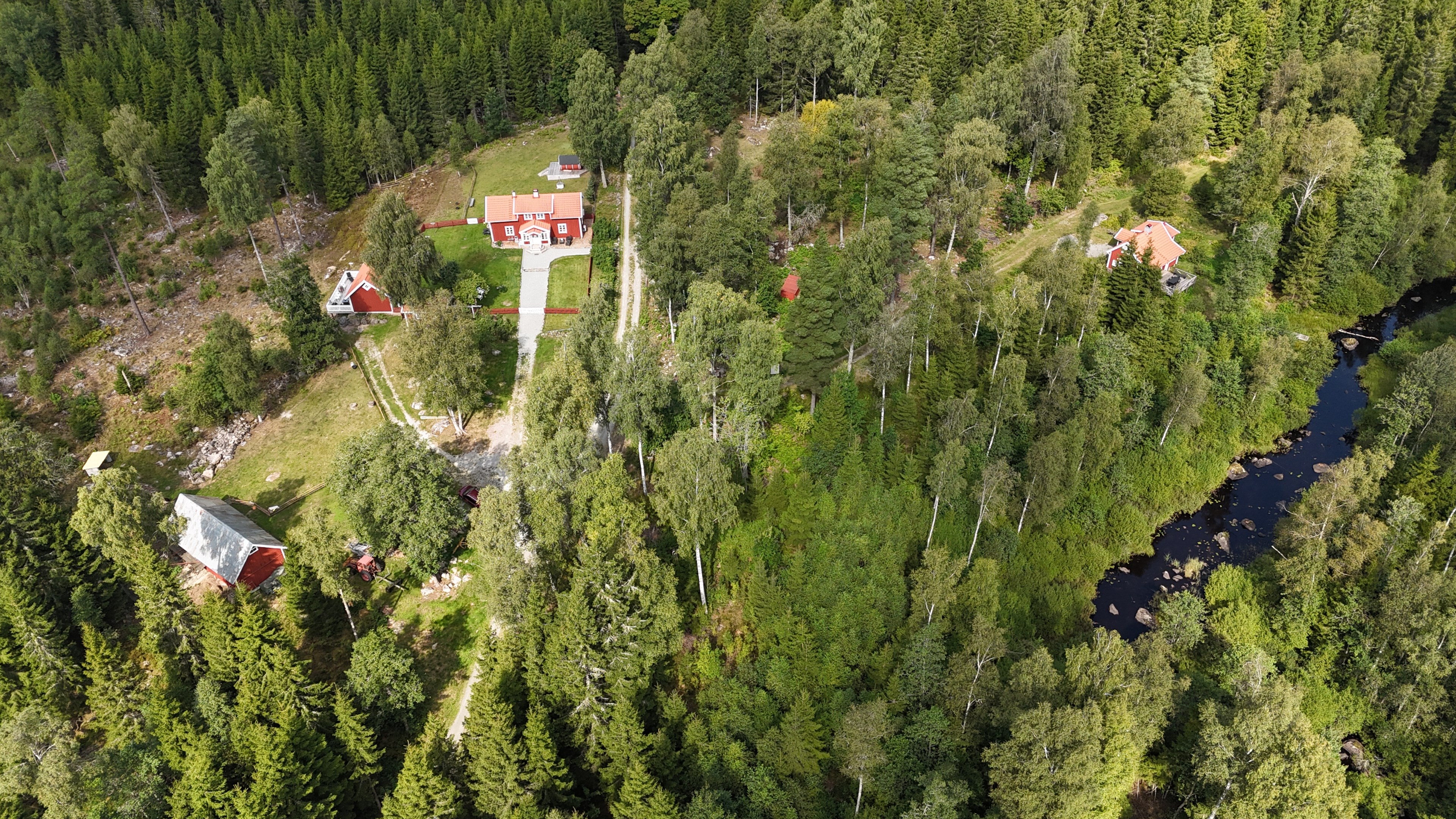 Skogsgård på ca. 5,6 ha med två bostadshus, undantag, lada, ensligt läge och genomlöpes av Bodaån.