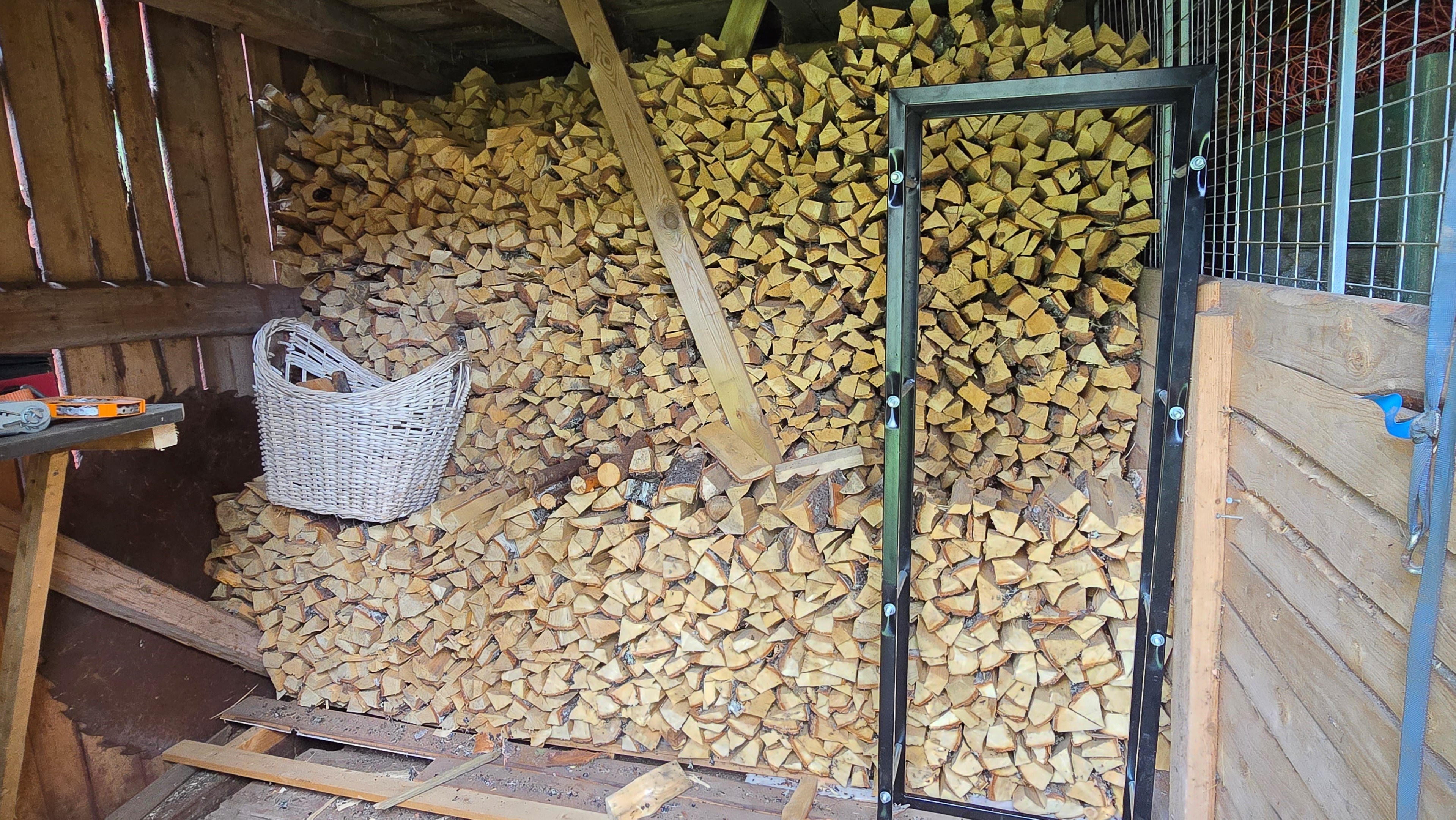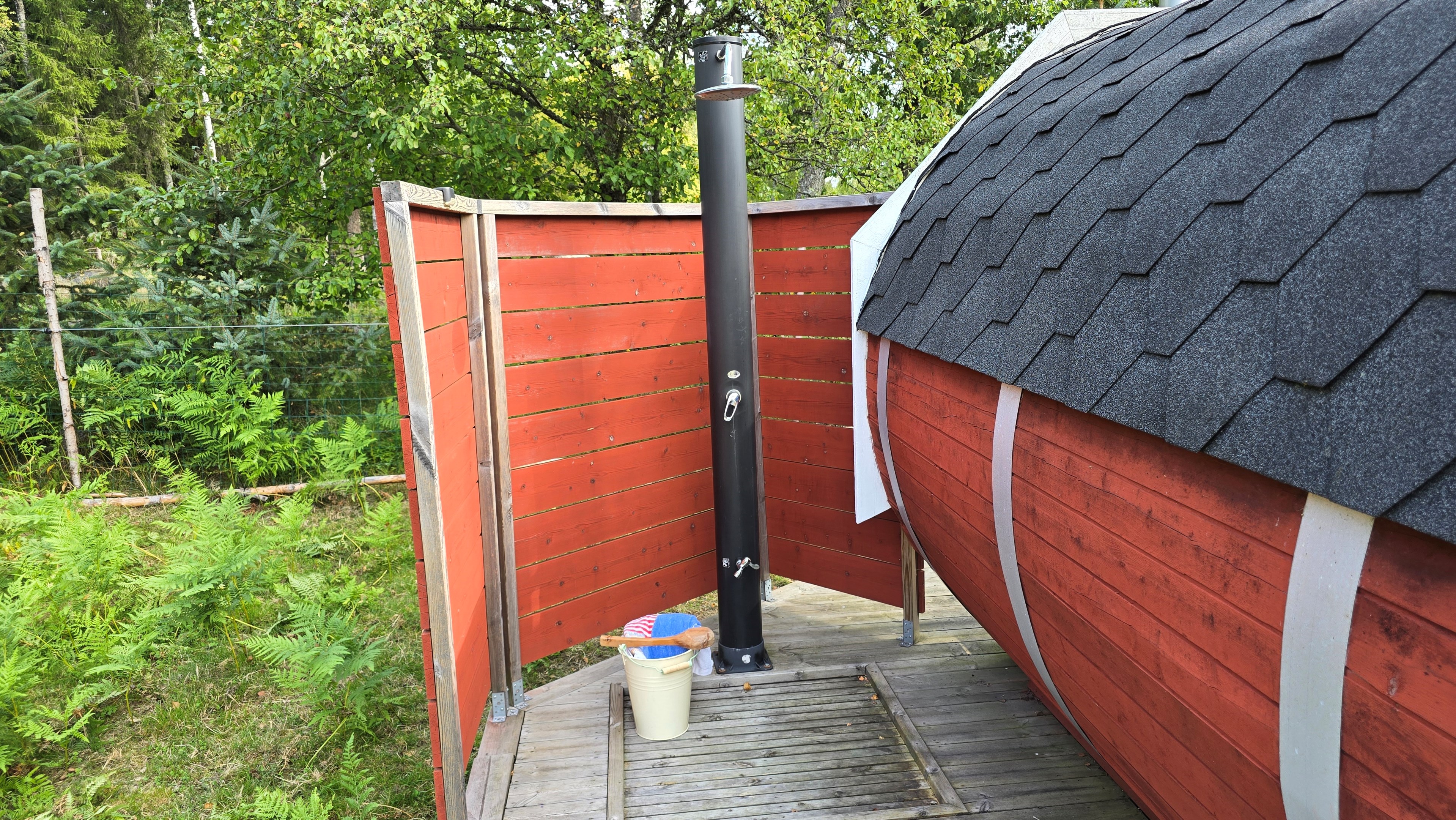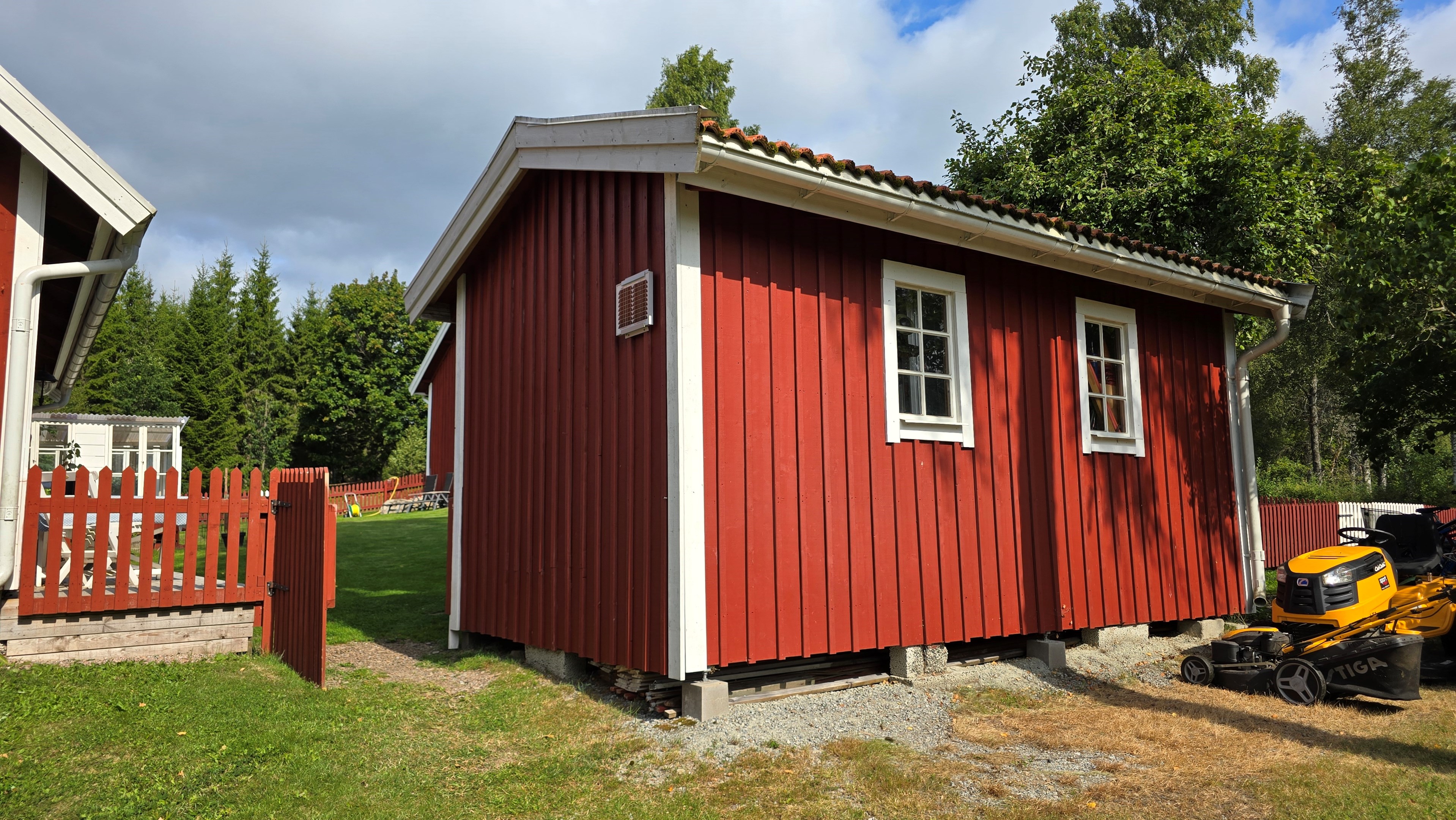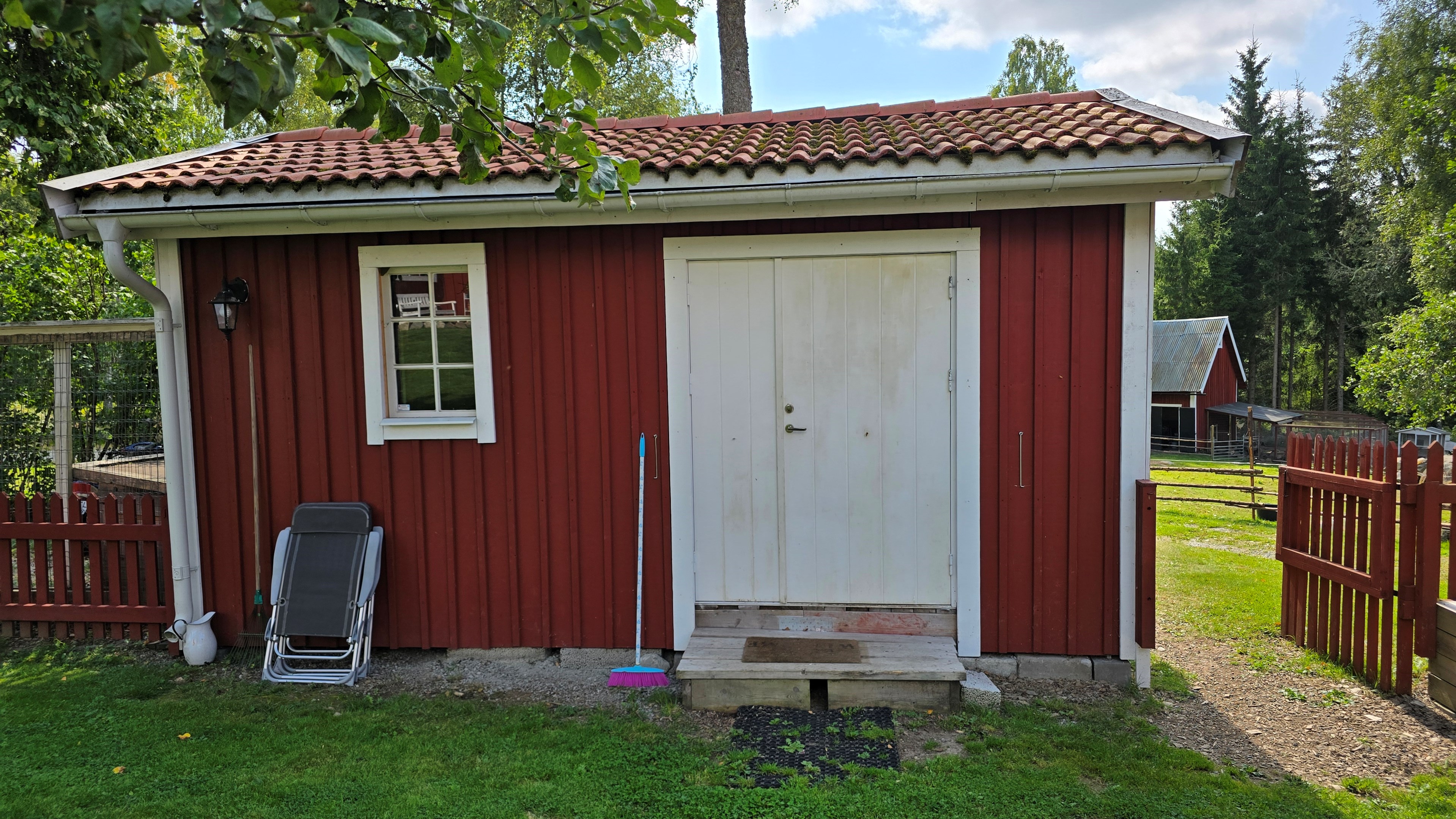 Nybyggt (2019) uthus på ca. 12 m2 med plats för ved och redskap.