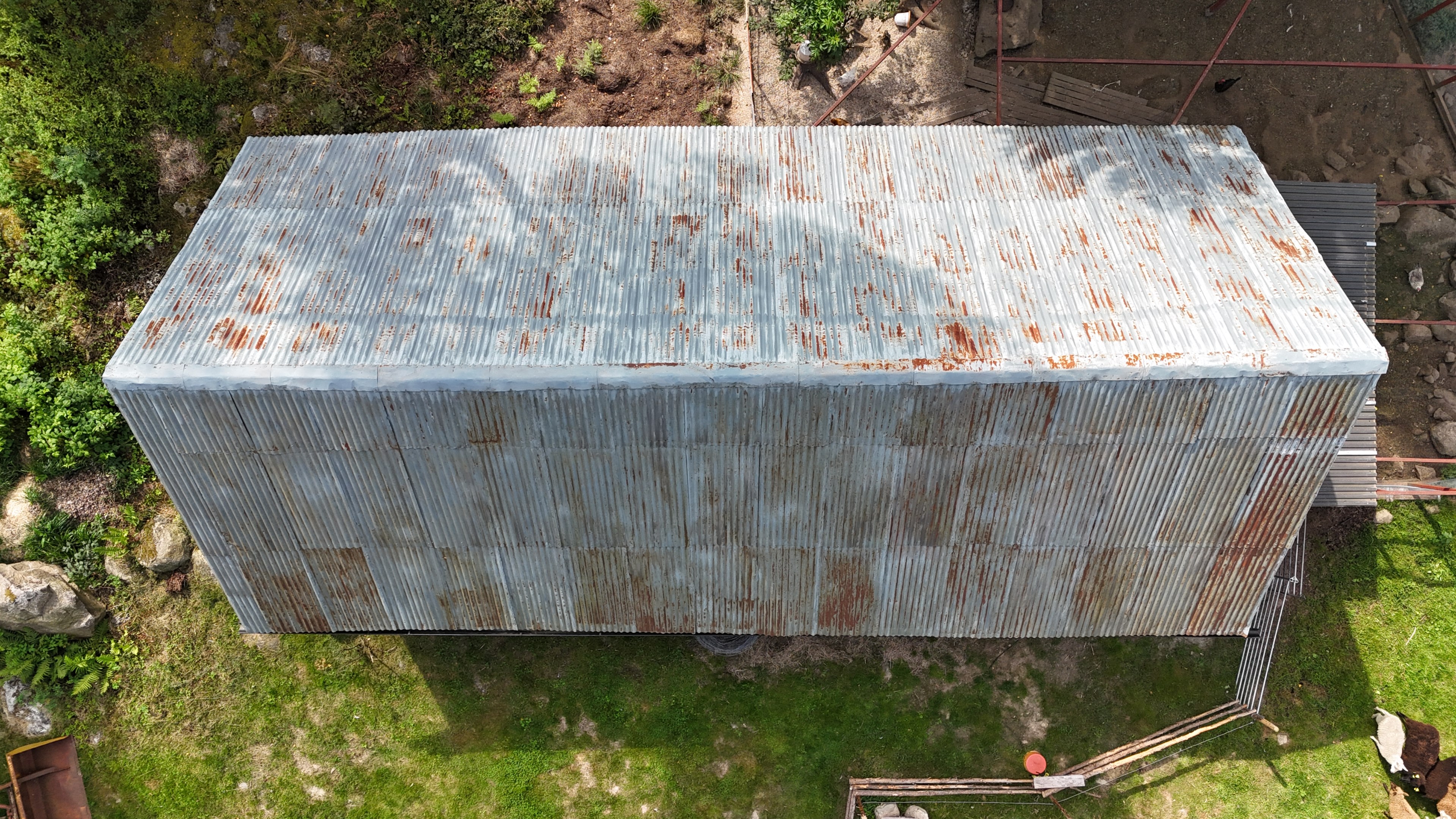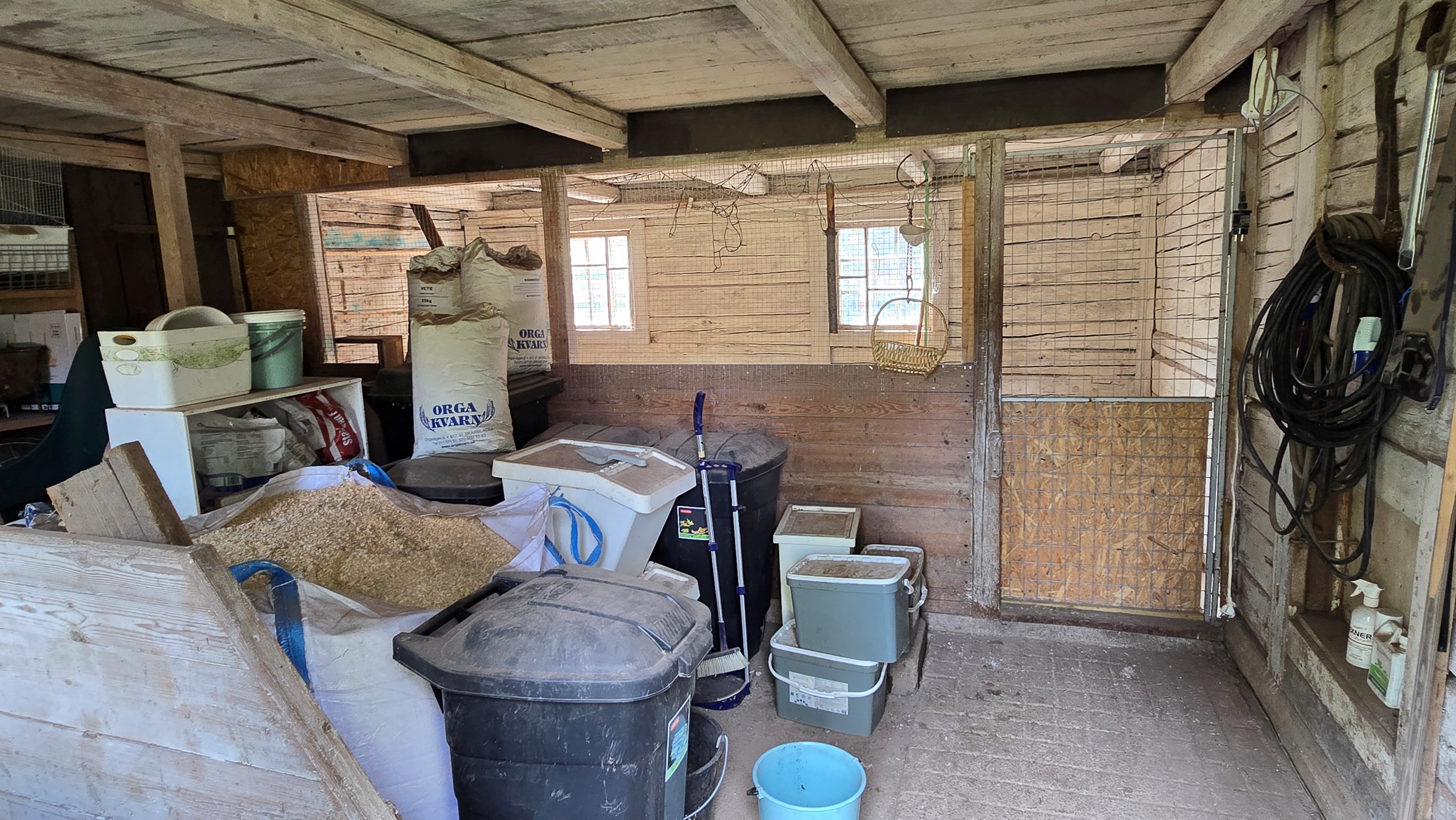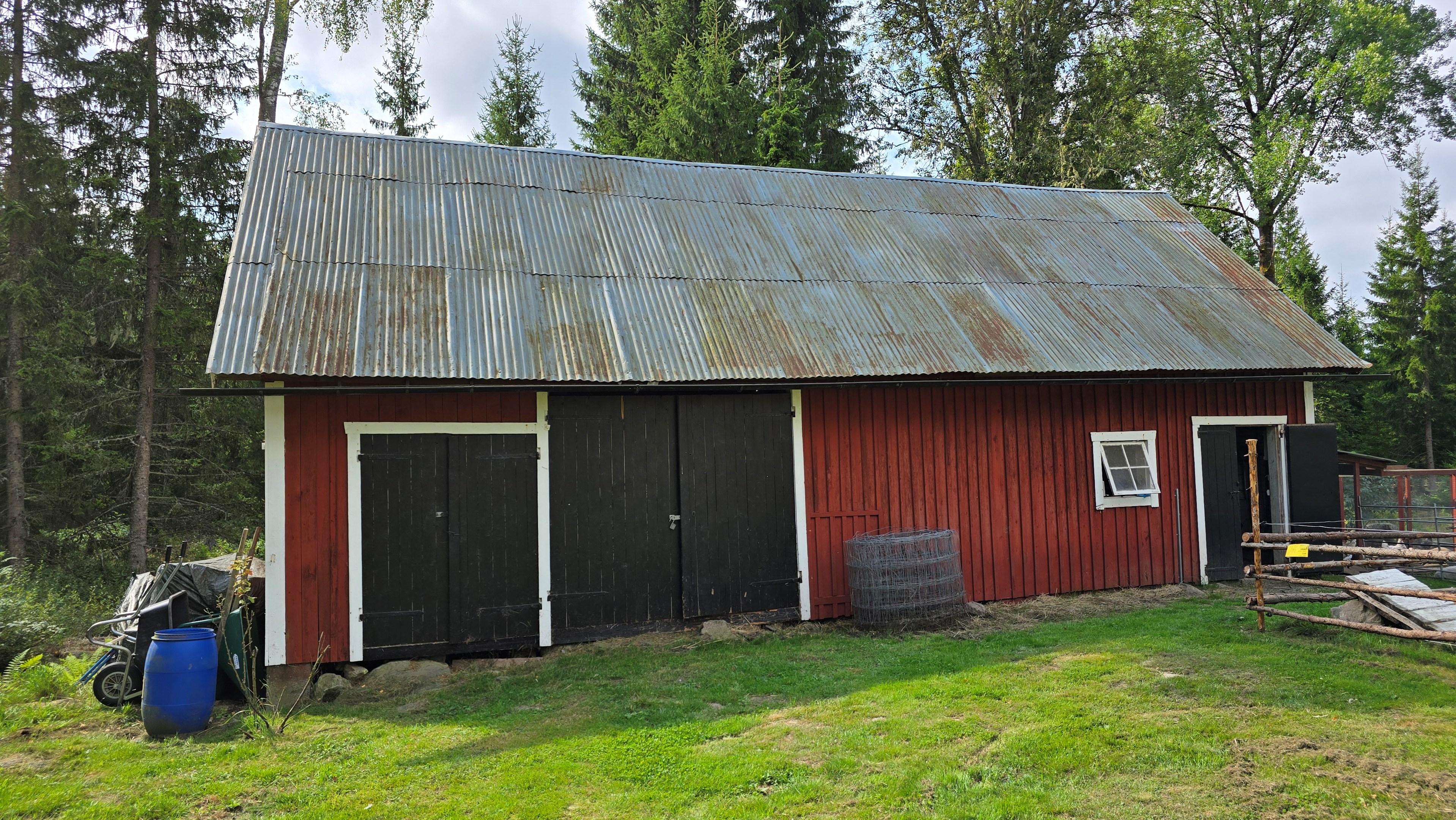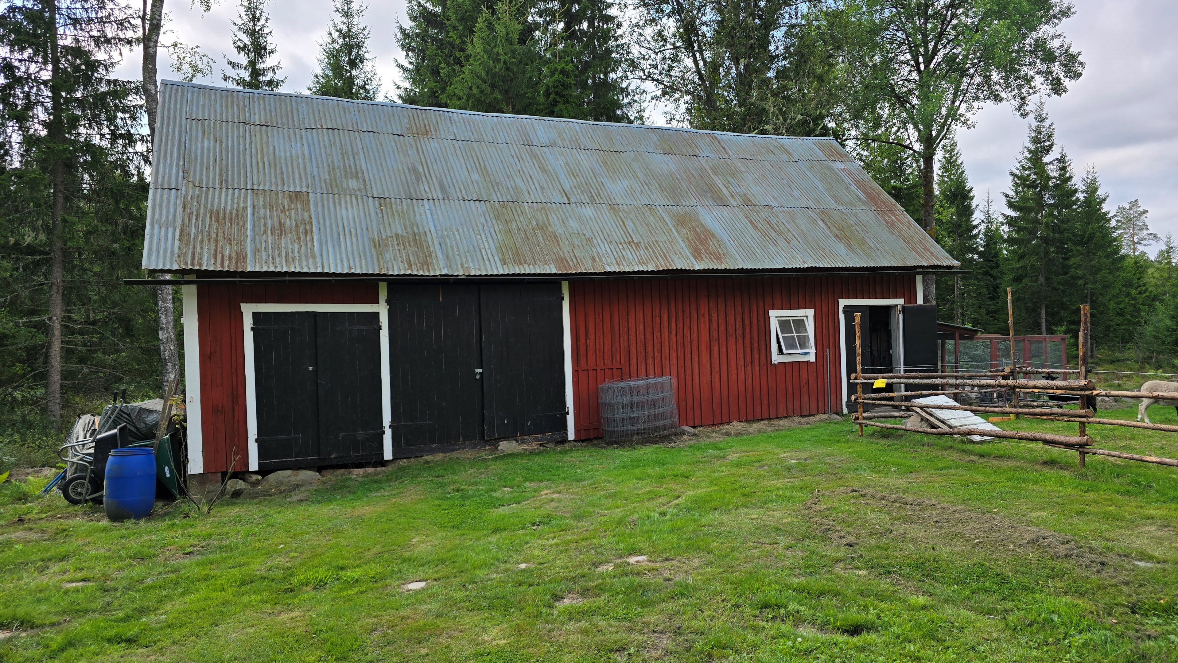 Ladugård på ca. 75 m2 med plåttak, litet fårstall med synliga timmerväggar, garage och gott om plats för ved och lagring. Tillbyggd hönsgård. -