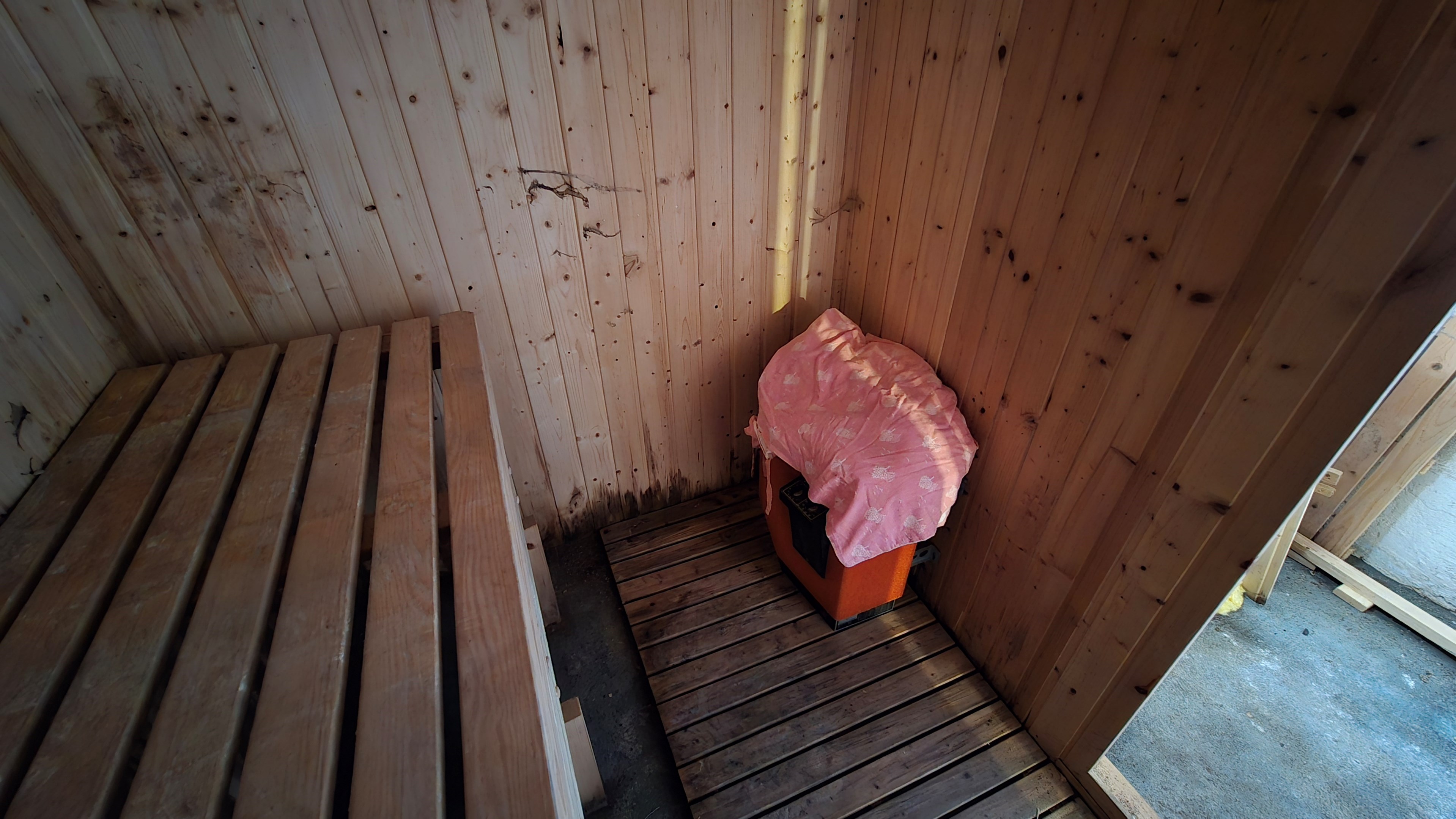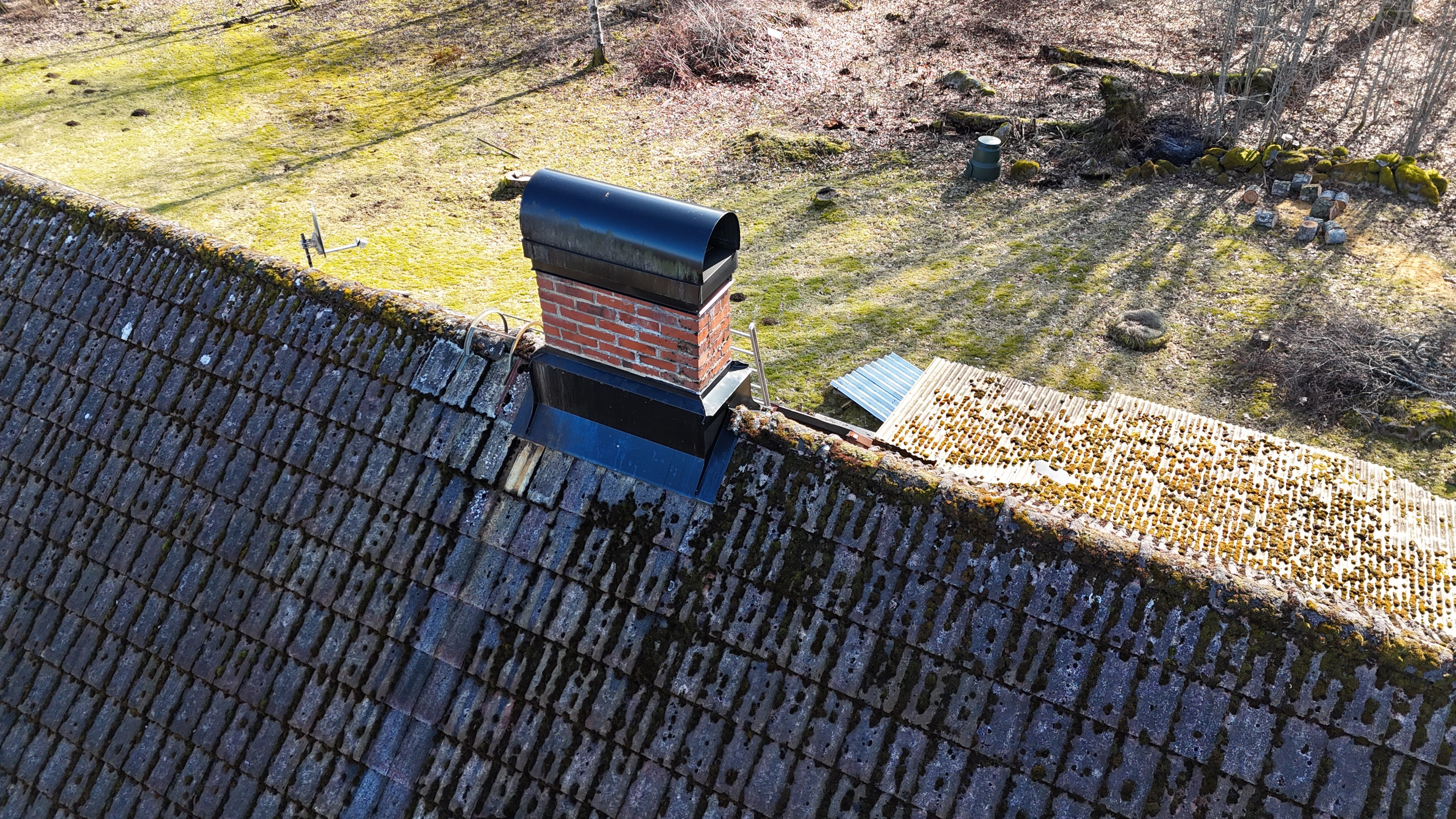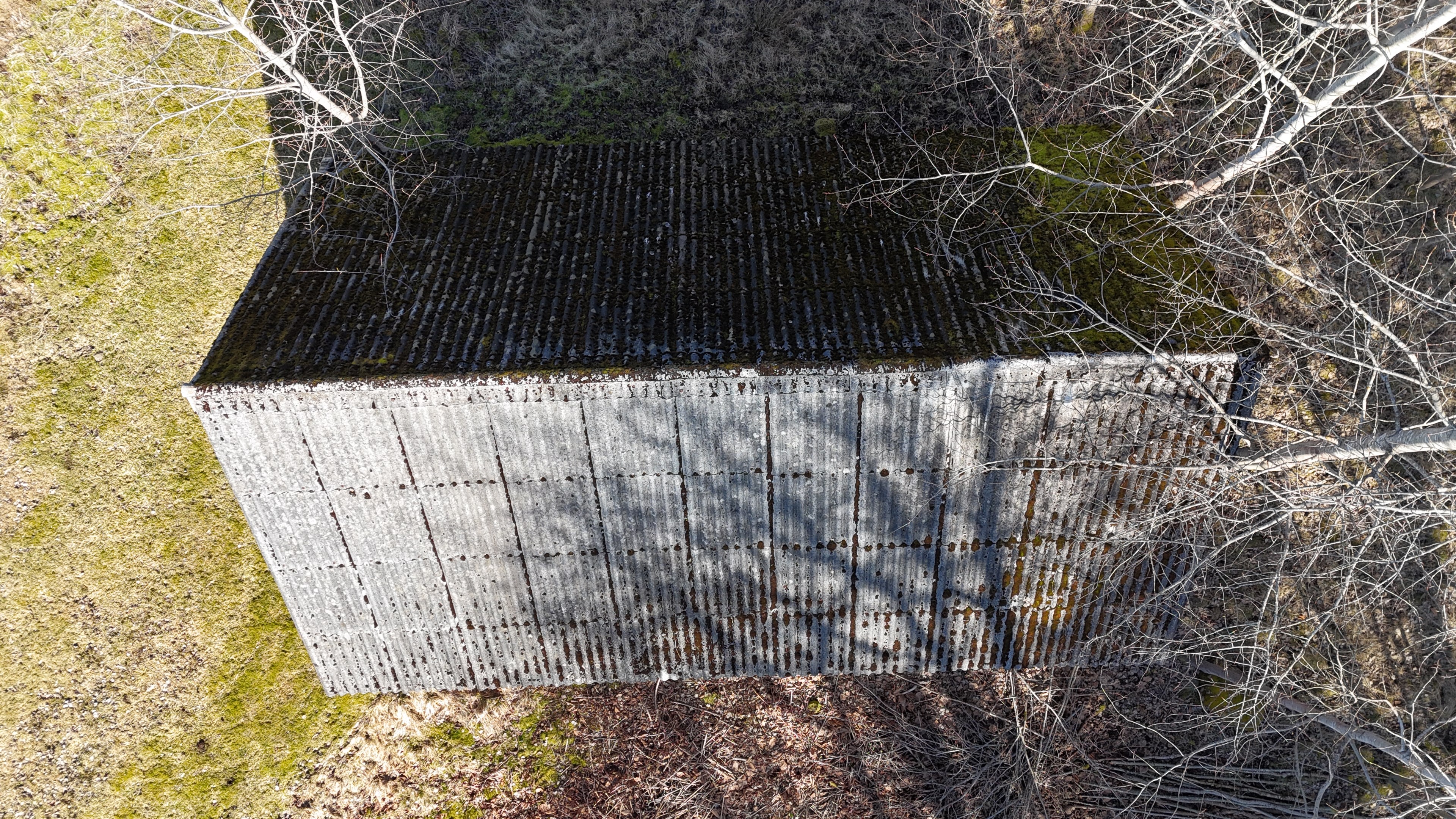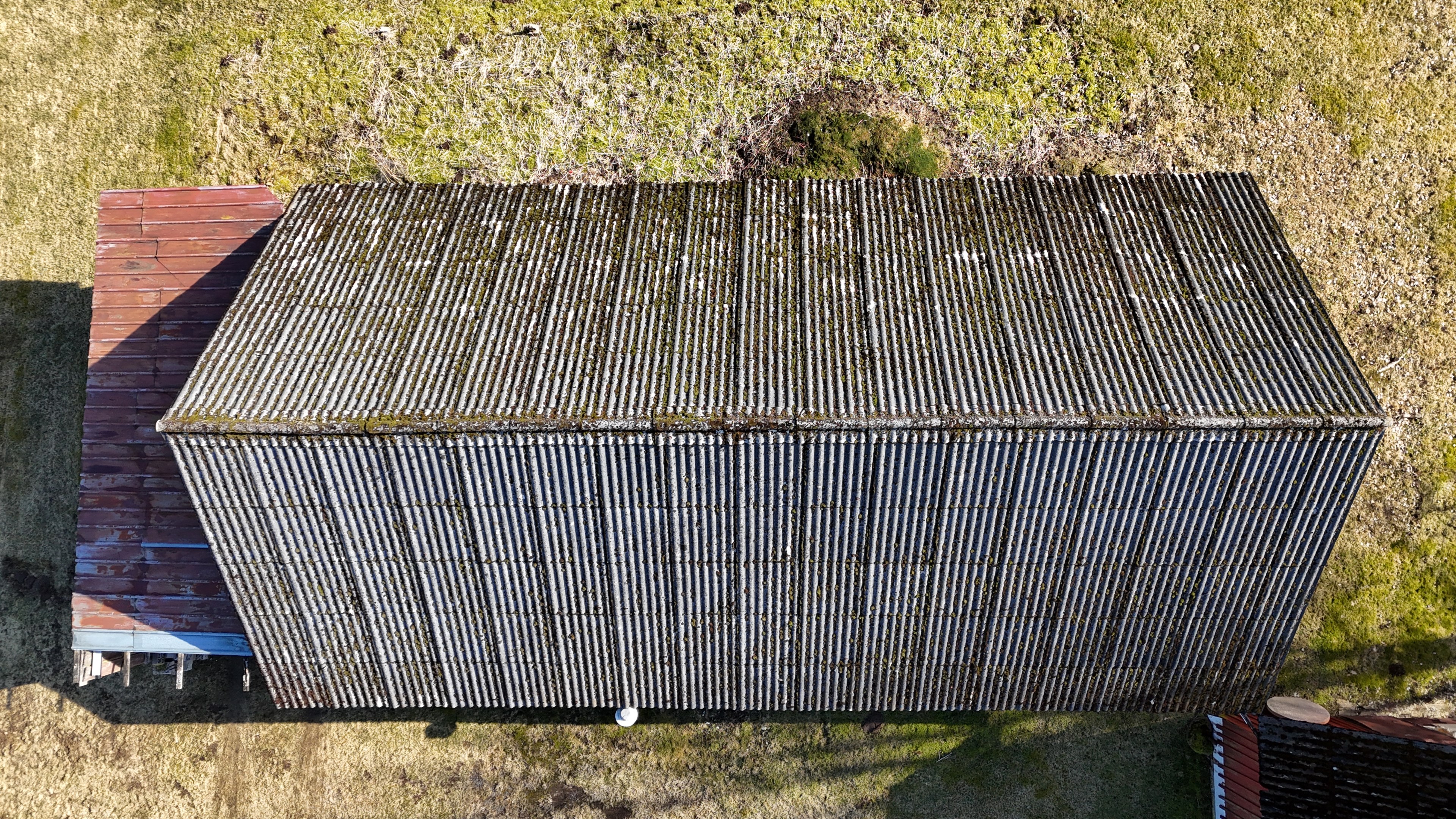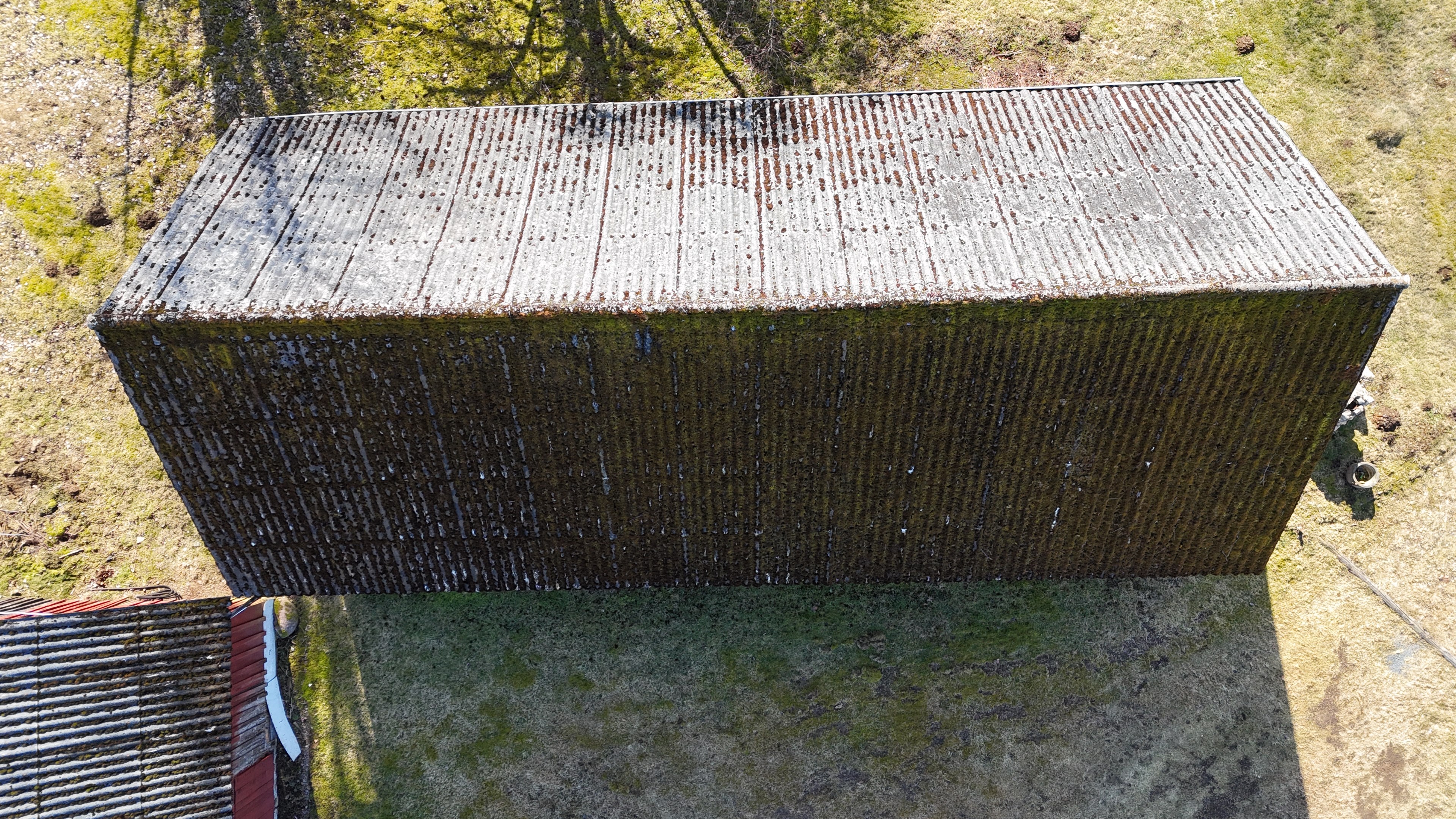 Mindre uthus med eternittak på ca 30 m² med plats för ved och förvaring.