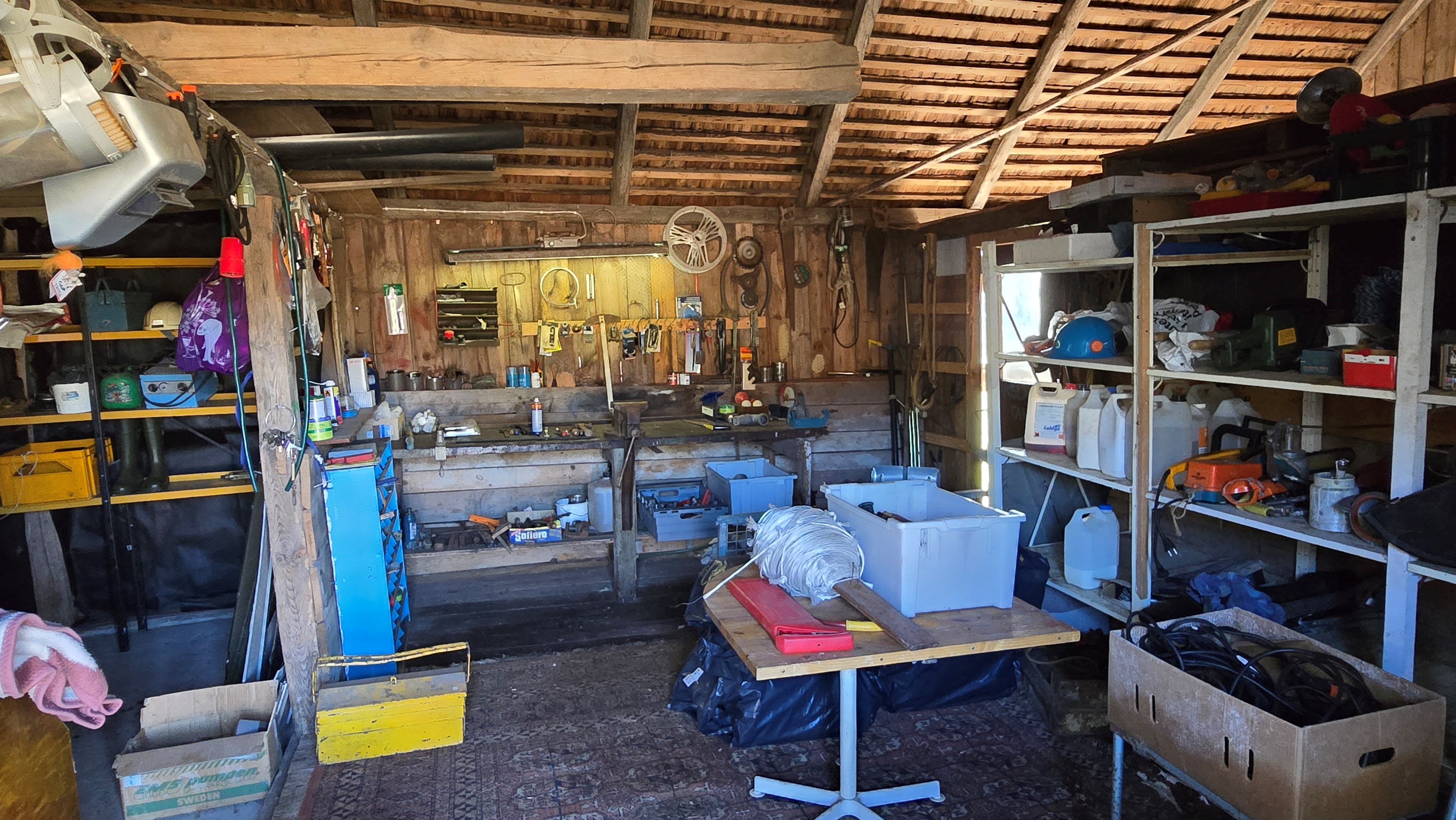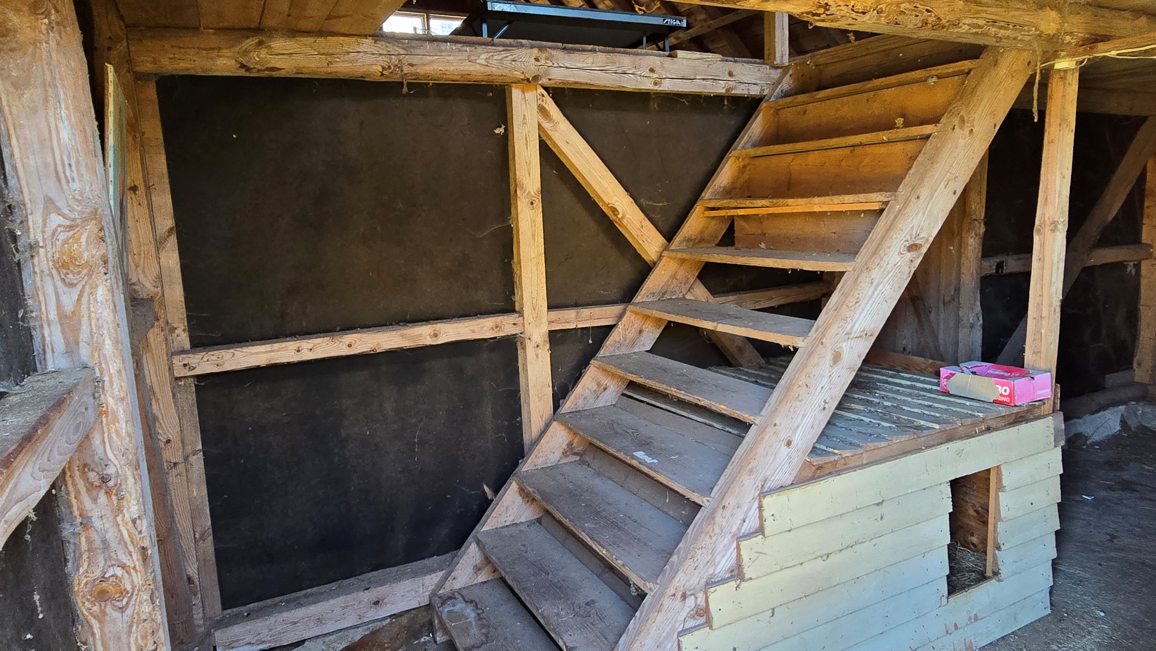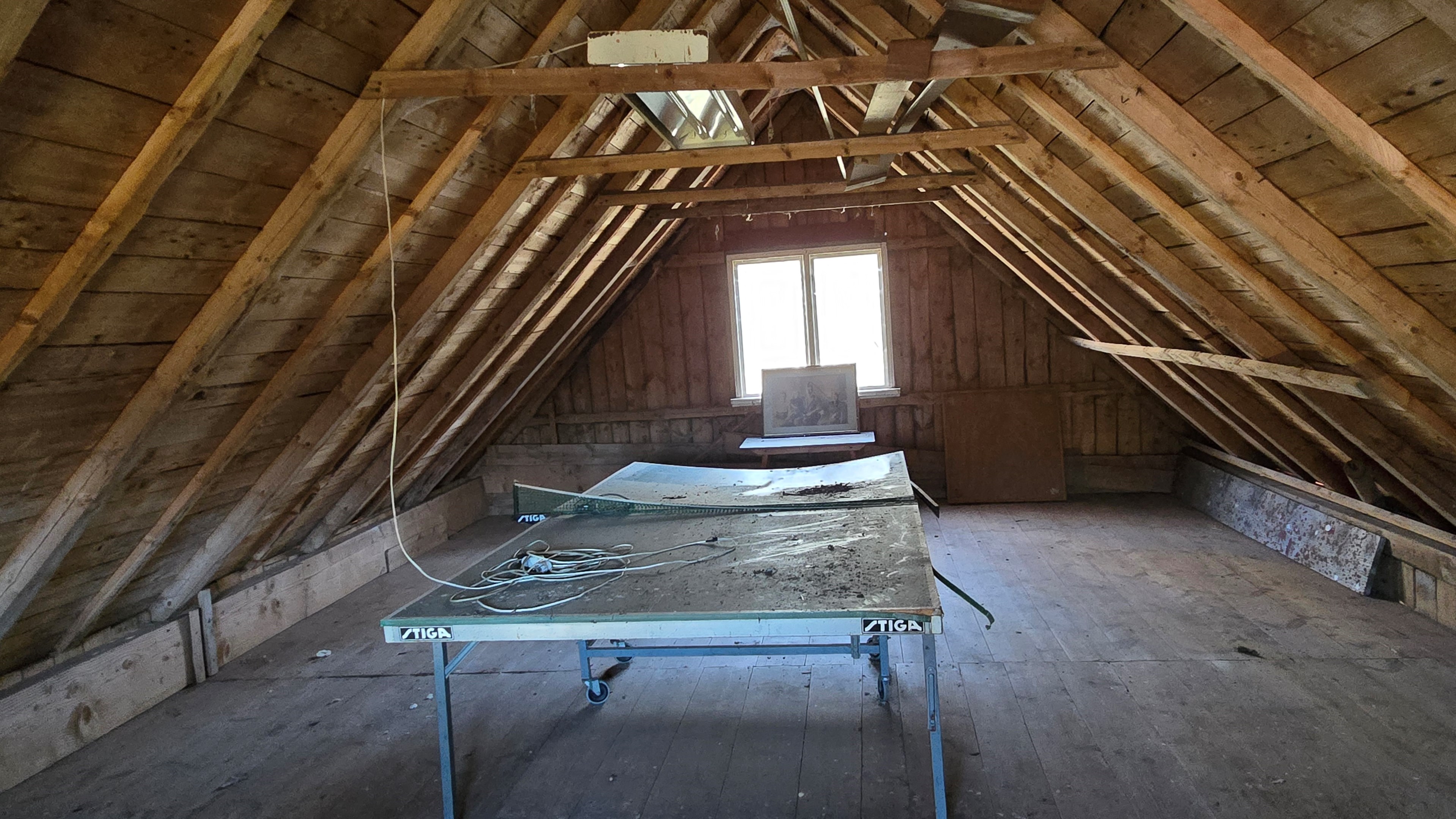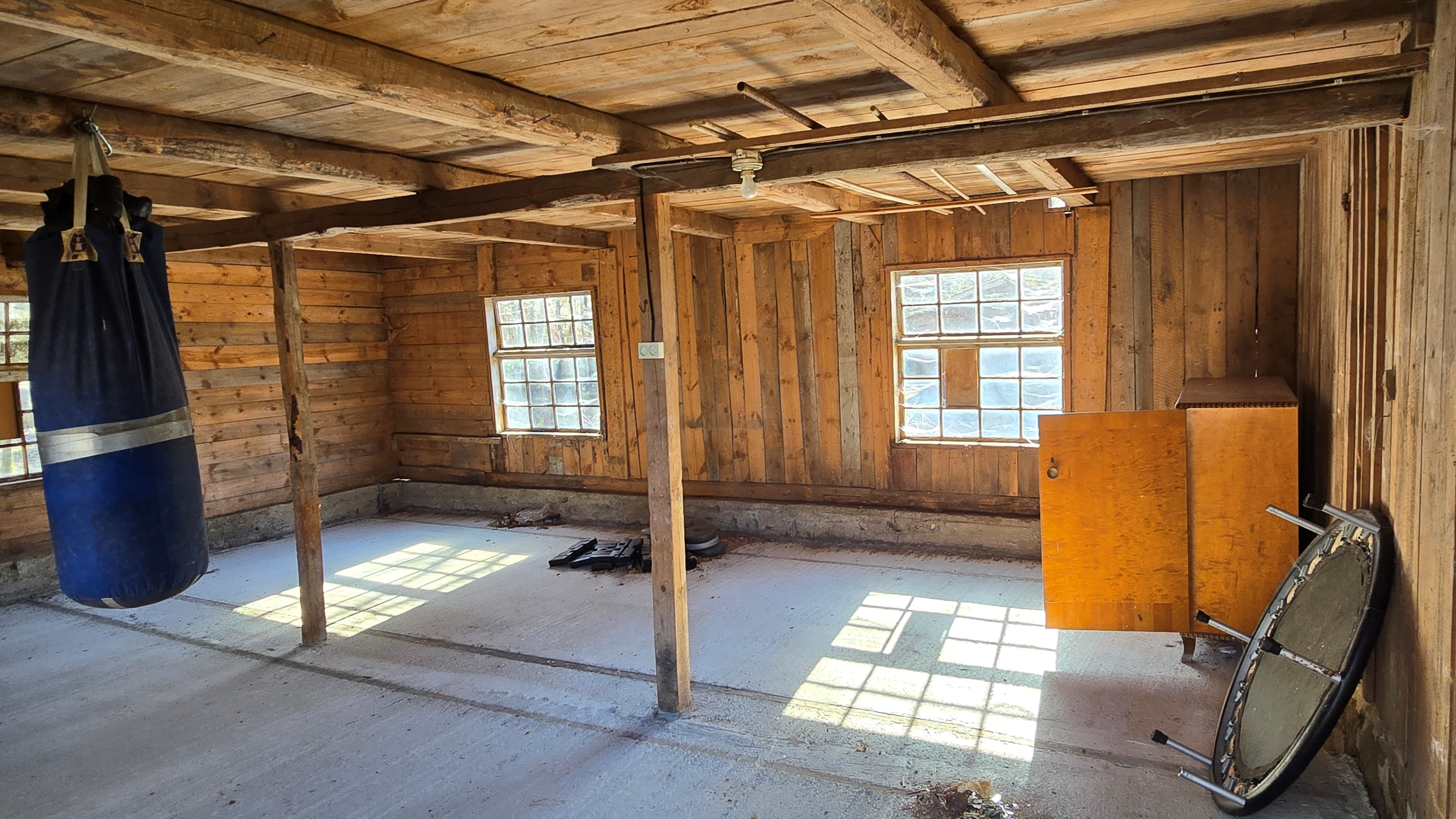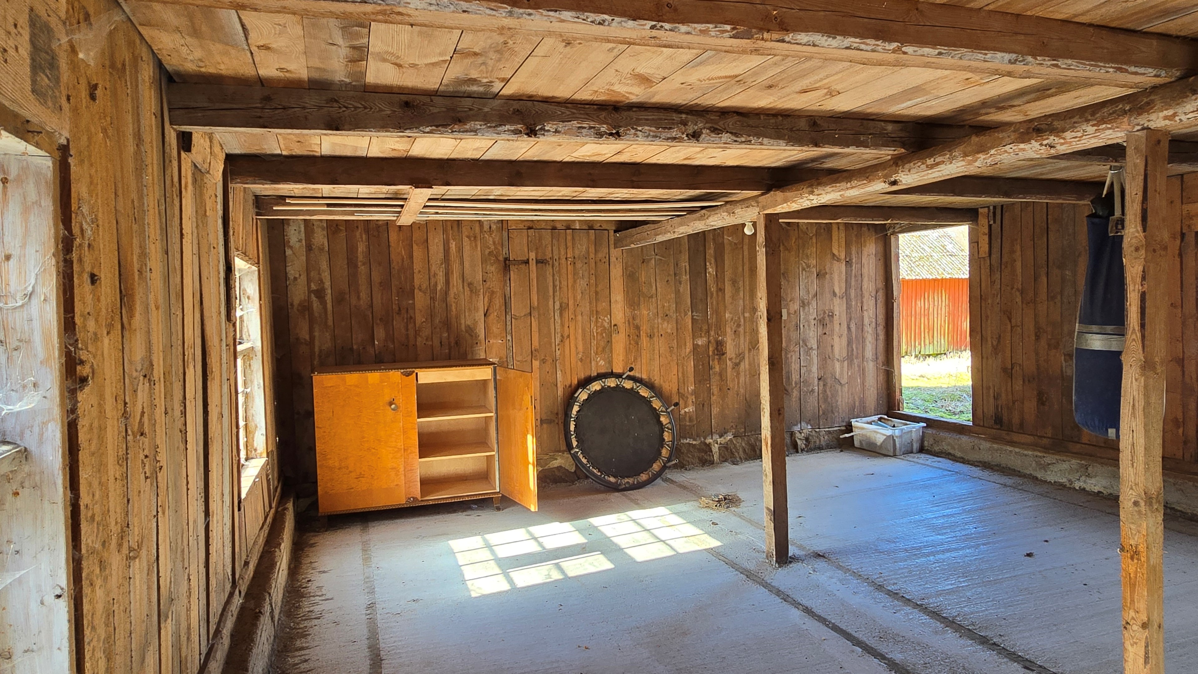 Lada/uthus på ca 60 m² med stort rum med gjutet golv med plats för t ex gym, hobby eller lek + vindsrum med gammalt bordtennisbord. -