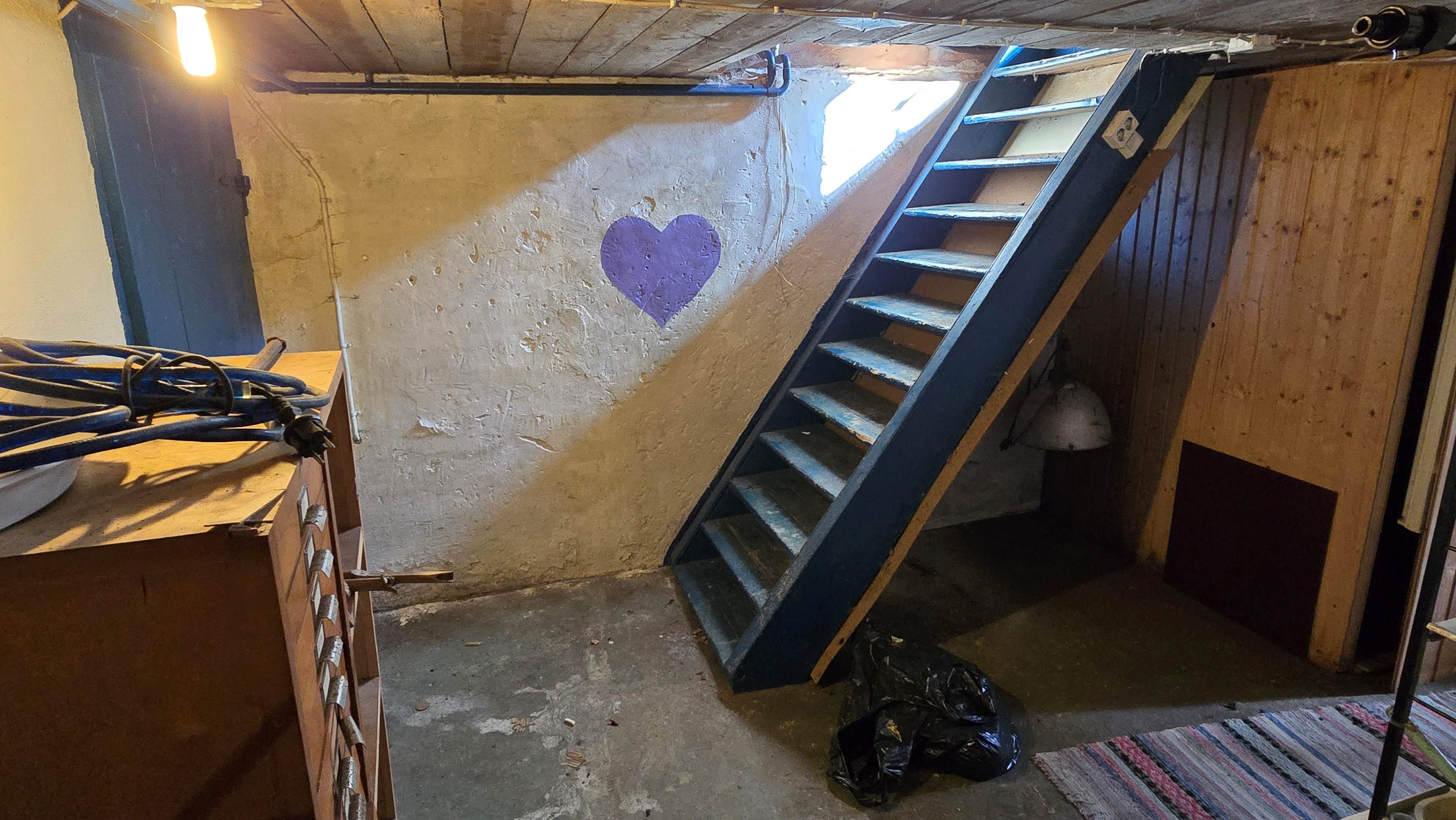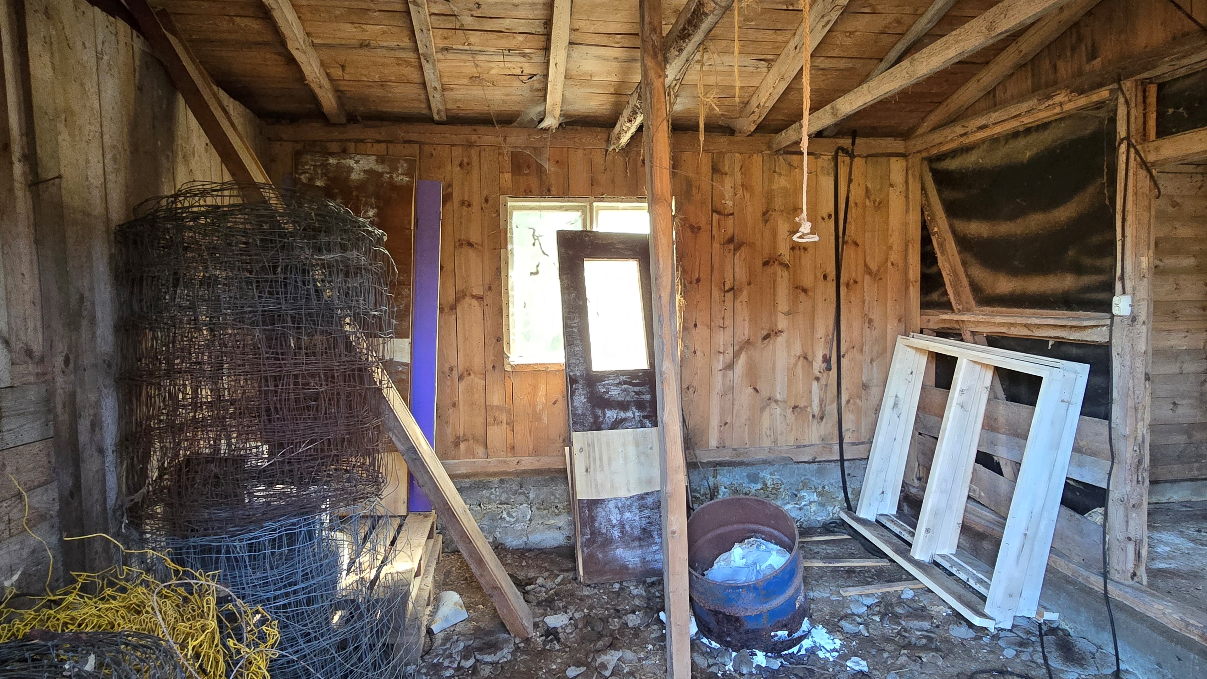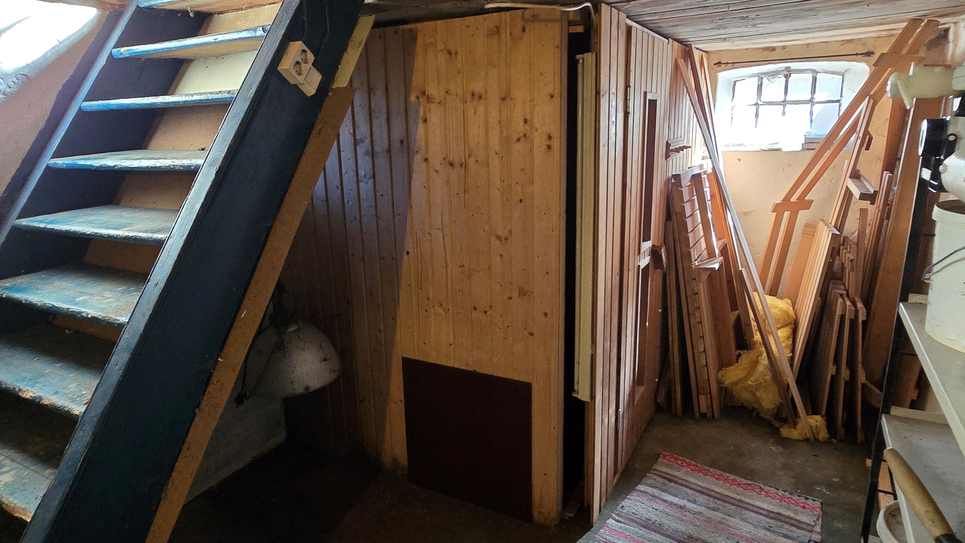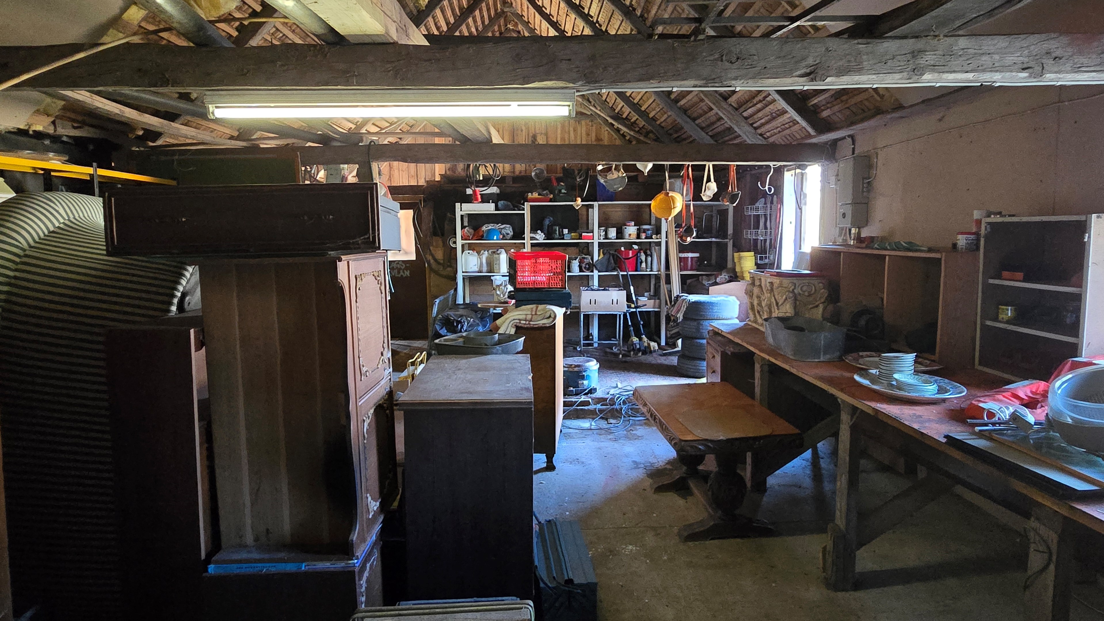 Lada/uthus på ca 60 m² med stort rum med gjutet golv med plats för t ex gym, hobby eller lek + vindsrum med gammalt bordtennisbord. -