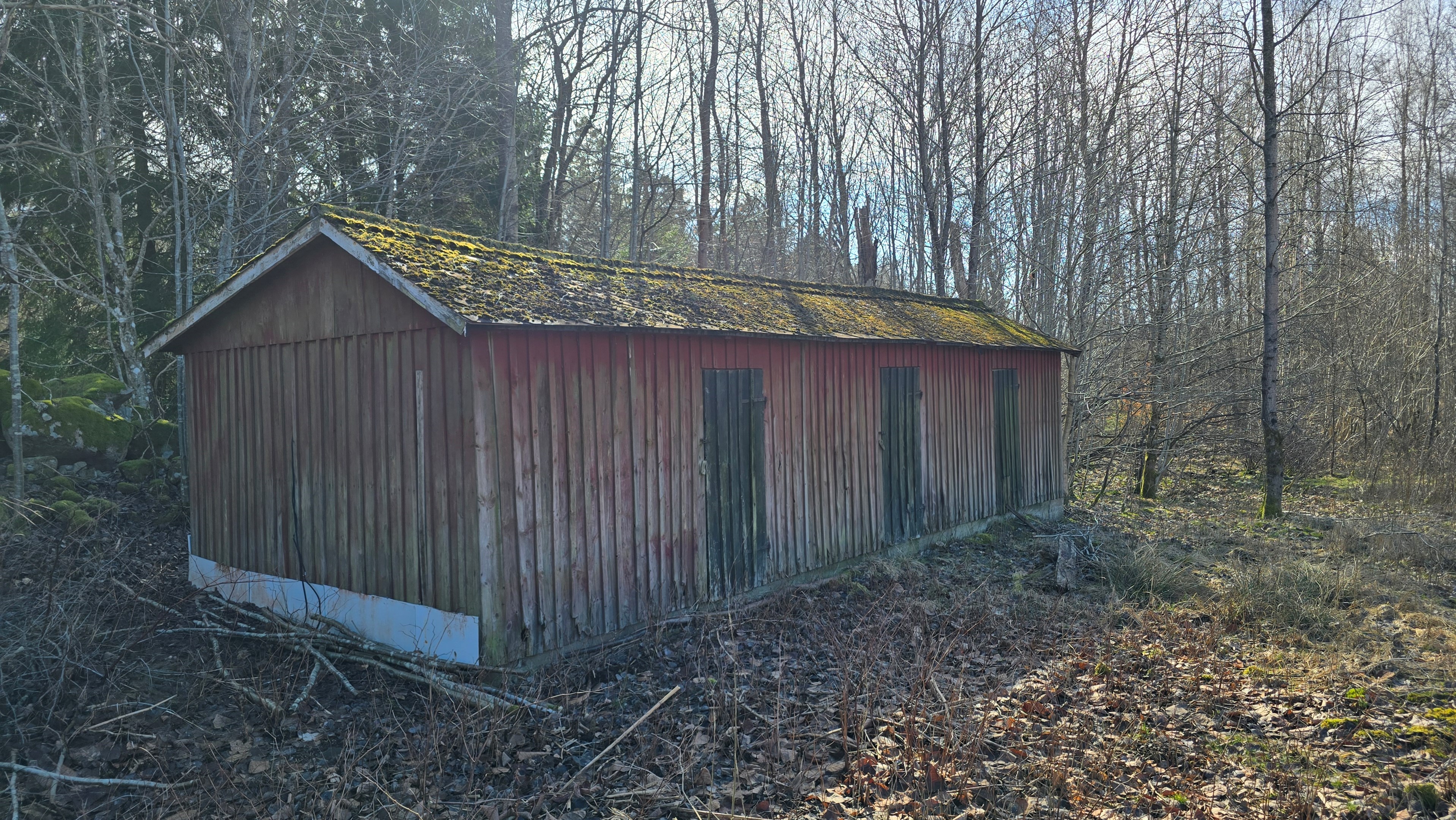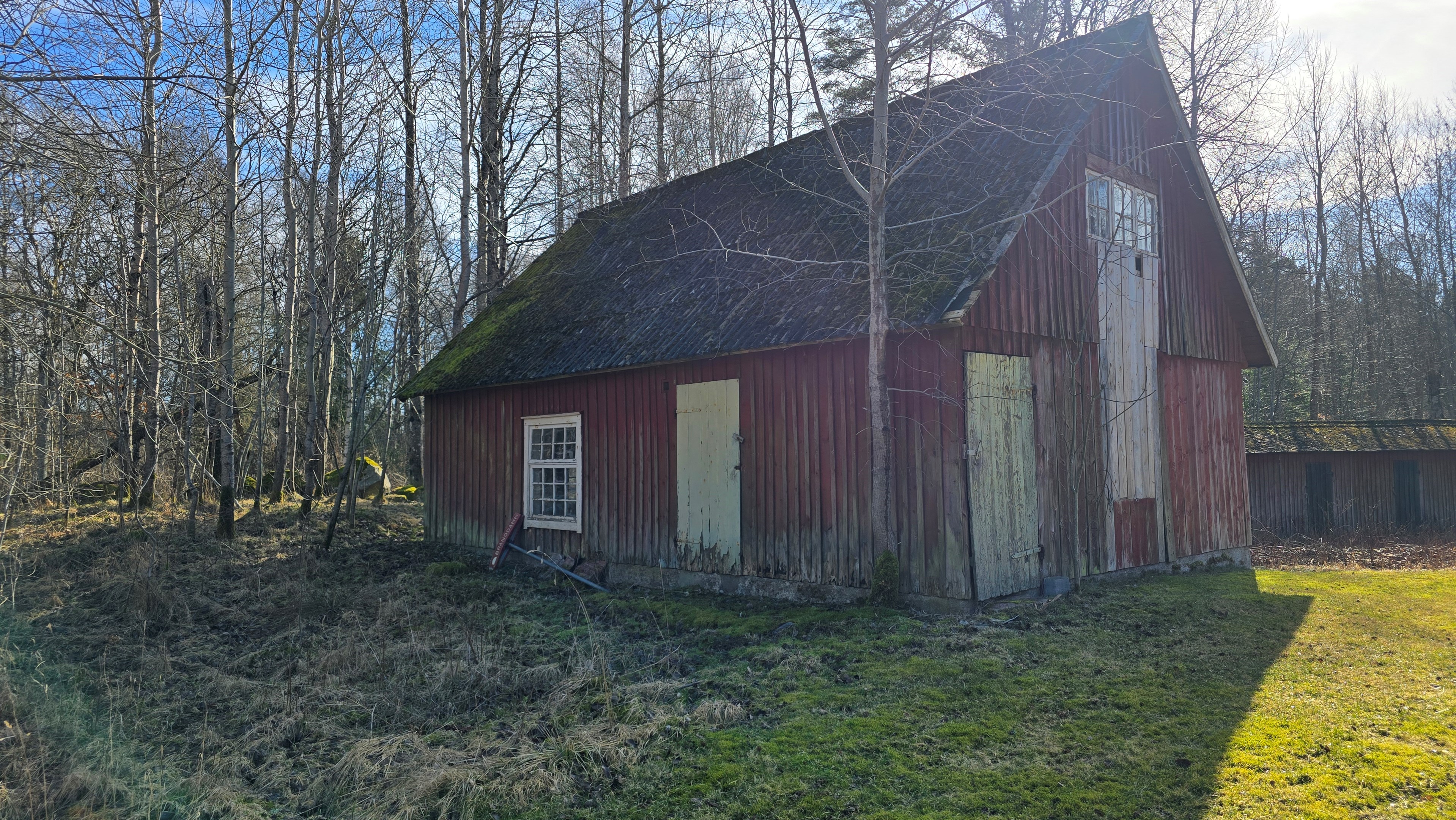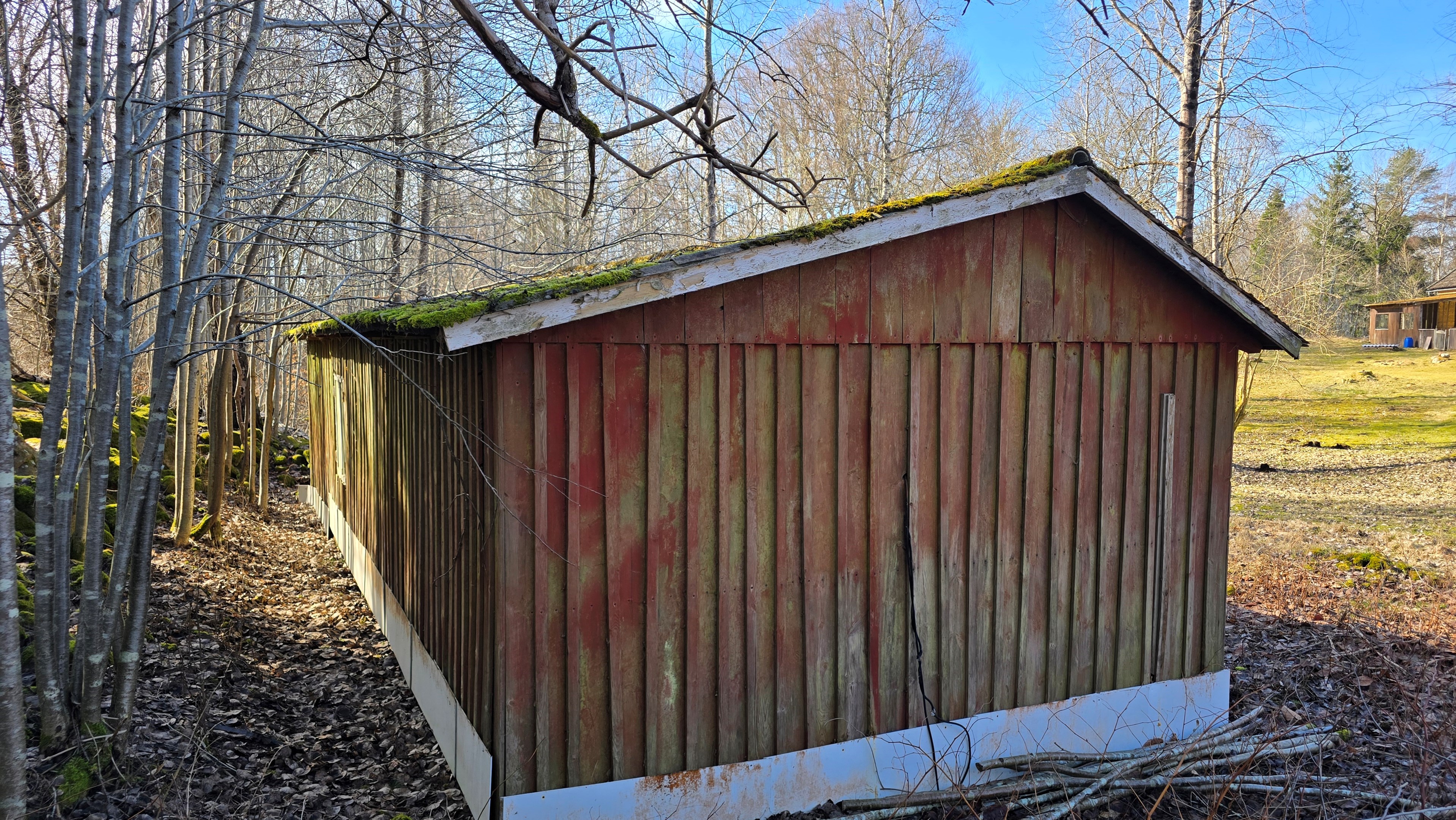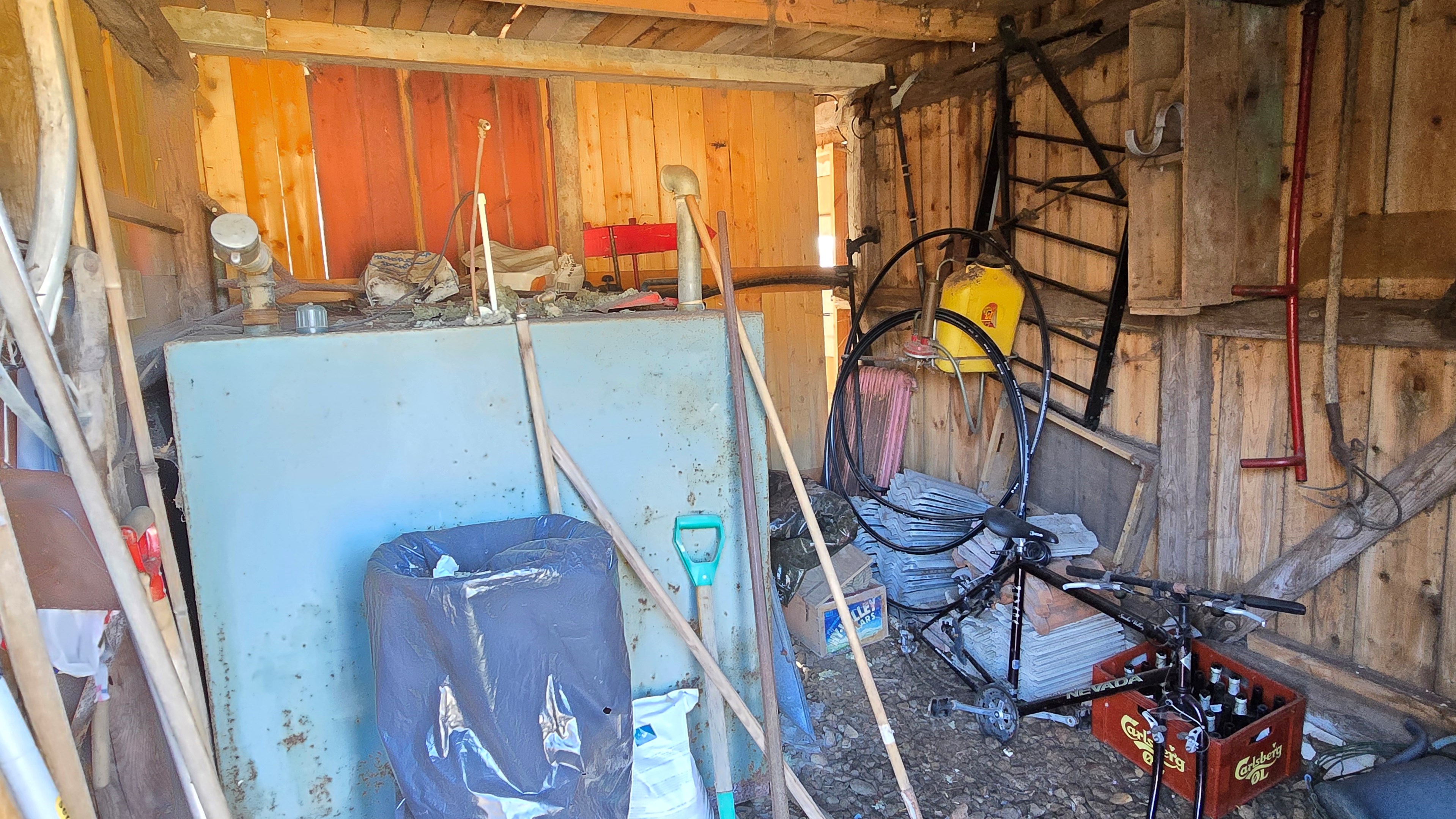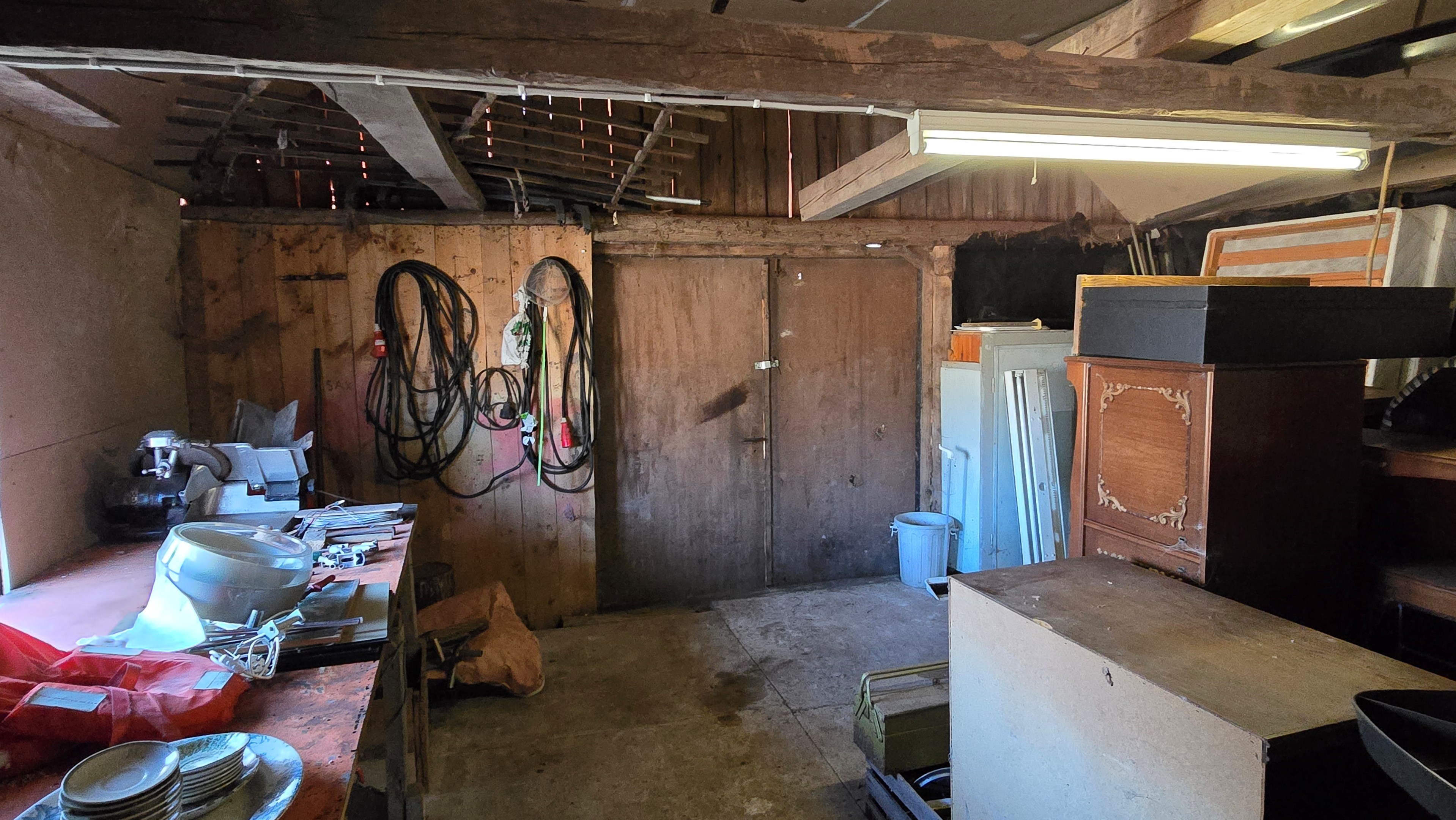 Mindre lada på ca 60 m² med eternittak och dålig klädselpanel. Här finns rum med gammal oljetank, stort verkstadsrum och garage med 3-fas kontakt. -