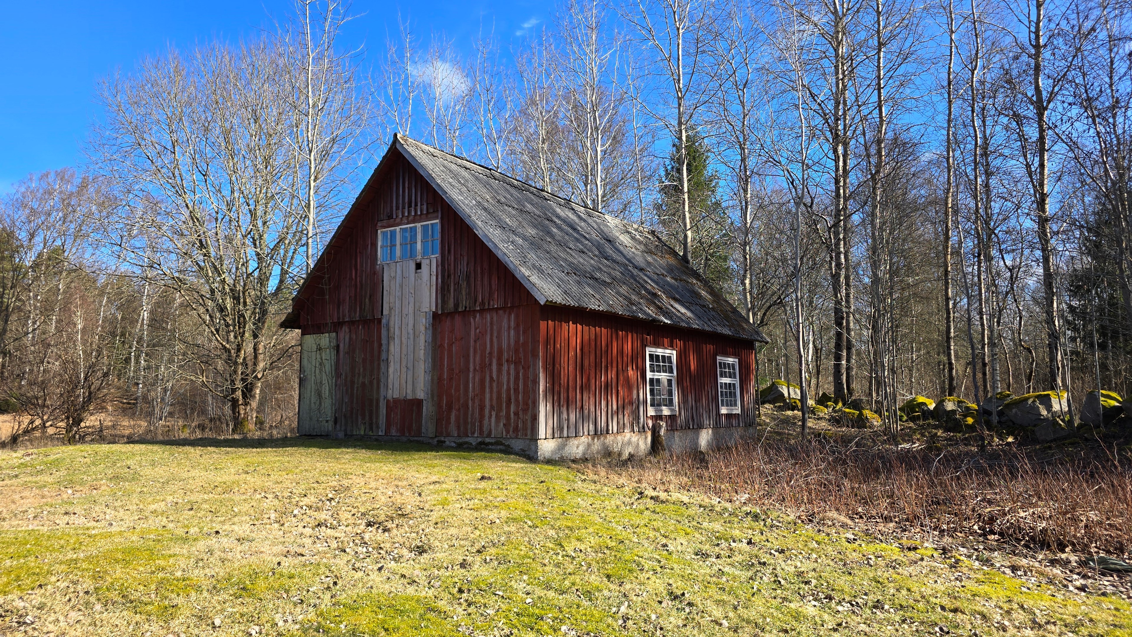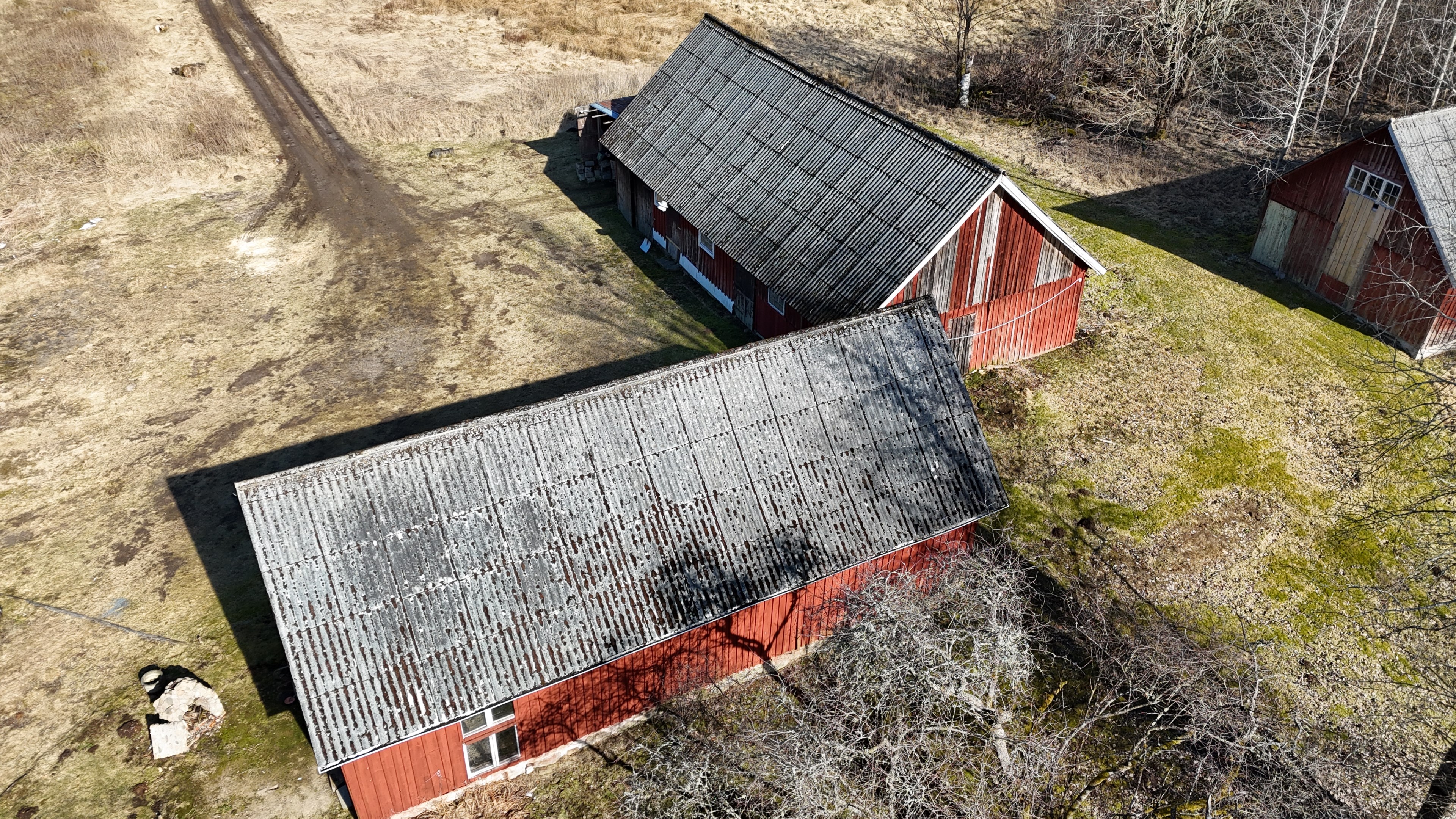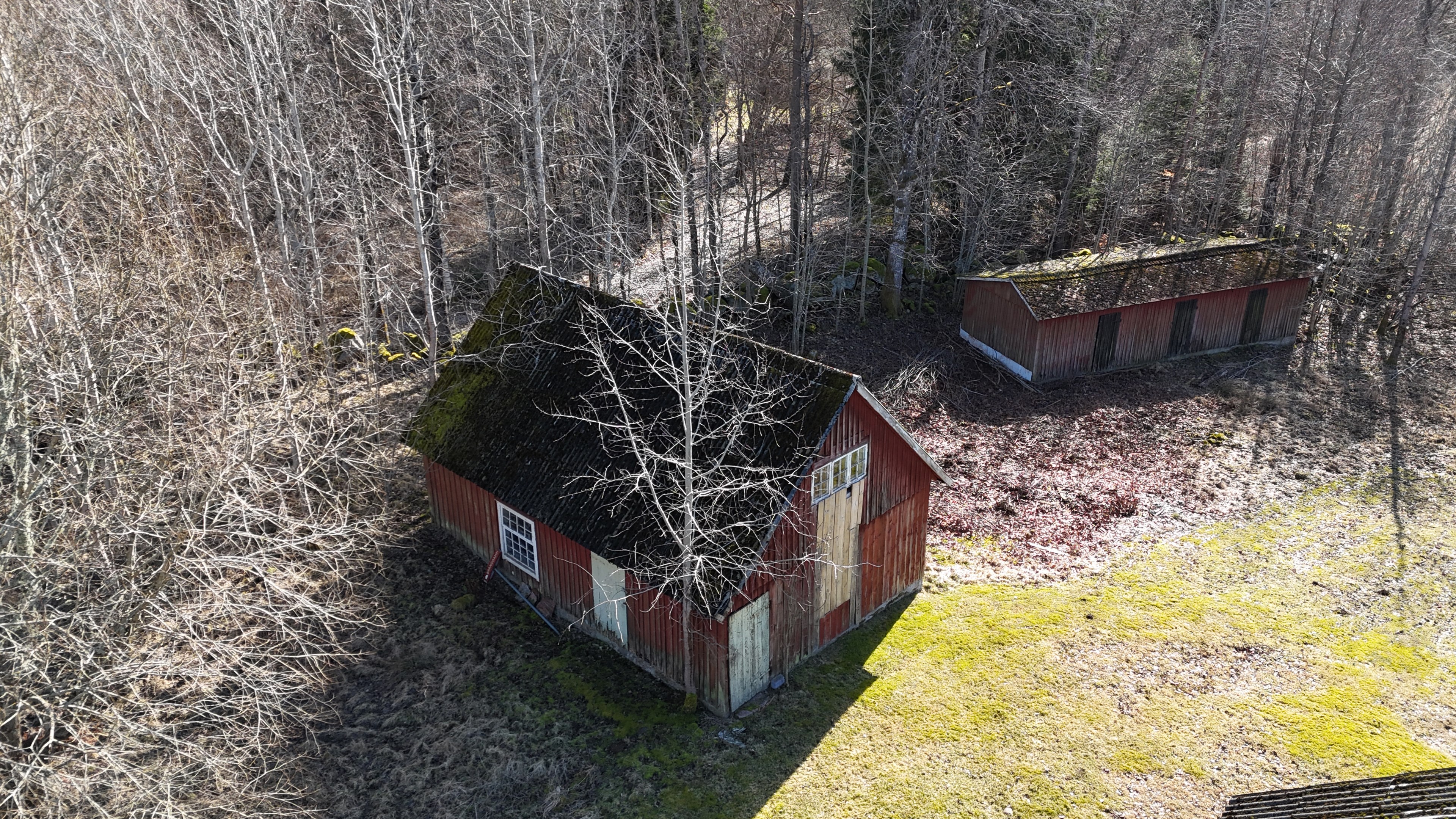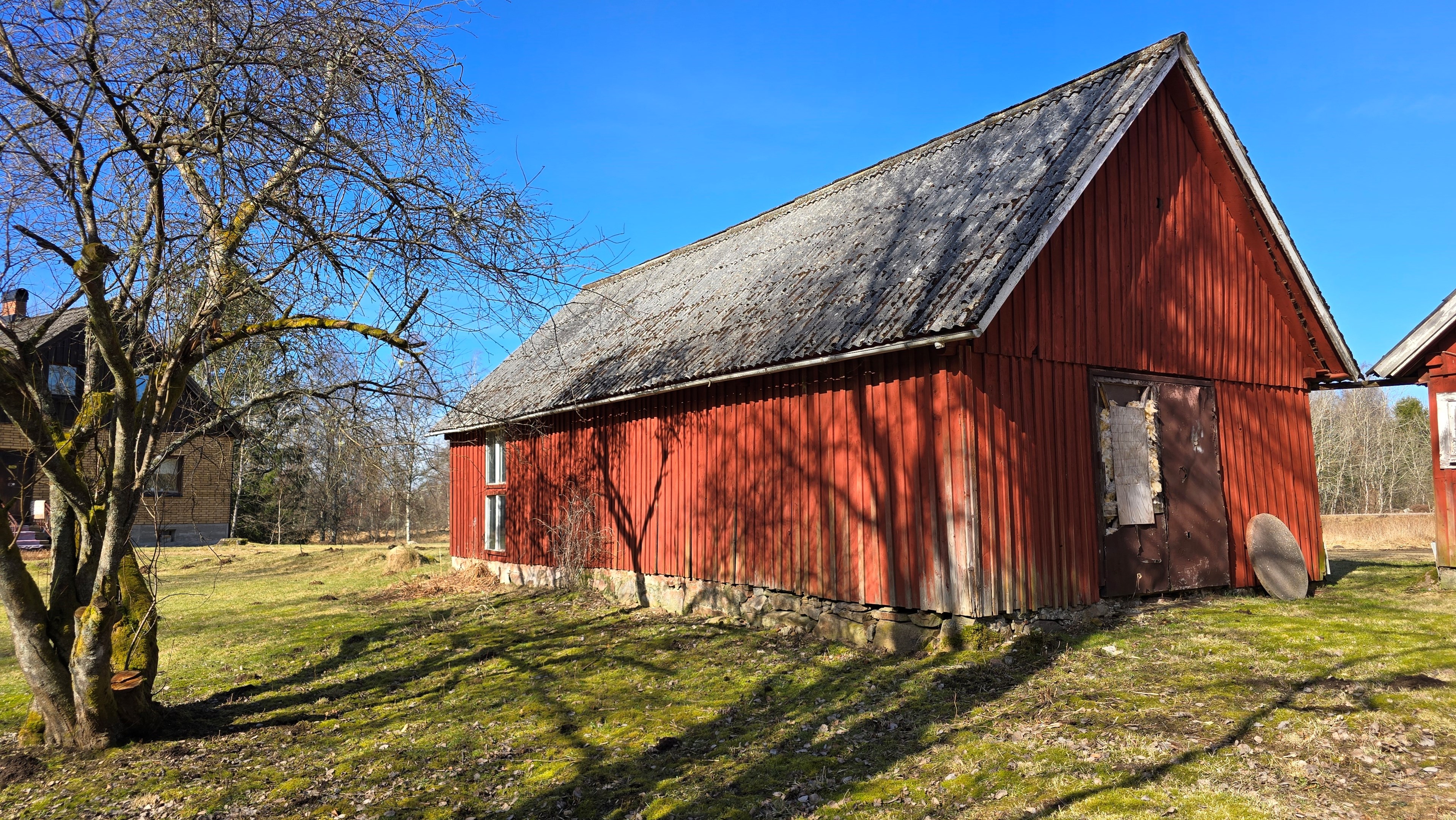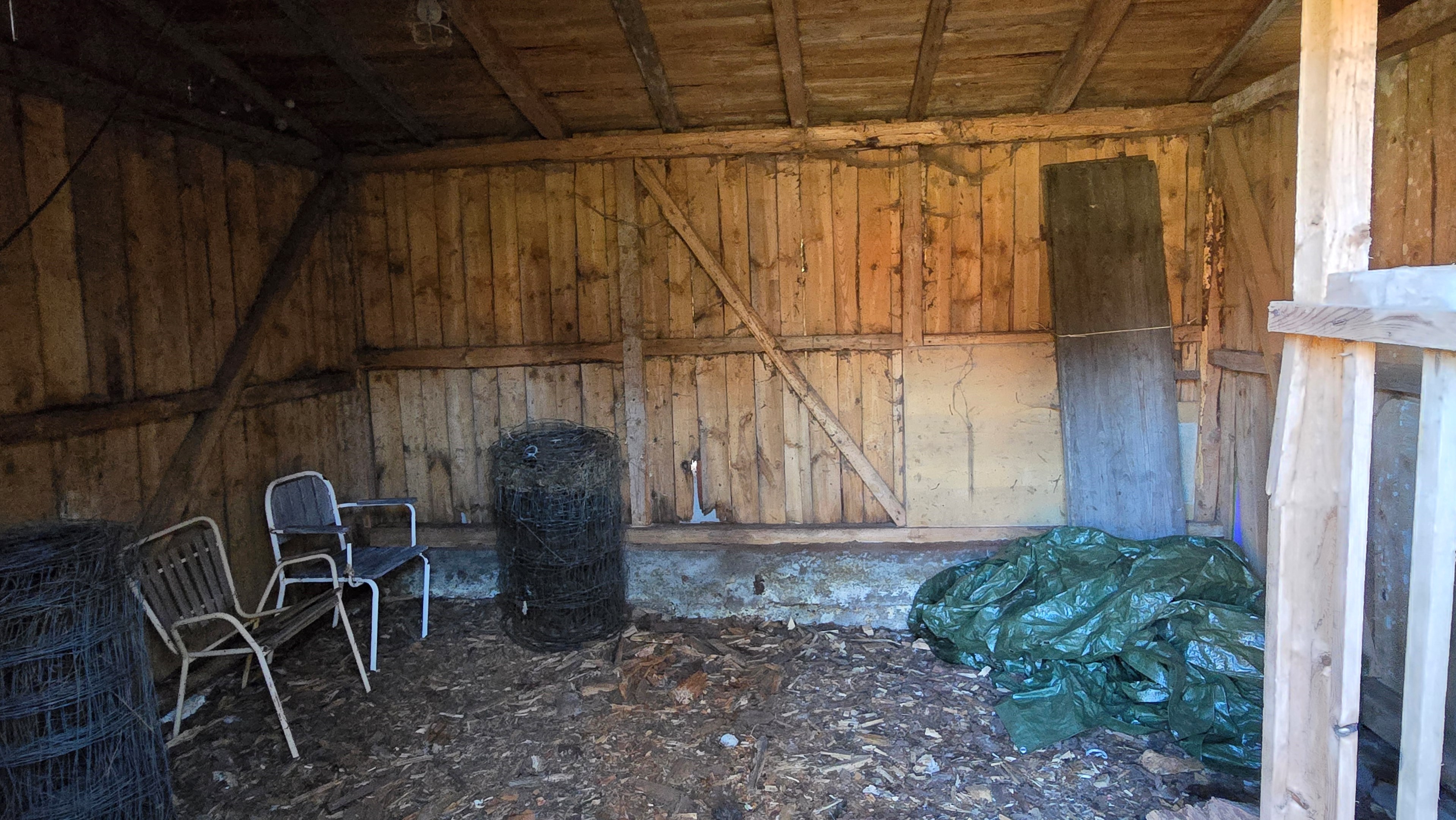Mindre lada på ca 60 m² med eternittak och dålig klädselpanel. Här finns rum med gammal oljetank, stort verkstadsrum och garage med 3-fas kontakt. -