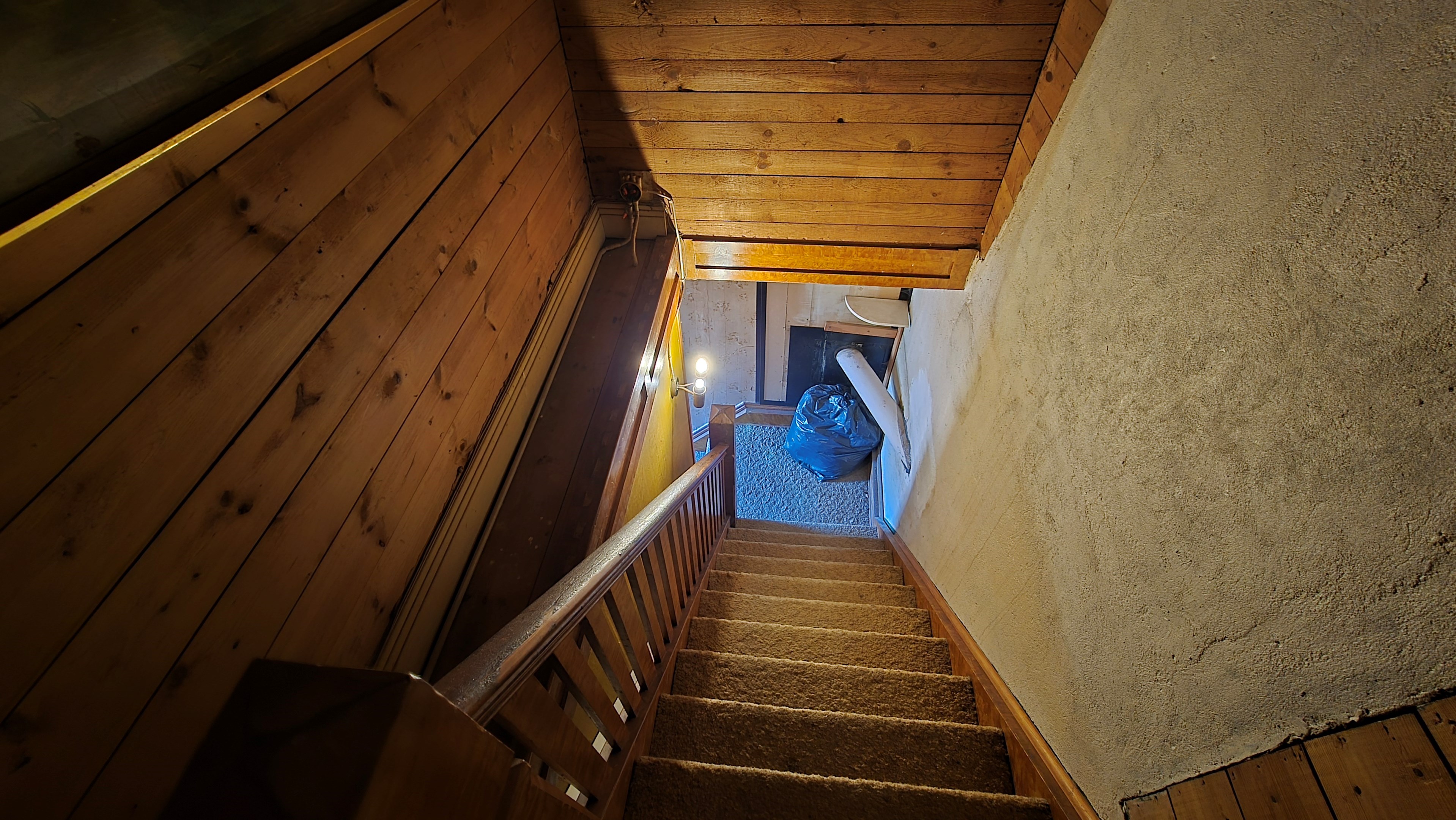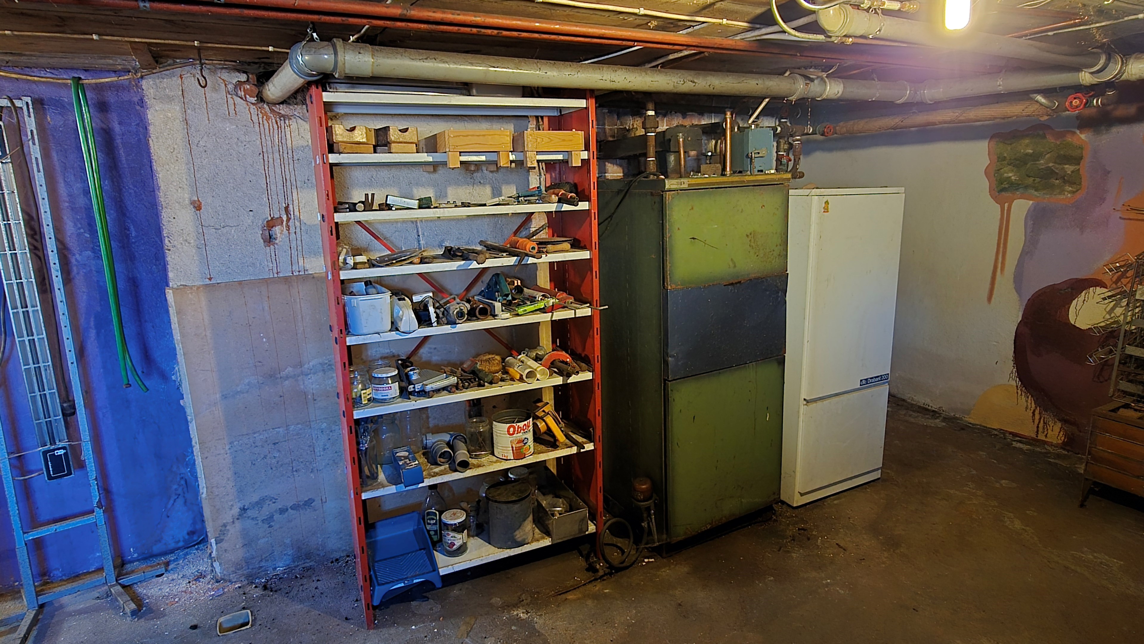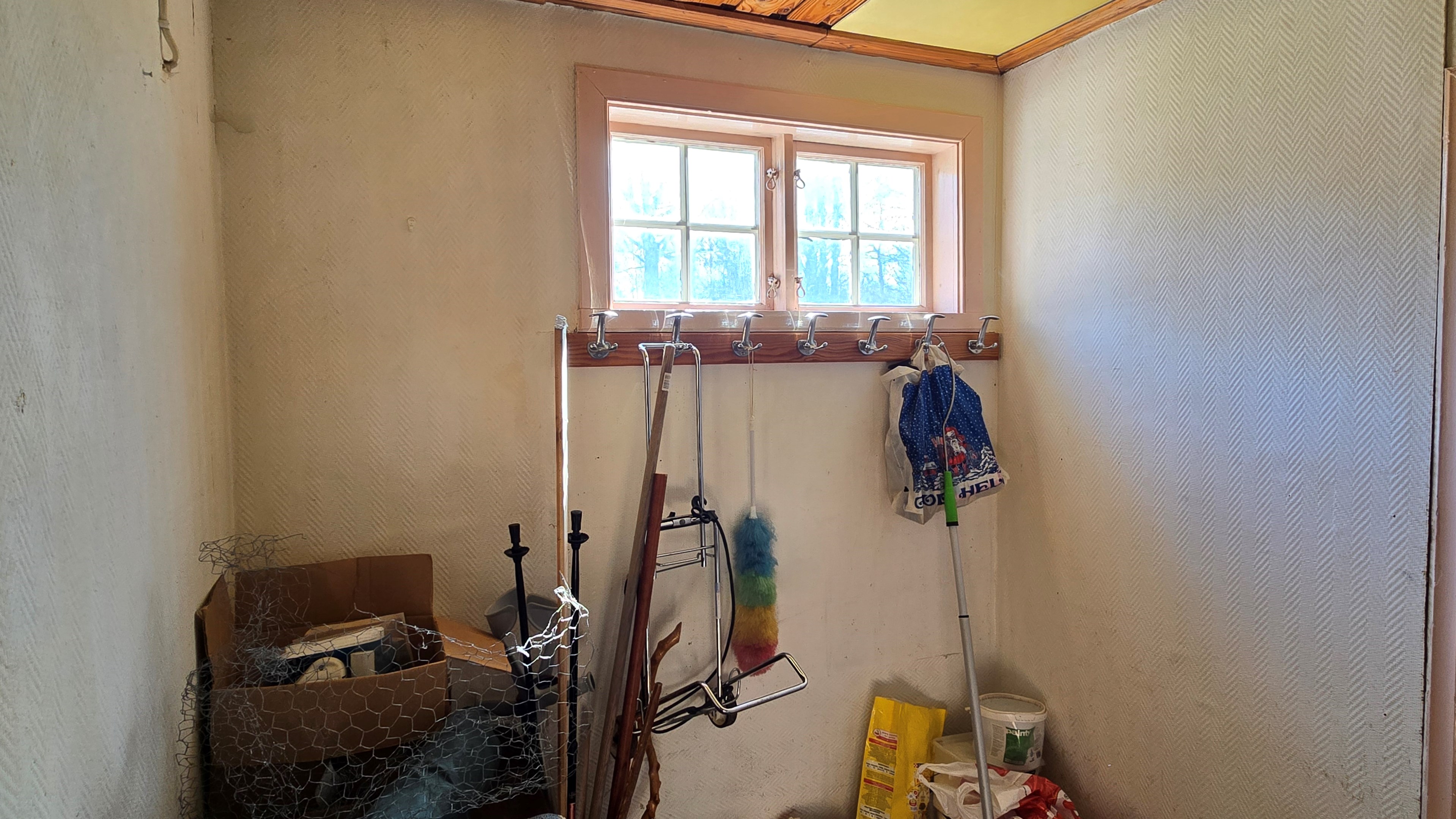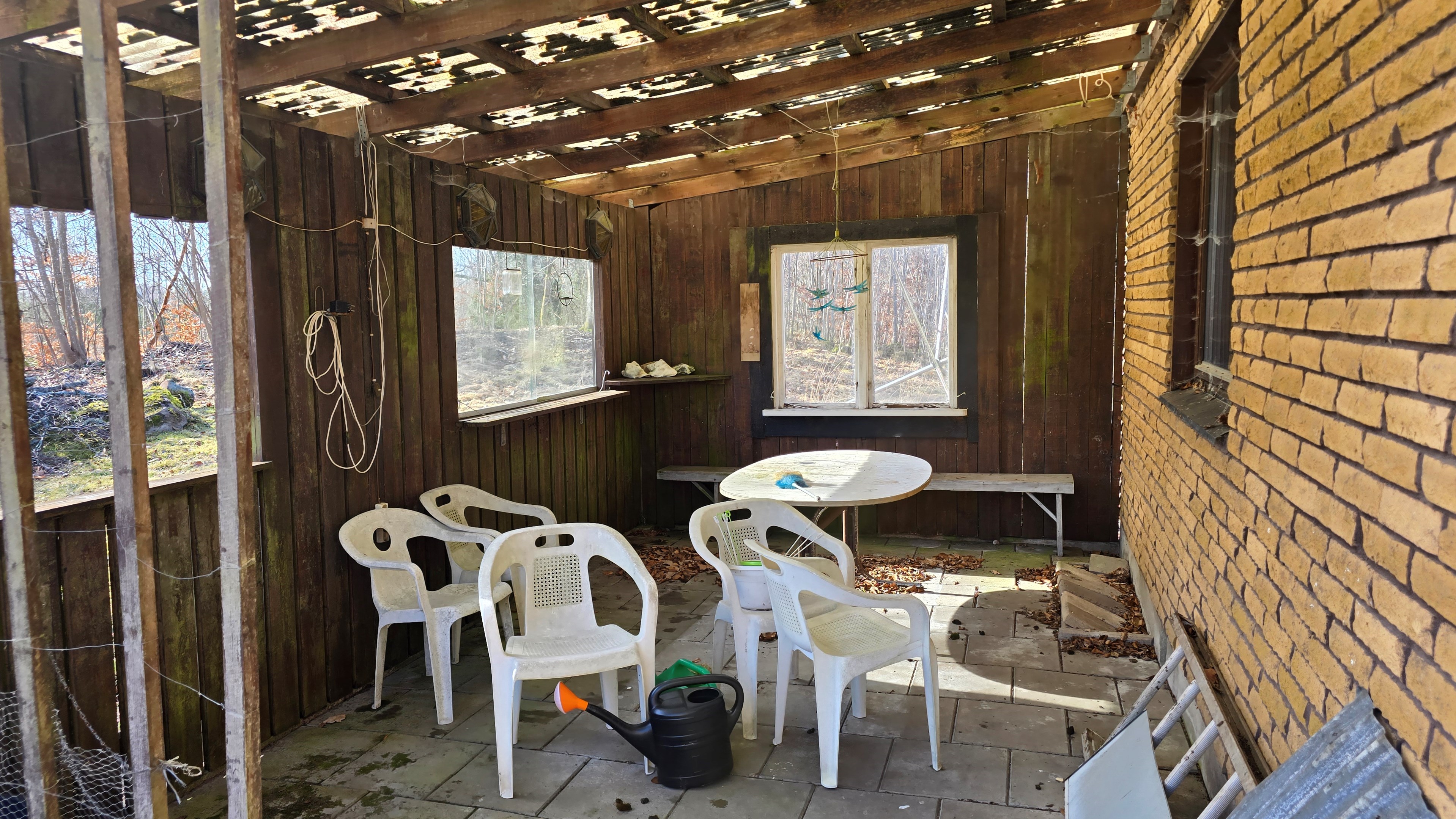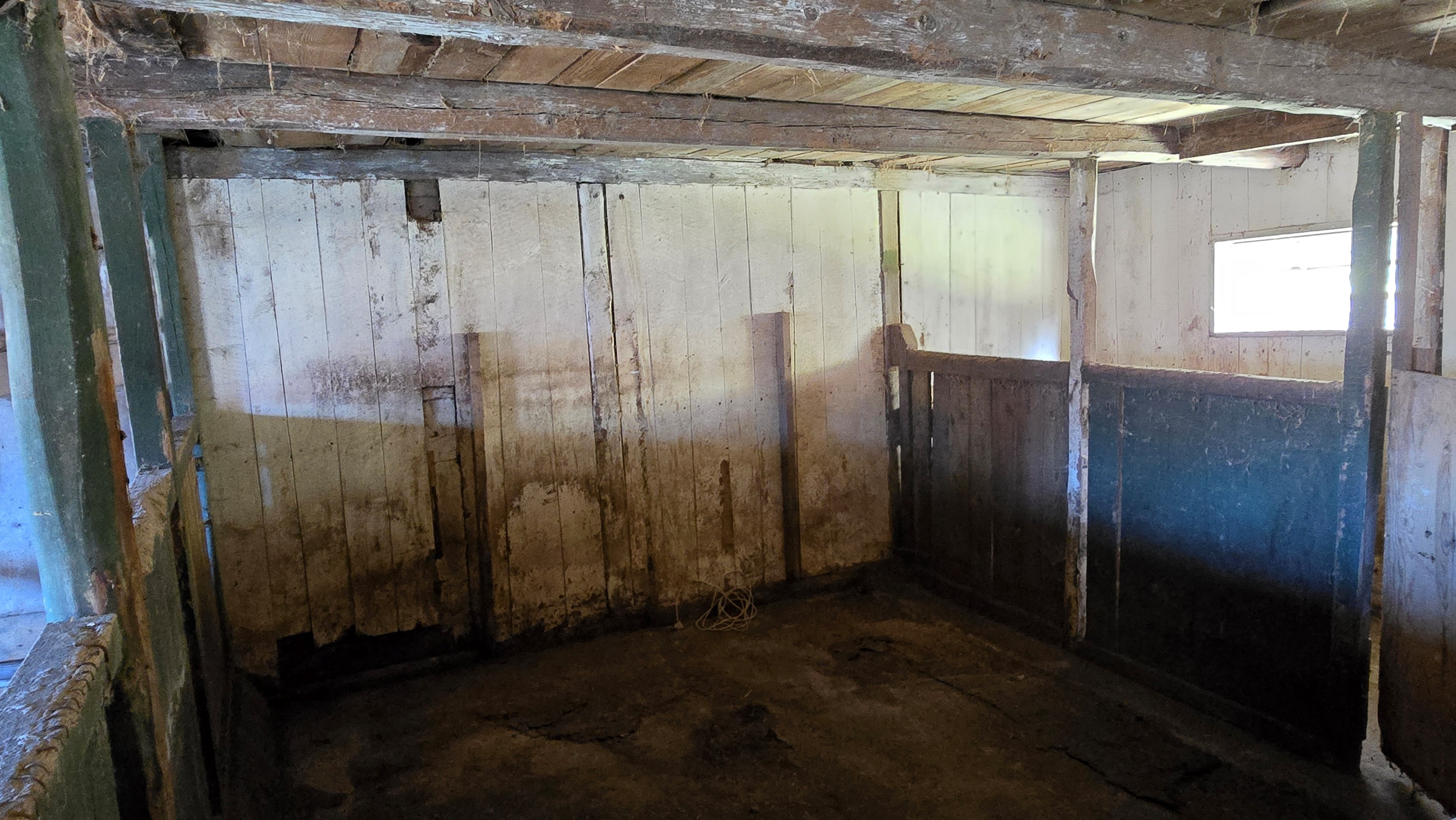 Mindre lada på ca 60 m² med eternittak och dålig klädselpanel. Här finns rum med gammal oljetank, stort verkstadsrum och garage med 3-fas kontakt. -