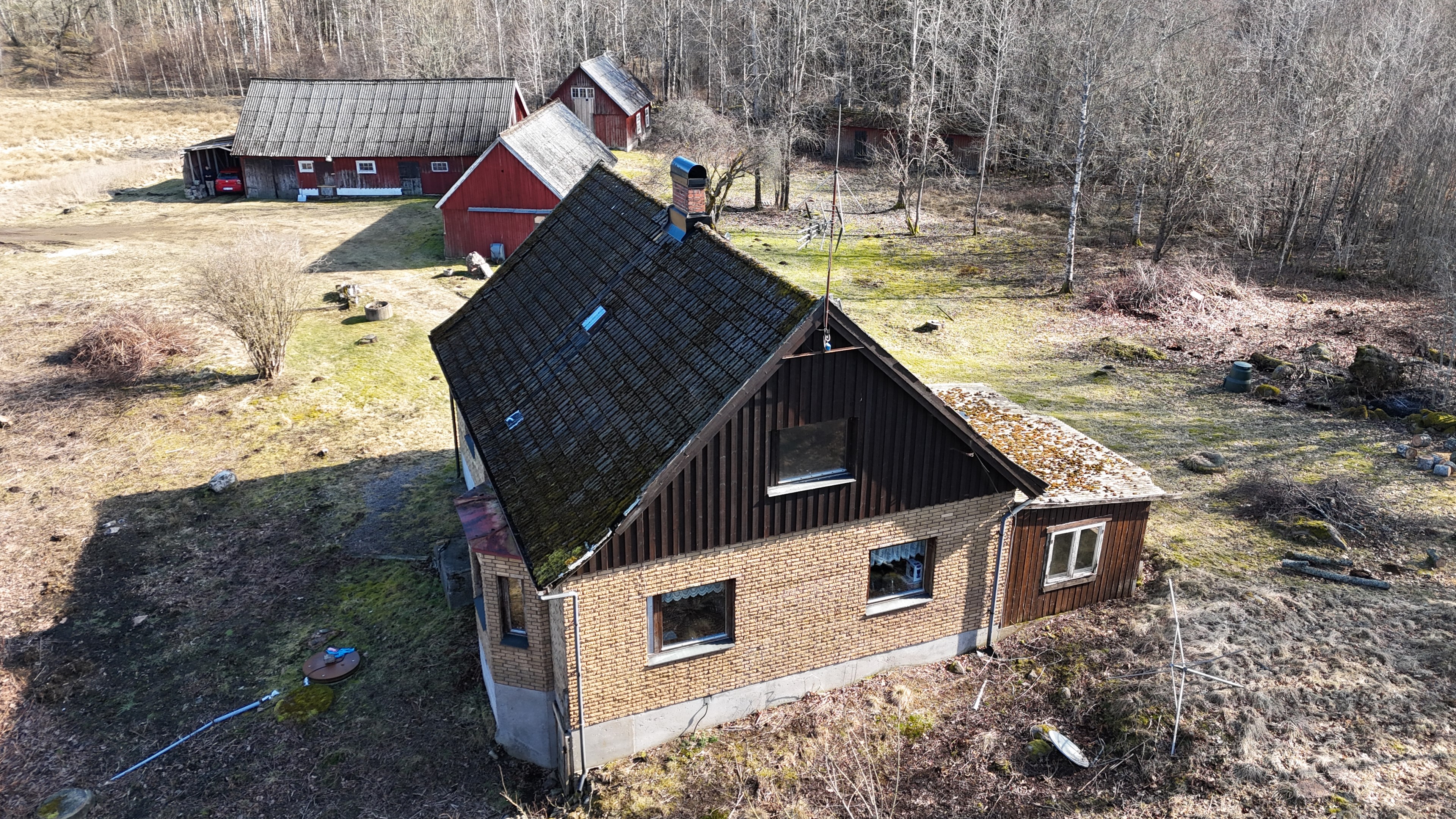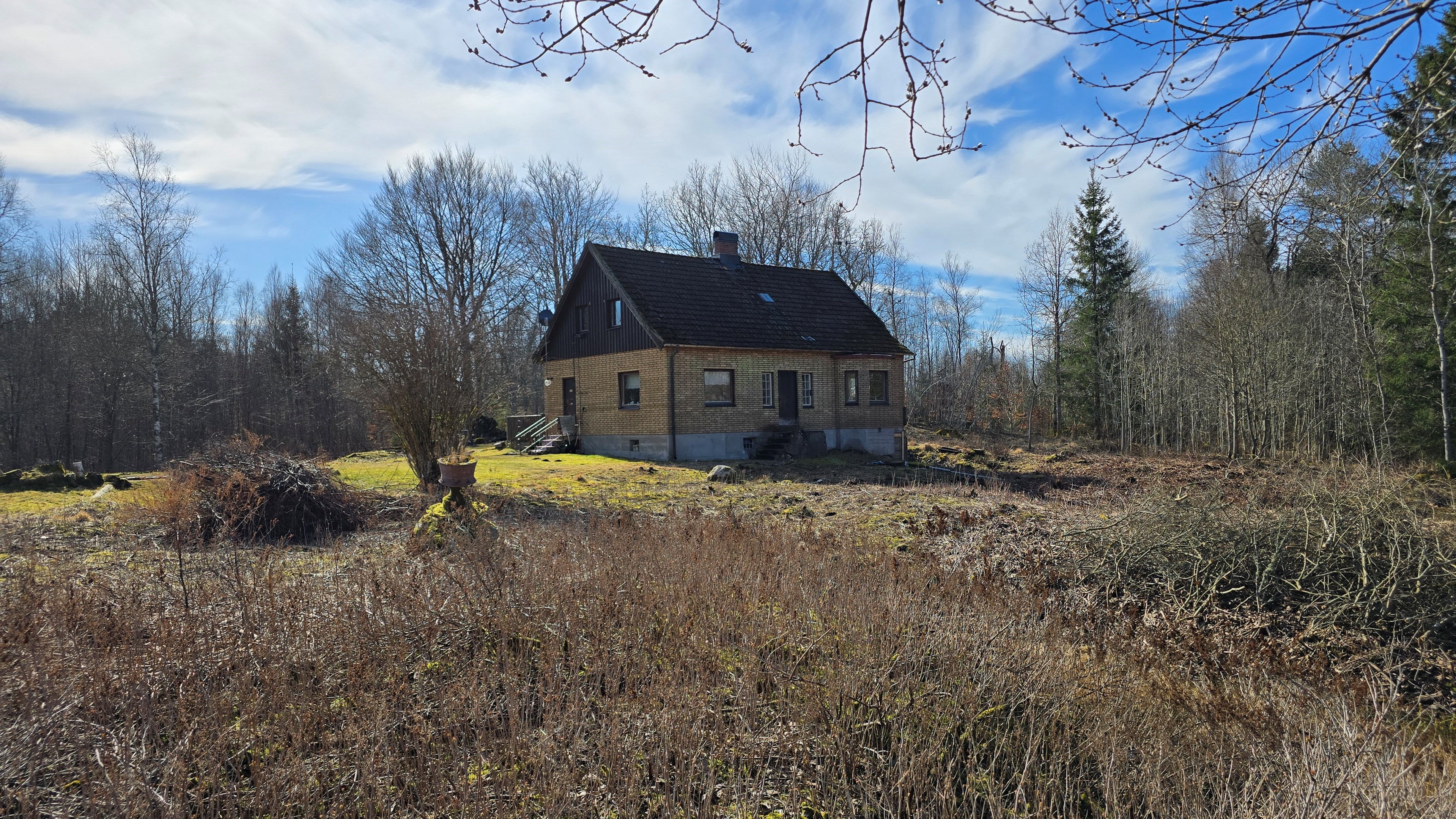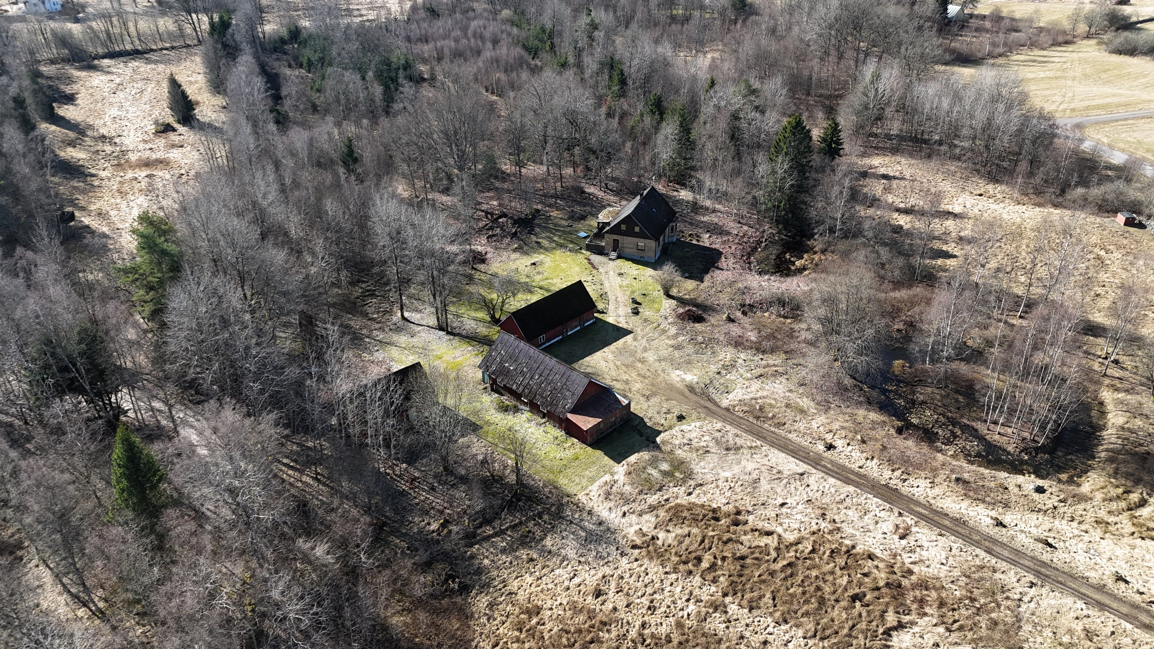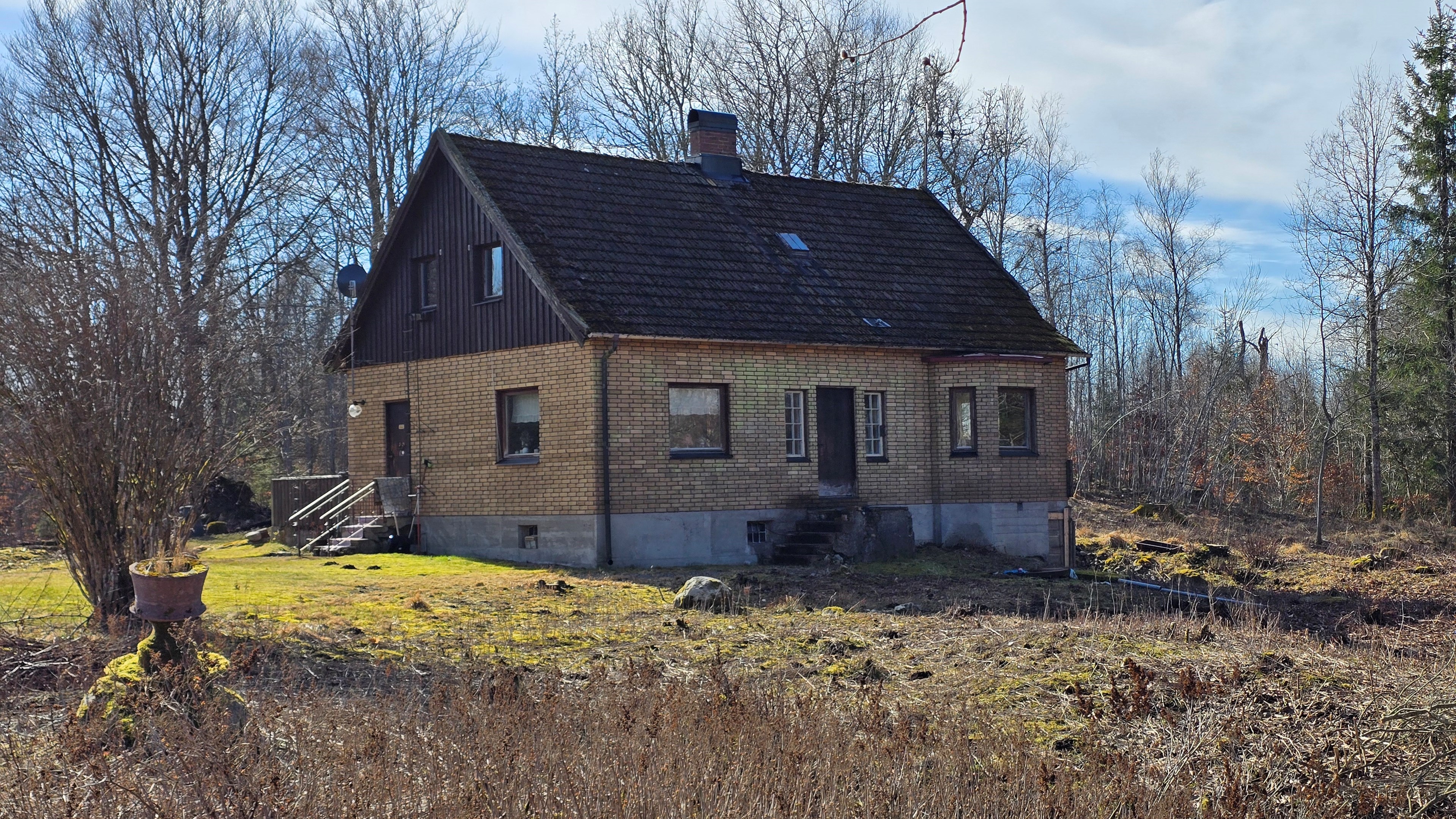 Gård med landvilla från ca 1925 med en boyta om 117 m² samt full källare. Uppvärmning sker med braskamin och elvärme, tidigare även vattenburen värme med olja/vedpanna (ej i drift). Vatten från egen brunn med en del nya ledningar, godkänt avlopp från 2008. Lador på 90 m², två på 60 m² var och uthus på 30 m². Tomten är 50 130 m² (5 ha) med gräsängar, skog och egen damm. Avstånd till närmaste sjö med badplats är ca 5 km. Ca 70 km från Helsingborg och 130 km från Malmö. Filmvisning: https://youtu.be/Wdzltk5wAGk Högarydsvägen 54 vid Hishult är en gård med villa på ca. 117 m² boyta + full källare på ca. 65 m². Huset är byggt omkring 1925, med en stomme i trä och skalmur av tegel. Uteplats på ca. 25 m² på baksidan av huset med betongsten och ungefär hälften är under tak. Huset används idag som permanentbostad, men är i behov av omfattande renovering både invändigt och utvändigt. Taket är av betongtegel, men flera vindskivor och takutsprång behöver bytas och det kan vara aktuellt att lägga om hela taket inom en snar framtid. Reservtegel finns att göra reparationer med. Fönstren är isolerglas, men två av rutorna är punkterade och behöver bytas. Skorstenen är nyligen renoverad och godkänd av sotare. Elsystemet är äldre med porslinssäkringar, utan jordfelsbrytare och med flera provisoriska lösningar, varför en genomgång och uppdatering eller byte rekommenderas. Uppvärmning sker med en godkänd braskamin (Handöl) i vardagsrummet, en braskamin i hallen på övervåningen samt några direktverkande element. Det finns ett äldre vattenburet system med gammal olja/vedpanna och ackumulatortankar (1 000 liter), men detta är inte i drift. Man kan överväga att montera en luft/vatten värmepump istället, eller en ved/pelletspanna, för att dra nytta av det befintliga systemet. Vatten tas från egen grävd brunn med några nya ledningar och brunnen har inte sinat. Avloppet är en trekammarbrunn med infiltration från 2008 med ny avloppspump 2025. Entré via köksingång med laminatgolv (trägolv under), träpanel i tak och trappa till källaren. Köket är rymligt med gott om skåp, äldre elspis, spisfläkt och diskmaskin (gammal, men fungerar), samt nyare kyl/frys. Litet skafferi och dörr till terrassen på baksidan (isolerglasfönster punkterat). Man har börjat en renovering genom att börjar riva tapet mm, men arbetet har stannat. Mindre vardagsrum med heltäckningsmatta och äldre gipsskivor i taket samt effektiv nyare Handöl braskamin med glaslucka (godkänd). Stort dubbelt vardagsrum eller kanske vardagsrum och matsal med trägolv och burspråk med utsikt mot dammen. Huvudentré med trappa till övervåning. Gammalt badrum med våtrumsmatta på golv och väggar, dusch, nytt WC (2025) och handfat. Ytskikten är slitna och våtrumsmattan har börjat släppa i duschen och bör bytas. På övervåningen finns liten trapphall och dörr till oinrett vindsrum. Stor hall med stora inbyggda garderober och en godkänd Norrahammar braskamin. Större sovrum med dubbelsäng, trägolv och trä på väggarna. Två mindre sovrum med trägolv slitna ytskikt. Källaren nås via trappa från köksingången och har flera utrymmen för förvaring. Här finns bastu (ej helt färdig), skafferi med frysbox (defekt), pannrum (defekt panna) och verkstadsrum med elcentral, mycket gammalt badrum (ej i bruk) med dusch, gammalt badkar och en braskamin (ej godkänd). Tvättstuga med tvättmaskin, vattenpump och hydrofor. På gården finns flera uthus/lador. Lada på ca 90 m² + tillbyggd carport med eternittak. Här finns stall med många olika bås, garage med reservtegel och carporten. Mindre lada på ca 60 m² med eternittak och dålig klädselpanel. Här finns rum med gammal oljetank, stort verkstadsrum och garage med 3-fas kontakt. Ännu en lada på ca 60 m² med stort rum med gjutet golv med plats för t ex gym, hobby eller lek + vindsrum med gammalt bordtennisbord. Mindre uthus med eternittak på ca 30 m² med plats för ved och förvaring. Tomten omfattar 50 130 m² (ca 5 hektar eller 10 tunnland) med gräsängar, yngre och blandad skog samt en egen damm med liten ö närmast huset. Dammen är delvist igenvuxen, men kan återställas. Säljaren ser till att buskar och parkslide vid dammen rensas bort under våren. Gården ligger naturskönt och ensligt med ca 100 m. till närmaste granne, som inte syns eller stör. Liten landsväg passerar gården, men den är mycket lätt trafikerad och snöröjs vintertid. På tomten finns gott om plats för enklare djurhållning, odling för självhushåll eller liknande. Här finns även möjlighet för lite småviltjakt. Gott om vedskog på tomten, men inte någon värdefull skov av betydelse. Ca 2 km. till Grötsjön och samma avstånd till den mysiga Kvarnen i Kornhult med goda smörrebröd och hemmagjord gelato på sommaren. Ca 5 km. till riktig anlagd badplats i Store Sjö. Ca 7 km. till Hishult samhälle med närmaste affärer och den berömda Hishult Konsthall. Ca. 14 till Knäred samhälle och ca. 15 km. till Markaryd. Ca 25 km. till Vallåsen skidbacke och Bike-Park och ungefär samma avstånd till Kungsbyggets Äventyrspark. Ca. 70 km. från Helsingborg och ca 130 km. från Malmö. OBS! Fastigheten ligger i glesbygdsområde där förvärvstillstånd krävs från Länsstyrelsen i Hallands län. Ansökningsavgift på 5 200 kr betalas av köparen och återbetalas ej vid avslag. Normal handläggningstid är ca. 30 dagar och affären villkoras givetvis av att förvärvstillstånd beviljas för köparen. Fastighetens pris är s.k. "maxpris", dvs. det blir ingen budgivning ut över detta pris. Det är givetvis tillåtet att lämna ett bud under det marknadsförda priset, men det kan då bli budgivning upp till maxpriset. Läs mer på hemsidan "Om att köpa ett hus": https://www.oedegaarde.dk/Kopa/S13270.