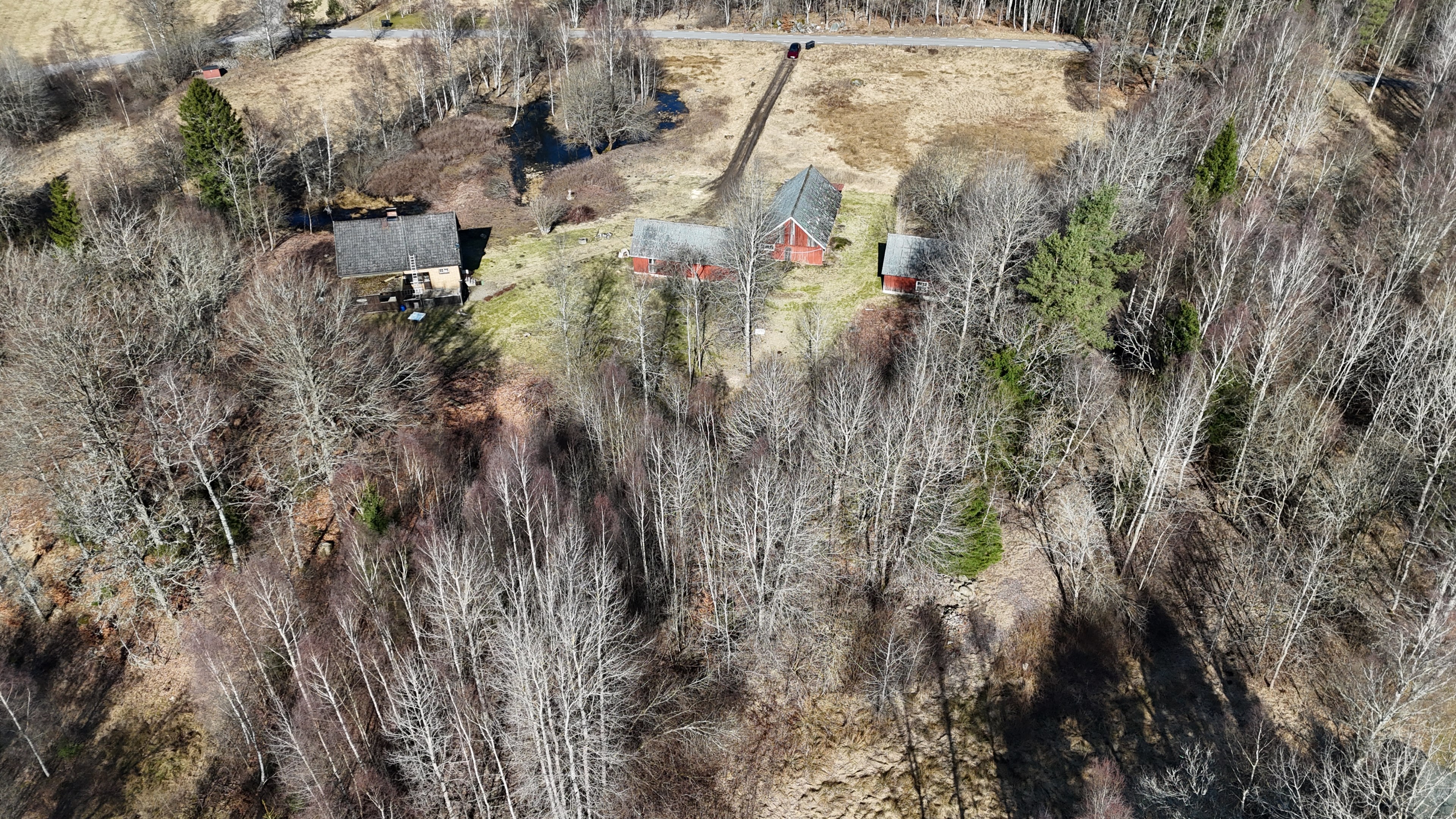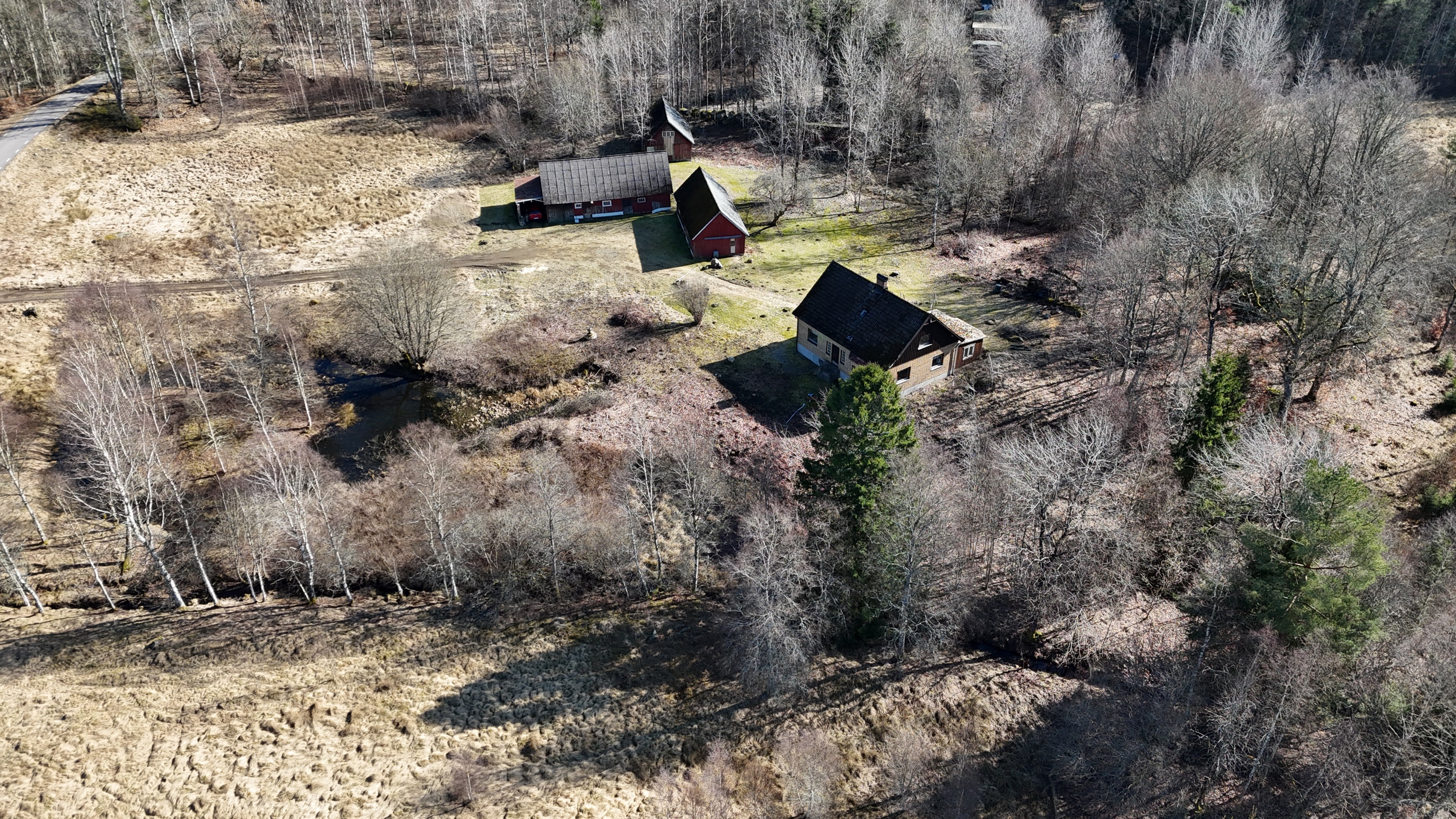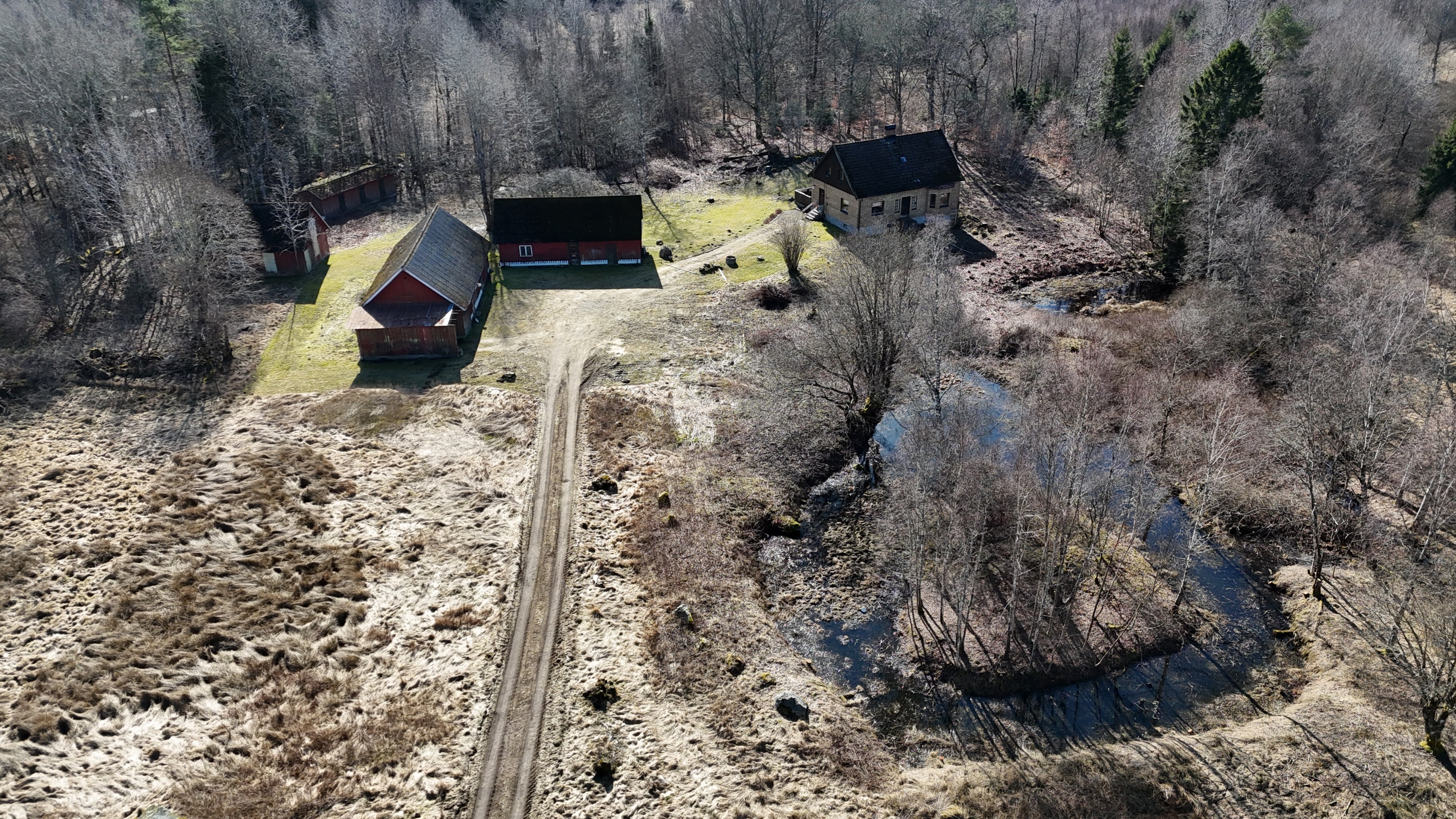 Gård med villa från 1925 på 117 m² med flera lador och 5 ha mark, egen damm och 5 km till badsjö.