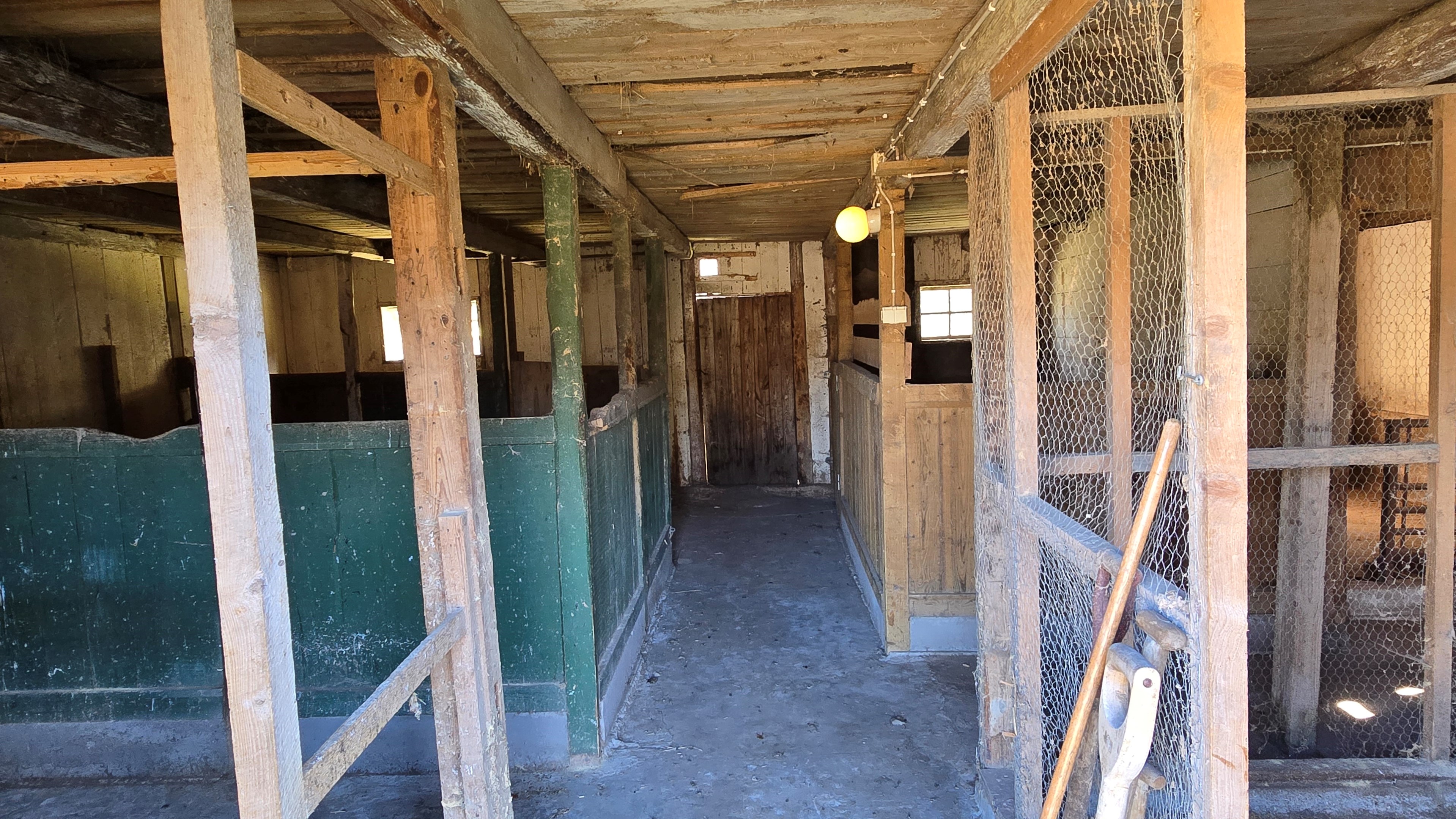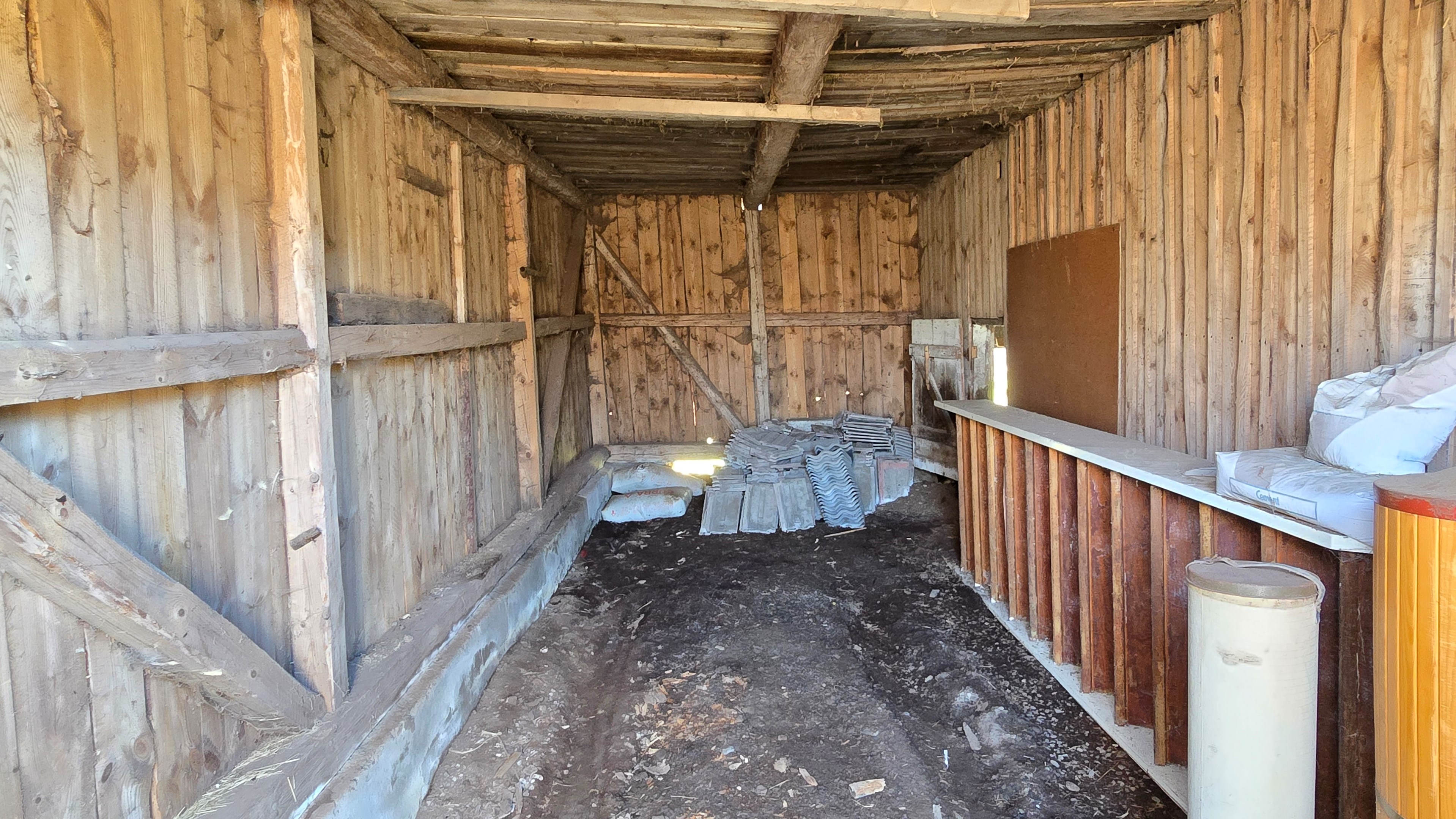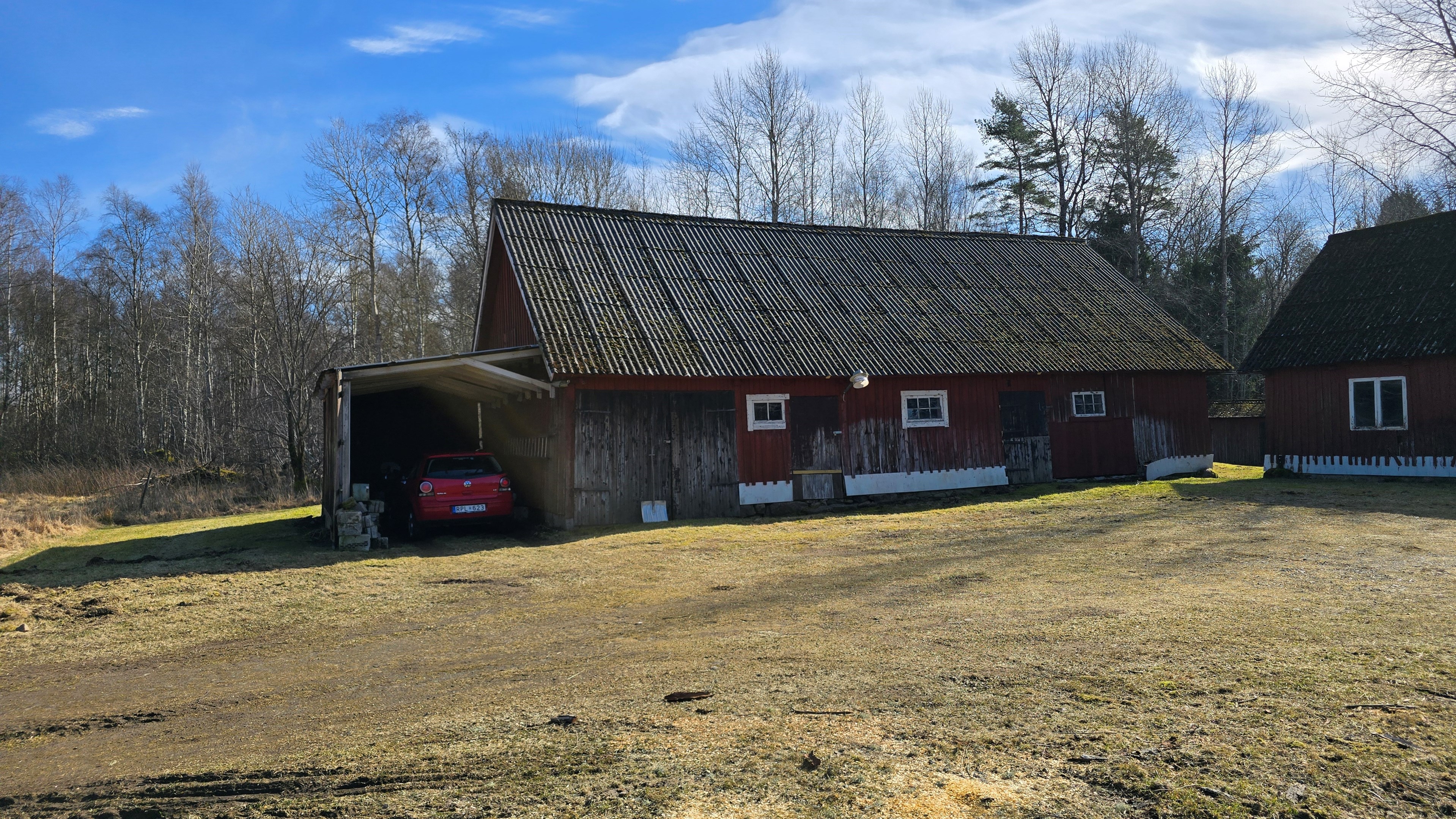 Lada på ca 90 m² + tillbyggd carport med eternittak. Här finns stall med många olika bås, garage med reservtegel och carporten. -