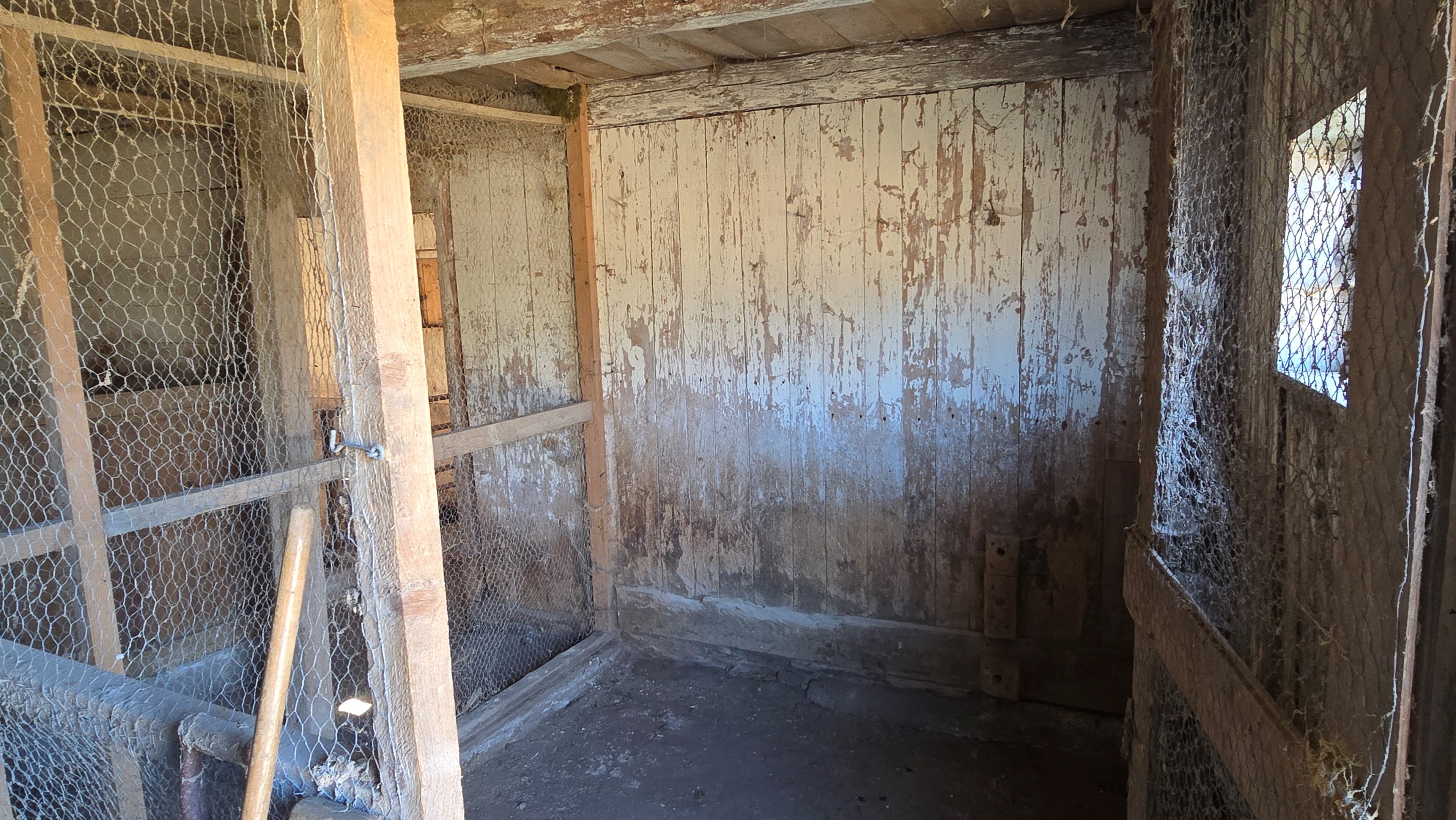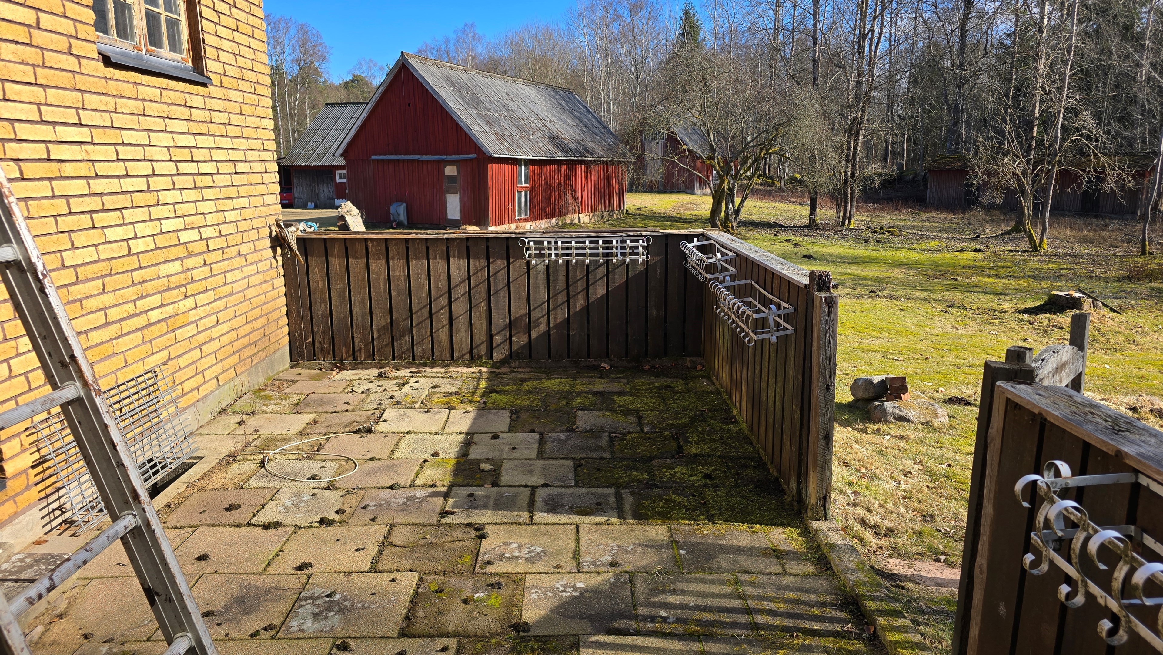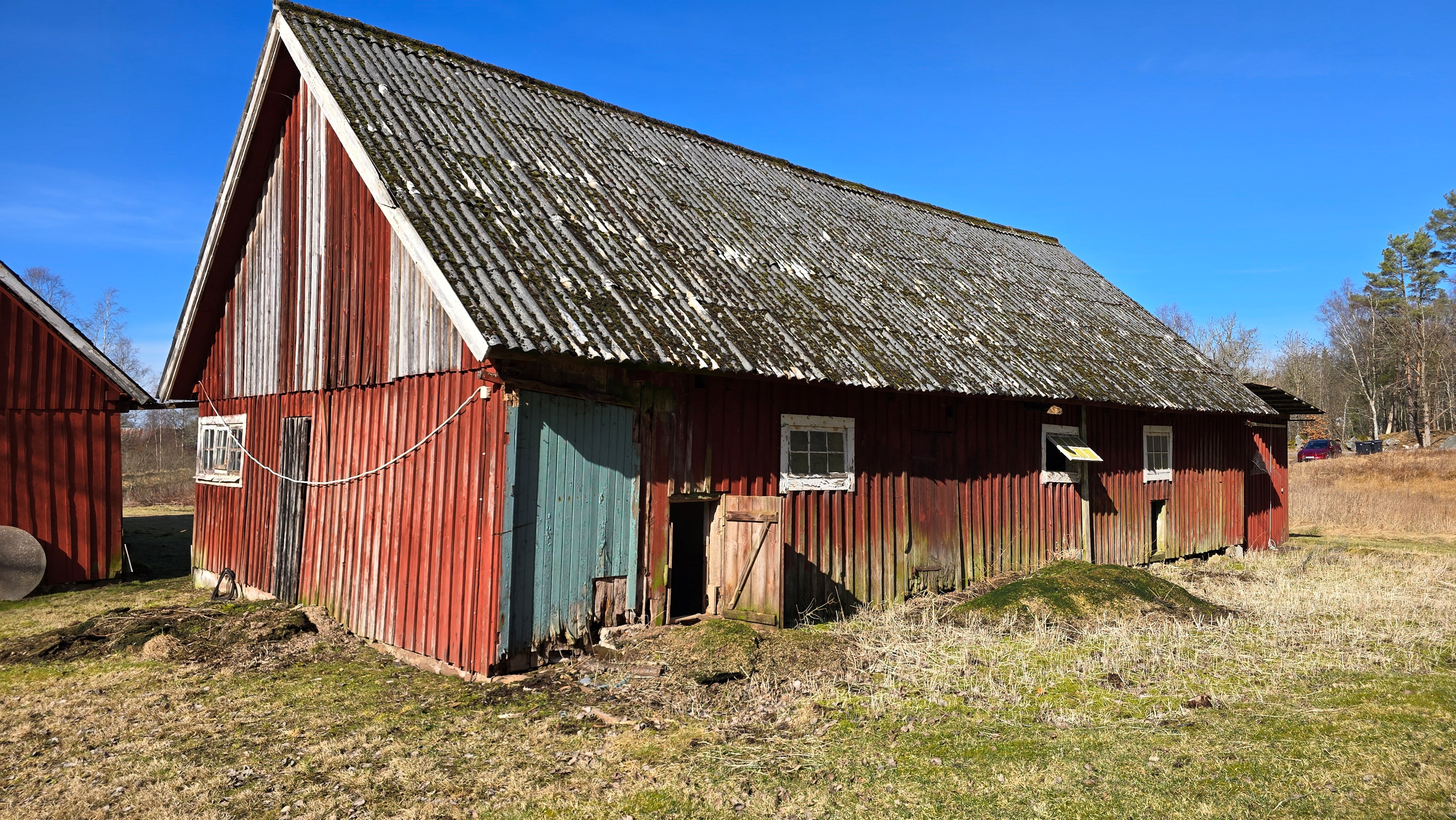 Lada på ca 90 m² + tillbyggd carport med eternittak. Här finns stall med många olika bås, garage med reservtegel och carporten. -