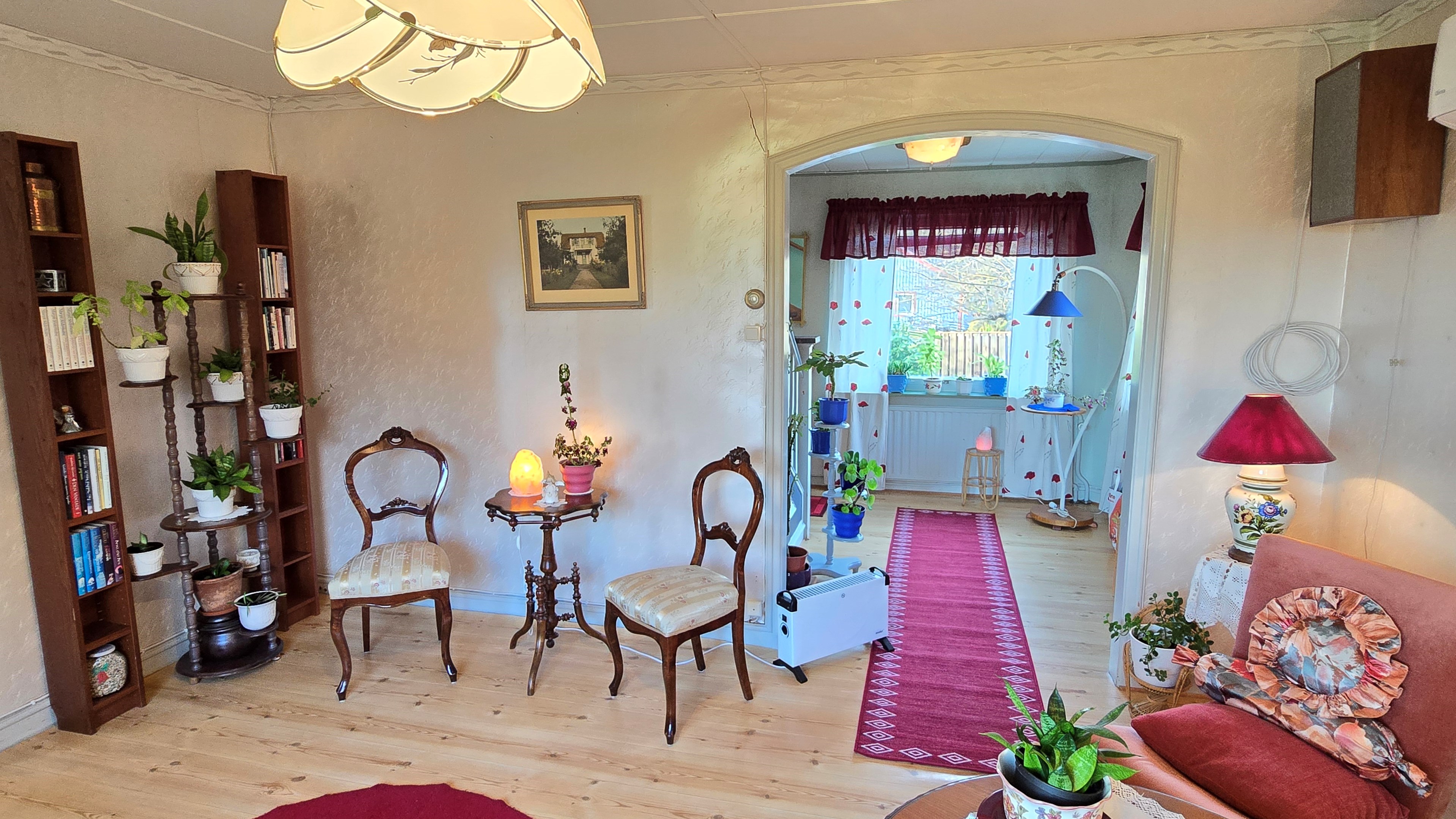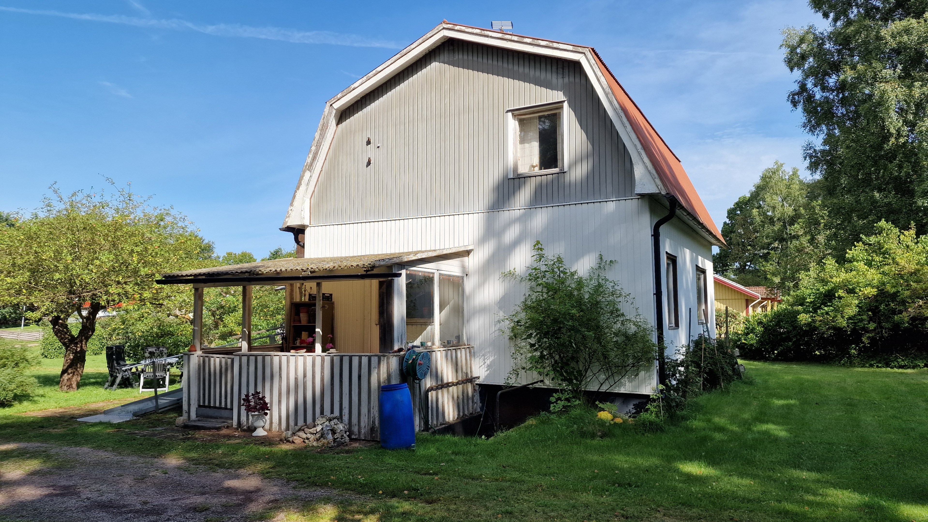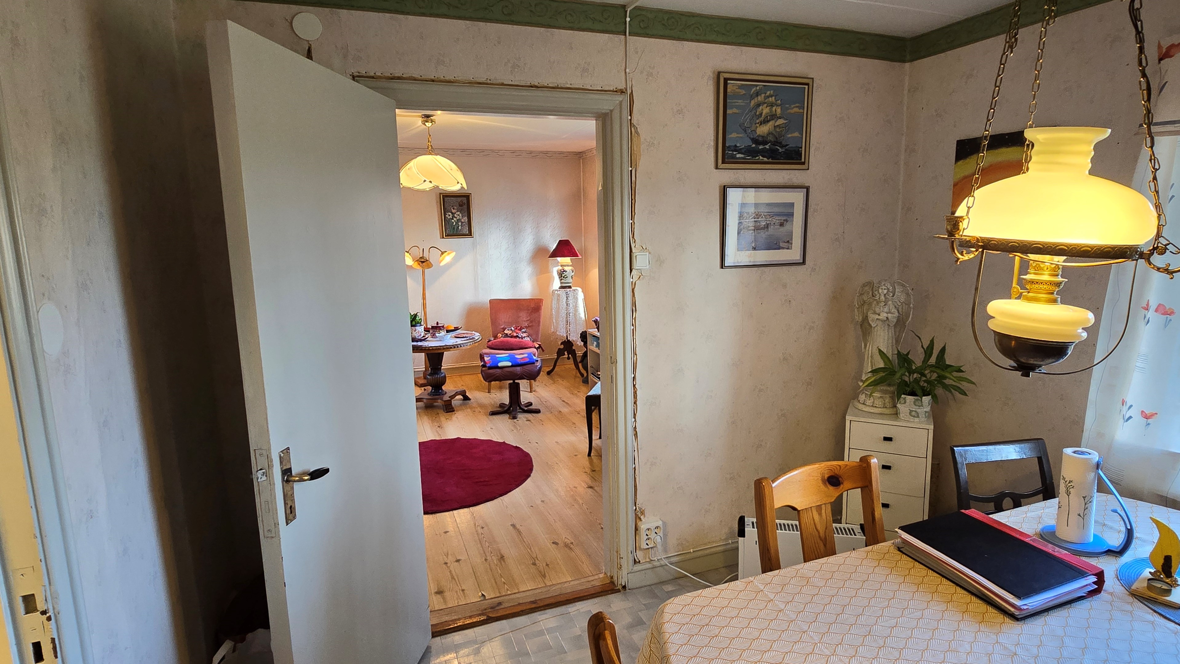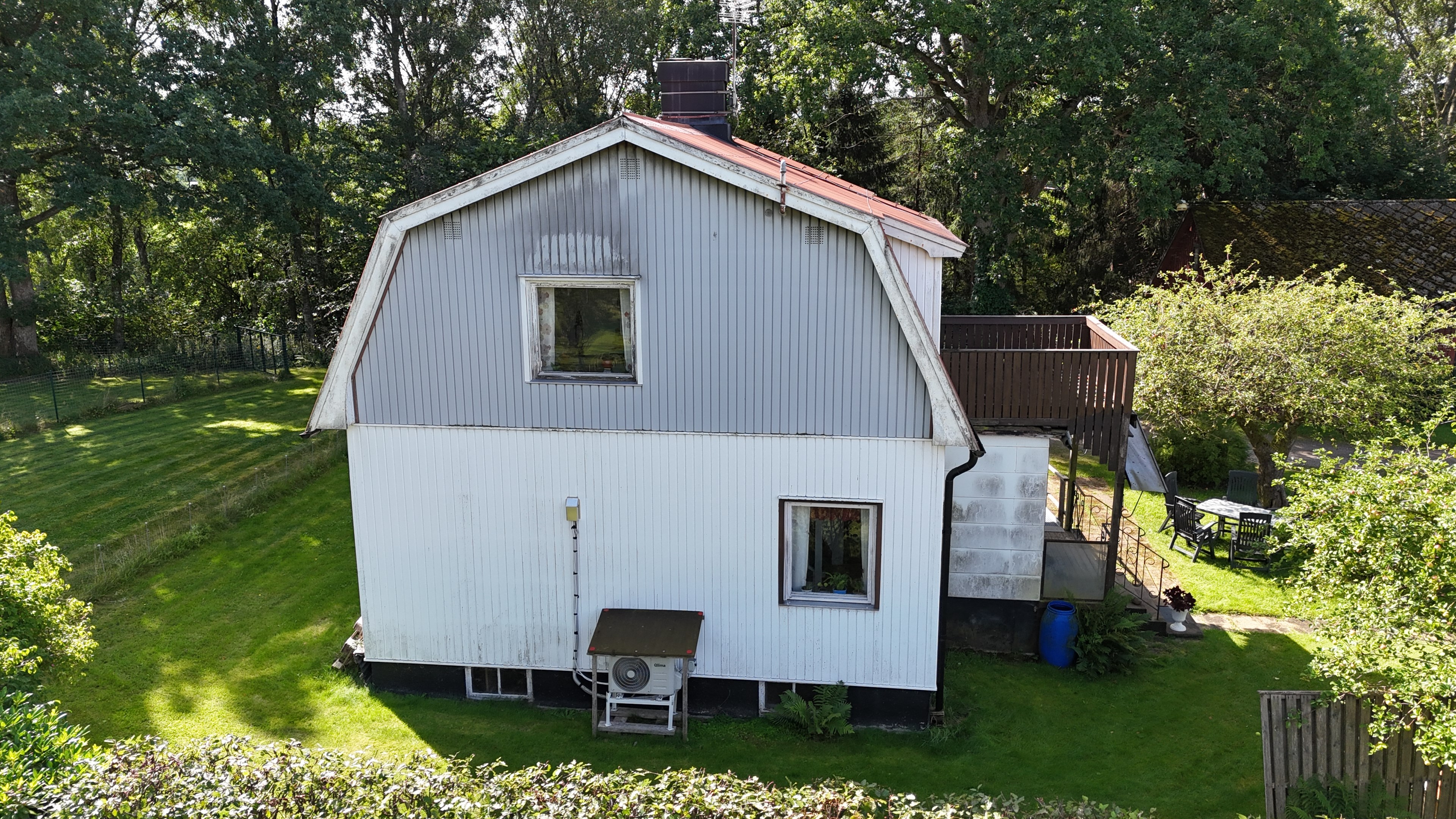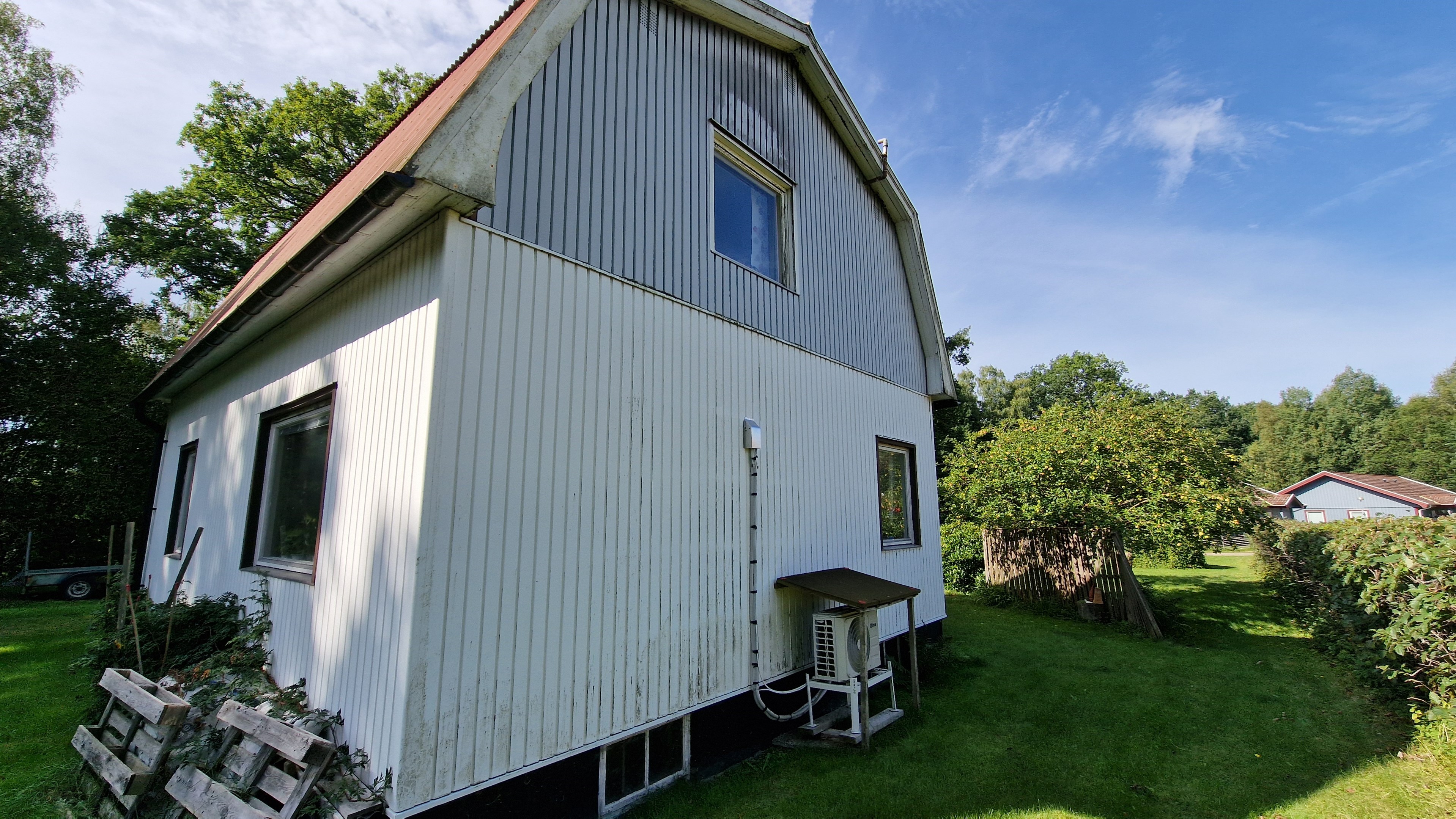 Villa från 1936 i utkanten av Knäred på 90 m2 + källare på 44 m2 och uthus på 50 m2. Kommunalt VA och vattenburen värme samt luftvärmepump. Kosmetiskt renoveringsbehov, men kan användas direkt och förbättras efterhand. 1 513 m2 tomt som det sista på vägen, 45 m. från Lagan. Ca. 1 km. från utomhus pool, vandringsleder, matbutik, skola, vårdcentral m.m. Filmvisning: https://youtu.be/Nx7RkrjWiyM Skansvägen 15 i Knäred är en villa från 1936 på ca. 90 m2 boyta + ca. 44 m2 källare. Härutöver finns en 8 m2 balkong i västerläge och en täckt terrass i söderläge på ca. 10 m2. Huset är plastbeklätt och en liten sektion vid entrén har eternit. På taket ligger ett äldre men tätt plåttak. Huset är väldigt lätt att underhålla, då ev. alger mm. lätt kan tvättas av plastklädseln. En bit hängränna saknas på kupan vid balkongen. Huset renoverades på 1990:talet, men det är dags att renovera igen, även om huset fungerar som det är och kan förbättras lite efterhand. Dubbelglasfönster i hela huset och huset är väl isolerat, så det är lätt att värma upp. Veto ved/pellets panna i källaren från 1990 med 500 liters ackumulatortank från 1993. Därutöver luftvärmepump från 2021. Alla elledningar och kontakter i huset är utbytta 2022 med nytt säkringsskåp med automatsäkringar och jordfelsbrytare. Kommunalt vatten och avlopp. Huset består av hall med laminatgolv (trä under), tretex i taket, träpanel på väggarna och trappa till källaren. Kök med laminatgolv, gott om skåp, diskbänk, elspis med keramisk häll (ca. 2014), spisfläkt, mikro och kyl/frys (2022). Matsal med plastmatta på golvet och tretex i taket. Vardagsrum med plastmatta, tretex i taket, luftvärmepumpen och valv som leder till möblerbart trapphallsrum med trappa till övervåningen. På övervåningen finns möblerbar trapphall med plastmatta på golvet, dörr till balkong i västerläge, toalett med WC och handfat (nya medföljer, men ej monterade) och en garderob bredvid toaletten, så det finns plats att bygga ett litet badrum i framtiden. Kontor eller sovrum med plastmatta på golvet, inbyggd garderob och valv in till ännu ett rum som nu används till lager. Man skulle lätt kunna dela upp detta i två separata rum vid behov. Sovrum med plastmatta på golvet, gott om plats för dubbelsäng och många inbyggda garderober. I källaren finns badrum från 1990:talet med våtrumsmatta på golv och väggar, WC, handfat och dusch. Badrummet skulle behöva renoveras, men fungerar som det är. Två skafferier. Pannrum med ved/pellets panna, ackumulatortank, pelletsförråd och två extra frysar. Tvättstuga med tvättmaskin, torktumlare, extra varmvattensberedare till när man inte använder pannan och en dörr direkt till trädgården. Huset säljs som utgångspunkt utan inventarier, men vissa möbler, verktyg och redskap kan köpas till eller medfölja, enl. önskemål och avtal med säljaren. Ut över huset finns här ett rejält uthus/liten lada på ca. 50 m2 + tillbyggt skjul på baksidan och på framsidan och ett garage och lagringsplats i källaren. Äldre eternittak. I uthuset finns verkstadsrum och gott om plats för lagring. Maskiner som står i och utanför uthuset kommer att tas bort innan tillträde. 1 513 m2 (friköpt) trädgårdstomt för ändan av Skansvägen, där marken sluttar brant ner till Lagan precis utanför tomten. Marken mellan tomten och ån ägs av kommunen och det är ok att tunna ut i buskar och snår, men man får inte fälla träd. En liten stig har fört ner till ån tidigare, men den är nu i stort sett borta, så det kan vara utmanande att gå raka vägen ner till ån från huset. Det finns dock flera stigar ner till ån och ca. 1 km. härifrån finns Flammabadet utomhus pool, där det även finns en liten strand och bålplats vid Lagan. På tomten finns gott om parkeringsplats, gräsmatta, äppelträd, körsbärsträd, rhododendron och björnbär. Träden ger mycket frukt. Väg 15 löper ca. 600 m. från huset, på andra sidan ån och den kan höras, beroende på väder, vind och årstid. På andra sidan väg 15 löper även en järnväg, "Markarydsbanan", och det planeras att bygga en station i Knäred, så man kan ta tåget in till Halmstad eller Hässleholm. Enligt planen ska detta vara klart till 2028. Vid Flammabadet, ca. 1 km. från huset finns även tennisbanor, campingplats och en naturskön vandringsled. Ca. 2 km. till Krokån, Kvarnfallet och den nya vandringsleden, "Krokåslingan", som hänger ihop med Prästaskogens naturreservat och ny gångbro över Krokån. Här ligger även Kvarnen i Knäred, som ibland håller musikarrangemang och sommarcafé. Knäred samhälle har ca. 1200 invånare och det finns bl.a. bra Coop matbutik, Hotell 1613 med restaurang, pizzeria, järnaffär, blomsterbutik, loppis, vårdcentral, skola och "Flammabadet" förstås. Området i stort bjuder också på många natur- och kulturupplevelser med ca. 7 km. till Kulturreservat Bollaltebygget med kringbyggd museumsgård på 1600-talet, ca. 8 km. till "Vippentorpet" hembygdsgård med våffelcafé om sommaren och ca. 7 km. till Hjörneredssjöarna med kanotuthyrning, vandringsleder, fricampning och flera badplatser. Ca. 10 km. till naturreservat Mästocka ljunghed och fin badplats i Björsjön och omkring samma avstånd till det stora naturreservatet Rönnö. Ca. 10 km. till Skogaby Golfklubb. Ca. 17 km. till Laholm samhälle och ca. 25 km. till havet, Mellbystrand och till Vallåsen Bike-Park på Hallandsås och till Kungsbyggets Äventyrspark med zipline och rodelbana sommartid. Ca. 35 km. till Halmstad och färjan till Grenå. Ca. 75 km. från Helsingborg och ca. 135 km. från Malmö.