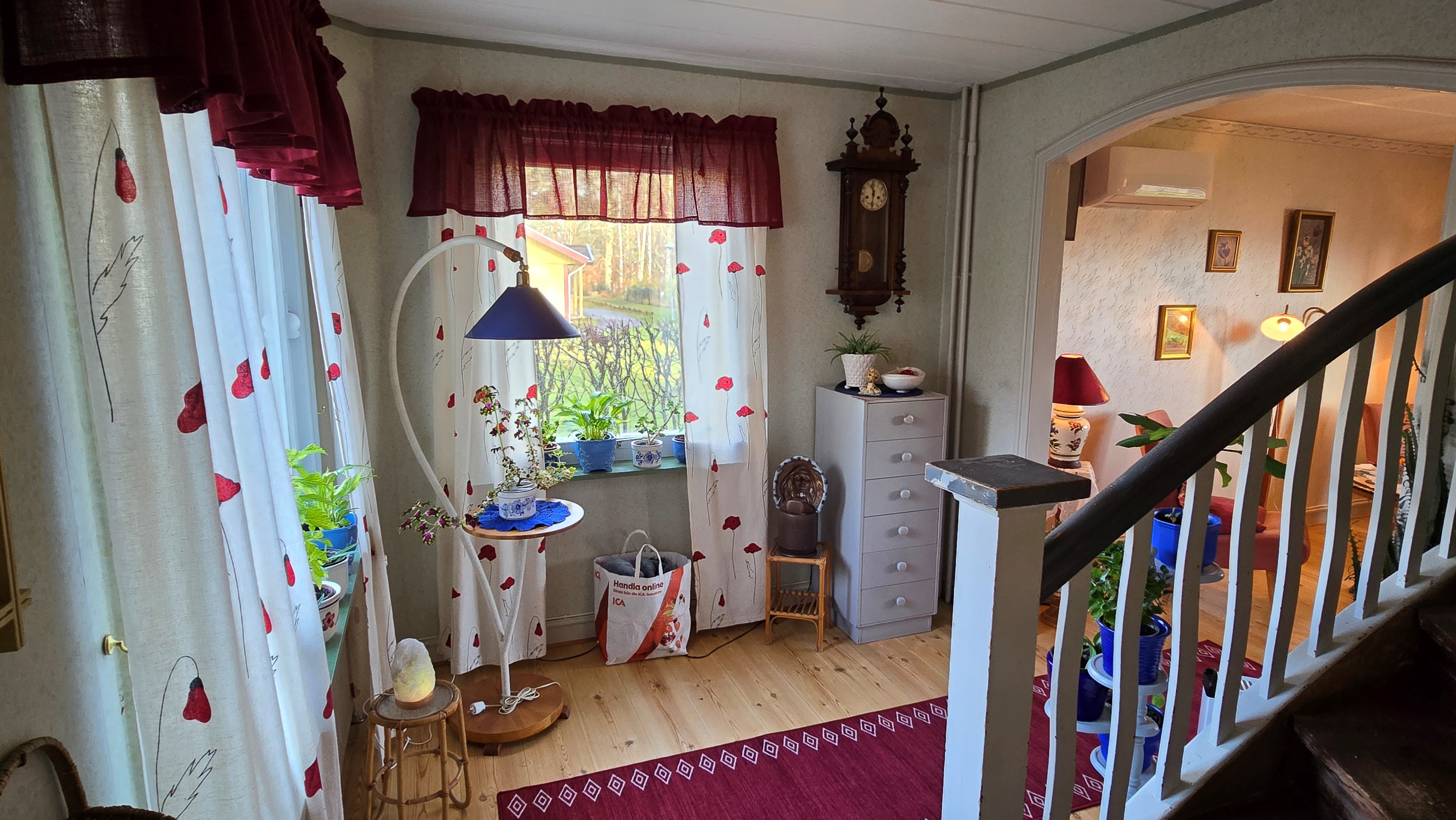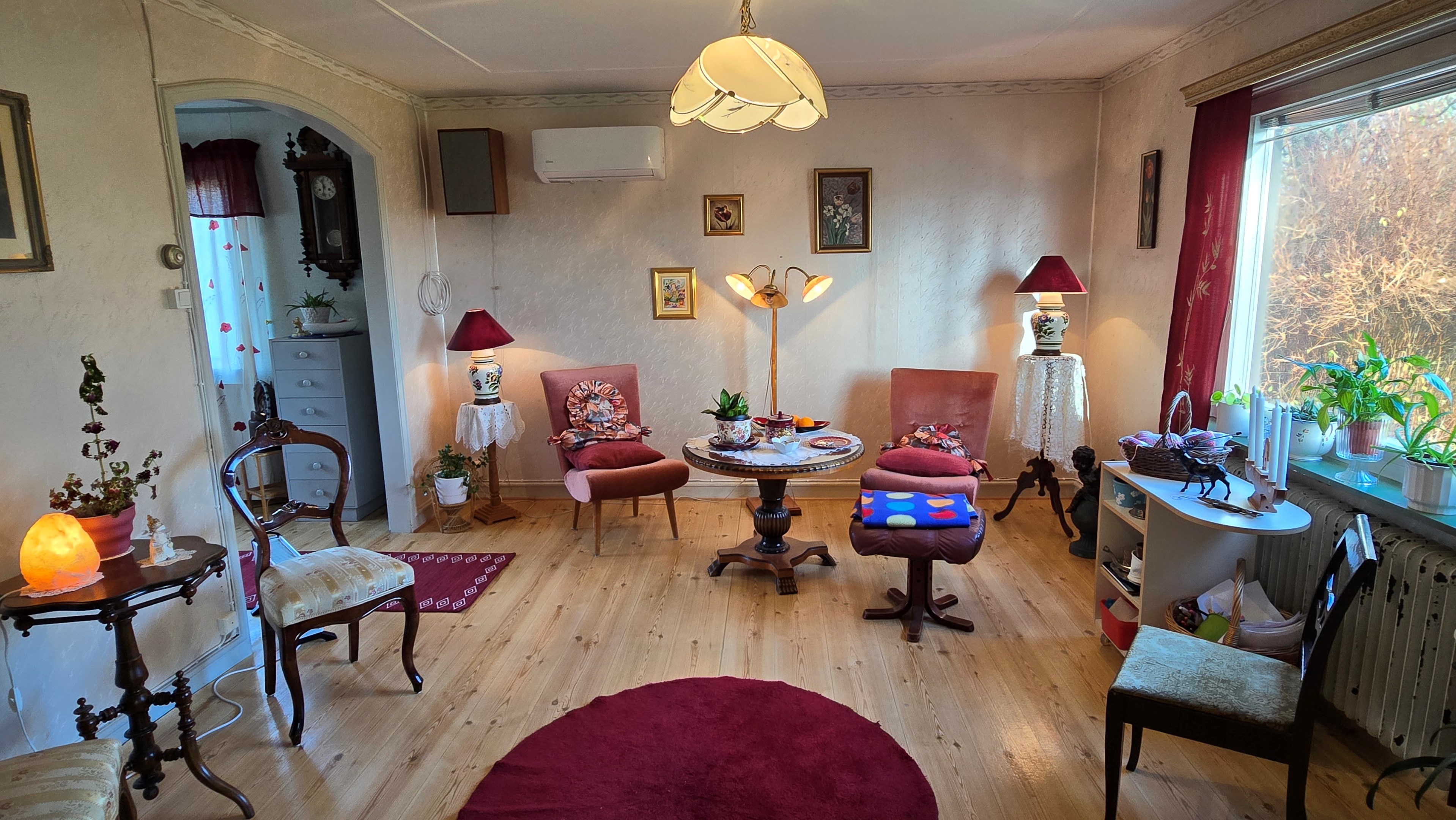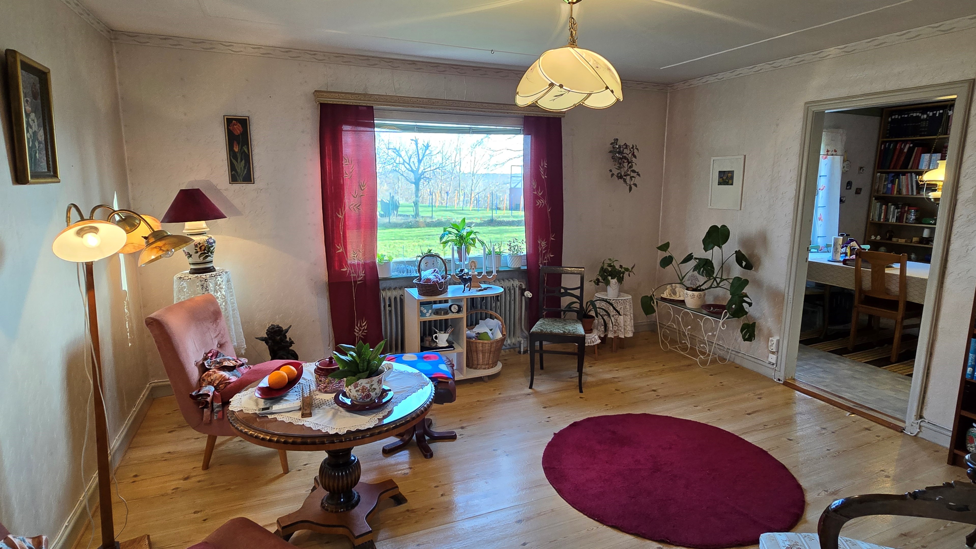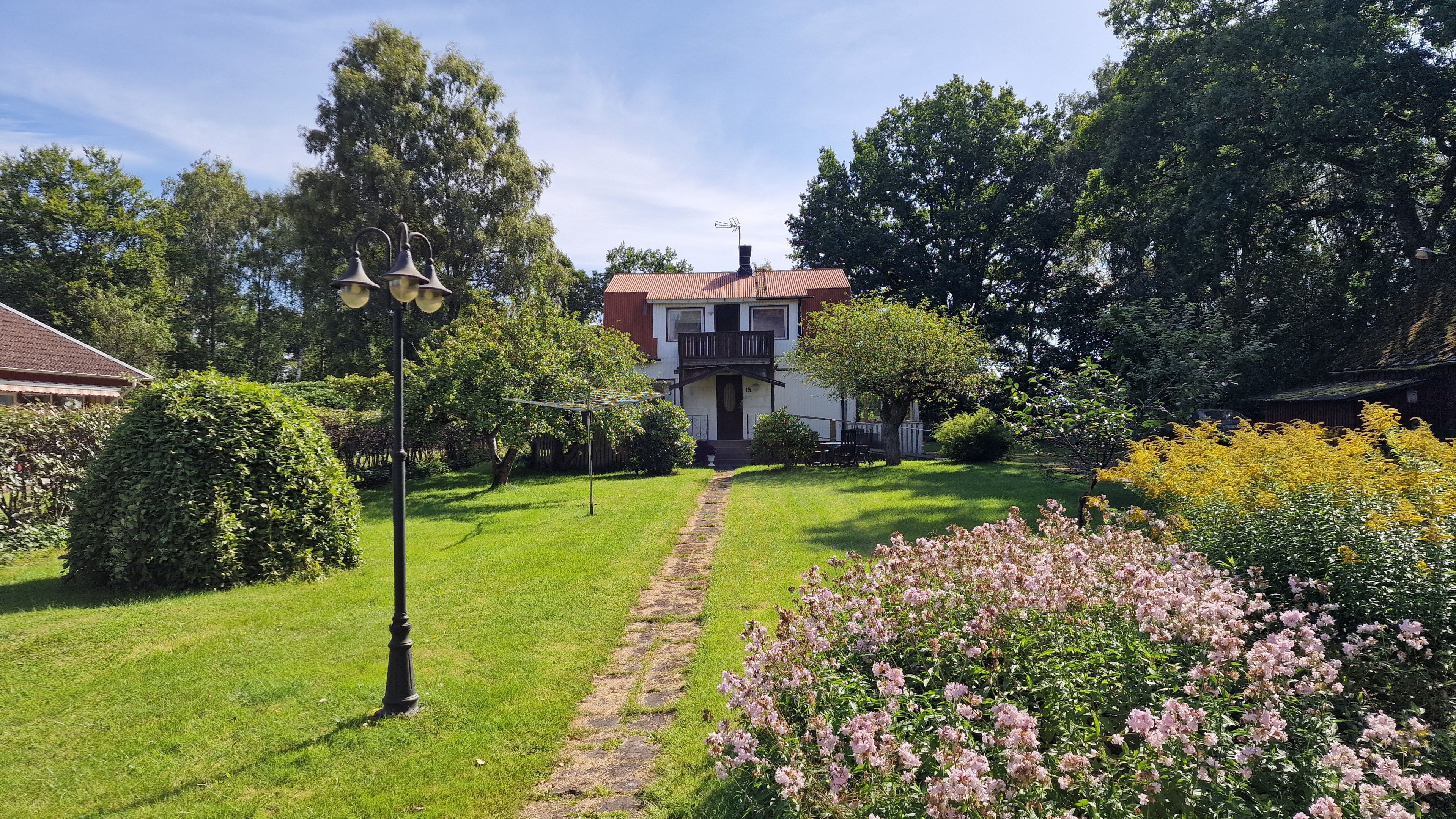 Villa från 1936 i utkanten av Knäred på 90 m2 + källare på 44 m2 och uthus på 50 m2. Kommunalt VA och vattenburen värme samt luftvärmepump. Kosmetiskt renoveringsbehov, men kan användas direkt och förbättras efterhand. 1 513 m2 tomt som det sista på vägen, 45 m. från Lagan. Ca. 1 km. från utomhus pool, vandringsleder, matbutik, skola, vårdcentral m.m. Filmvisning: https://youtu.be/Nx7RkrjWiyM Skansvägen 15 i Knäred är en villa från 1936 på ca. 90 m2 boyta + ca. 44 m2 källare. Härutöver finns en 8 m2 balkong i västerläge och en täckt terrass i söderläge på ca. 10 m2. Huset är plastbeklätt och en liten sektion vid entrén har eternit. På taket ligger ett äldre men tätt plåttak. Huset är väldigt lätt att underhålla, då ev. alger mm. lätt kan tvättas av plastklädseln. En bit hängränna saknas på kupan vid balkongen. Huset renoverades på 1990:talet, men det är dags att renovera igen, även om huset fungerar som det är och kan förbättras lite efterhand. Dubbelglasfönster i hela huset och huset är väl isolerat, så det är lätt att värma upp. Veto ved/pellets panna i källaren från 1990 med 500 liters ackumulatortank från 1993. Därutöver luftvärmepump från 2021. Alla elledningar och kontakter i huset är utbytta 2022 med nytt säkringsskåp med automatsäkringar och jordfelsbrytare. Kommunalt vatten och avlopp. Huset består av hall med laminatgolv (trä under), tretex i taket, träpanel på väggarna och trappa till källaren. Kök med laminatgolv, gott om skåp, diskbänk, elspis med keramisk häll (ca. 2014), spisfläkt, mikro och kyl/frys (2022). Matsal med plastmatta på golvet och tretex i taket. Vardagsrum med plastmatta, tretex i taket, luftvärmepumpen och valv som leder till möblerbart trapphallsrum med trappa till övervåningen. På övervåningen finns möblerbar trapphall med plastmatta på golvet, dörr till balkong i västerläge, toalett med WC och handfat (nya medföljer, men ej monterade) och en garderob bredvid toaletten, så det finns plats att bygga ett litet badrum i framtiden. Kontor eller sovrum med plastmatta på golvet, inbyggd garderob och valv in till ännu ett rum som nu används till lager. Man skulle lätt kunna dela upp detta i två separata rum vid behov. Sovrum med plastmatta på golvet, gott om plats för dubbelsäng och många inbyggda garderober. I källaren finns badrum från 1990:talet med våtrumsmatta på golv och väggar, WC, handfat och dusch. Badrummet skulle behöva renoveras, men fungerar som det är. Två skafferier. Pannrum med ved/pellets panna, ackumulatortank, pelletsförråd och två extra frysar. Tvättstuga med tvättmaskin, torktumlare, extra varmvattensberedare till när man inte använder pannan och en dörr direkt till trädgården. Huset säljs som utgångspunkt utan inventarier, men vissa möbler, verktyg och redskap kan köpas till eller medfölja, enl. önskemål och avtal med säljaren. Ut över huset finns här ett rejält uthus/liten lada på ca. 50 m2 + tillbyggt skjul på baksidan och på framsidan och ett garage och lagringsplats i källaren. Äldre eternittak. I uthuset finns verkstadsrum och gott om plats för lagring. Maskiner som står i och utanför uthuset kommer att tas bort innan tillträde. 1 513 m2 (friköpt) trädgårdstomt för ändan av Skansvägen, där marken sluttar brant ner till Lagan precis utanför tomten. Marken mellan tomten och ån ägs av kommunen och det är ok att tunna ut i buskar och snår, men man får inte fälla träd. En liten stig har fört ner till ån tidigare, men den är nu i stort sett borta, så det kan vara utmanande att gå raka vägen ner till ån från huset. Det finns dock flera stigar ner till ån och ca. 1 km. härifrån finns Flammabadet utomhus pool, där det även finns en liten strand och bålplats vid Lagan. På tomten finns gott om parkeringsplats, gräsmatta, äppelträd, körsbärsträd, rhododendron och björnbär. Träden ger mycket frukt. Väg 15 löper ca. 600 m. från huset, på andra sidan ån och den kan höras, beroende på väder, vind och årstid. På andra sidan väg 15 löper även en järnväg, "Markarydsbanan", och det planeras att bygga en station i Knäred, så man kan ta tåget in till Halmstad eller Hässleholm. Enligt planen ska detta vara klart till 2028. Vid Flammabadet, ca. 1 km. från huset finns även tennisbanor, campingplats och en naturskön vandringsled. Ca. 2 km. till Krokån, Kvarnfallet och den nya vandringsleden, "Krokåslingan", som hänger ihop med Prästaskogens naturreservat och ny gångbro över Krokån. Här ligger även Kvarnen i Knäred, som ibland håller musikarrangemang och sommarcafé. Knäred samhälle har ca. 1200 invånare och det finns bl.a. bra Coop matbutik, Hotell 1613 med restaurang, pizzeria, järnaffär, blomsterbutik, loppis, vårdcentral, skola och "Flammabadet" förstås. Området i stort bjuder också på många natur- och kulturupplevelser med ca. 7 km. till Kulturreservat Bollaltebygget med kringbyggd museumsgård på 1600-talet, ca. 8 km. till "Vippentorpet" hembygdsgård med våffelcafé om sommaren och ca. 7 km. till Hjörneredssjöarna med kanotuthyrning, vandringsleder, fricampning och flera badplatser. Ca. 10 km. till naturreservat Mästocka ljunghed och fin badplats i Björsjön och omkring samma avstånd till det stora naturreservatet Rönnö. Ca. 10 km. till Skogaby Golfklubb. Ca. 17 km. till Laholm samhälle och ca. 25 km. till havet, Mellbystrand och till Vallåsen Bike-Park på Hallandsås och till Kungsbyggets Äventyrspark med zipline och rodelbana sommartid. Ca. 35 km. till Halmstad och färjan till Grenå. Ca. 75 km. från Helsingborg och ca. 135 km. från Malmö.