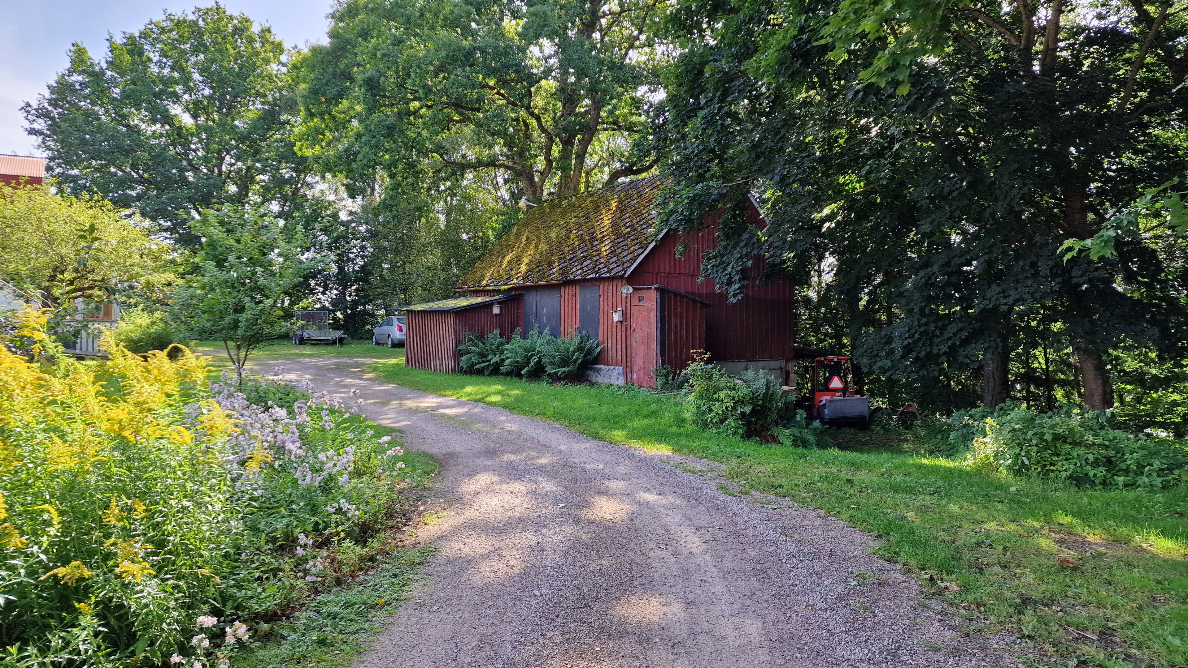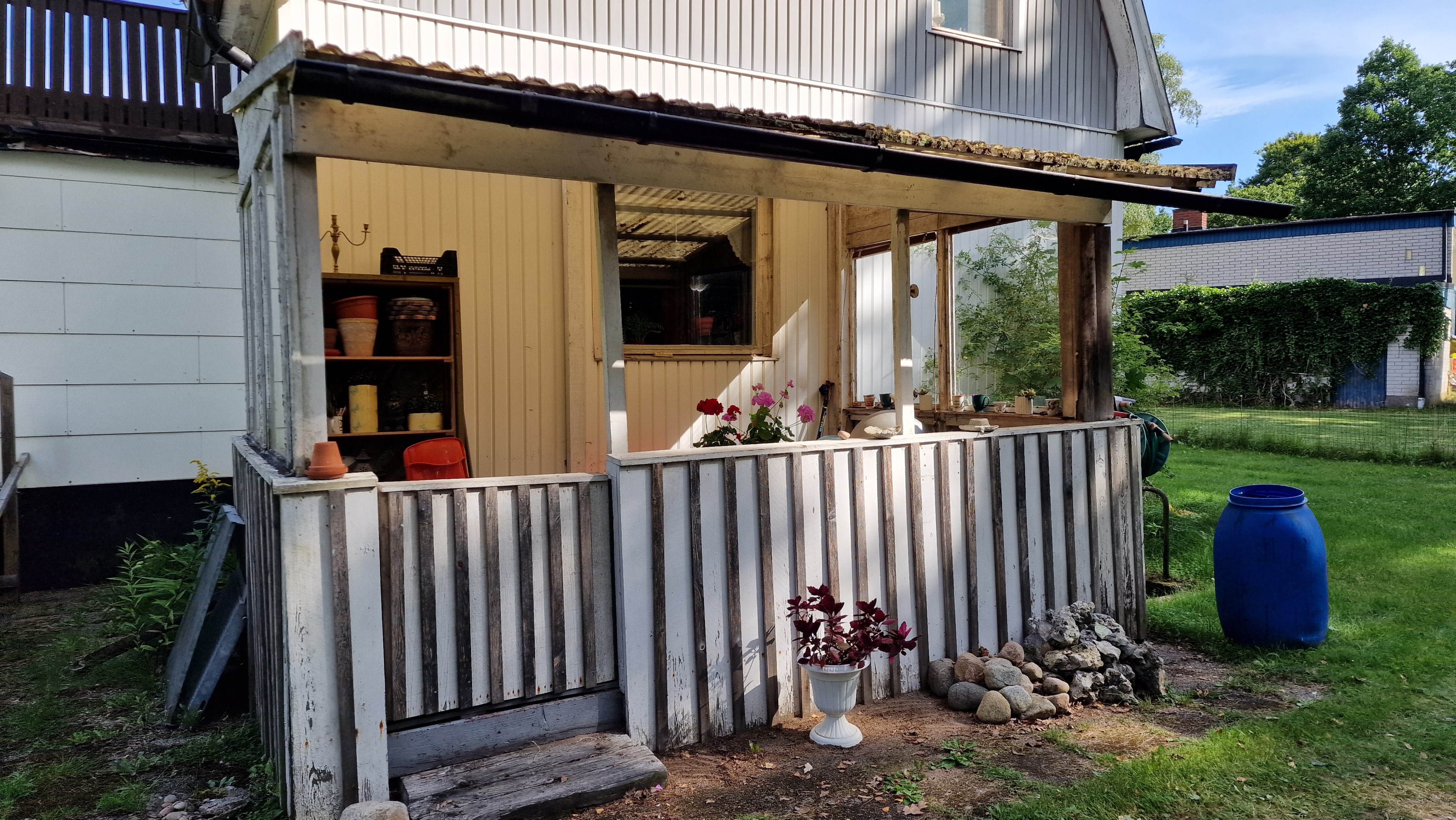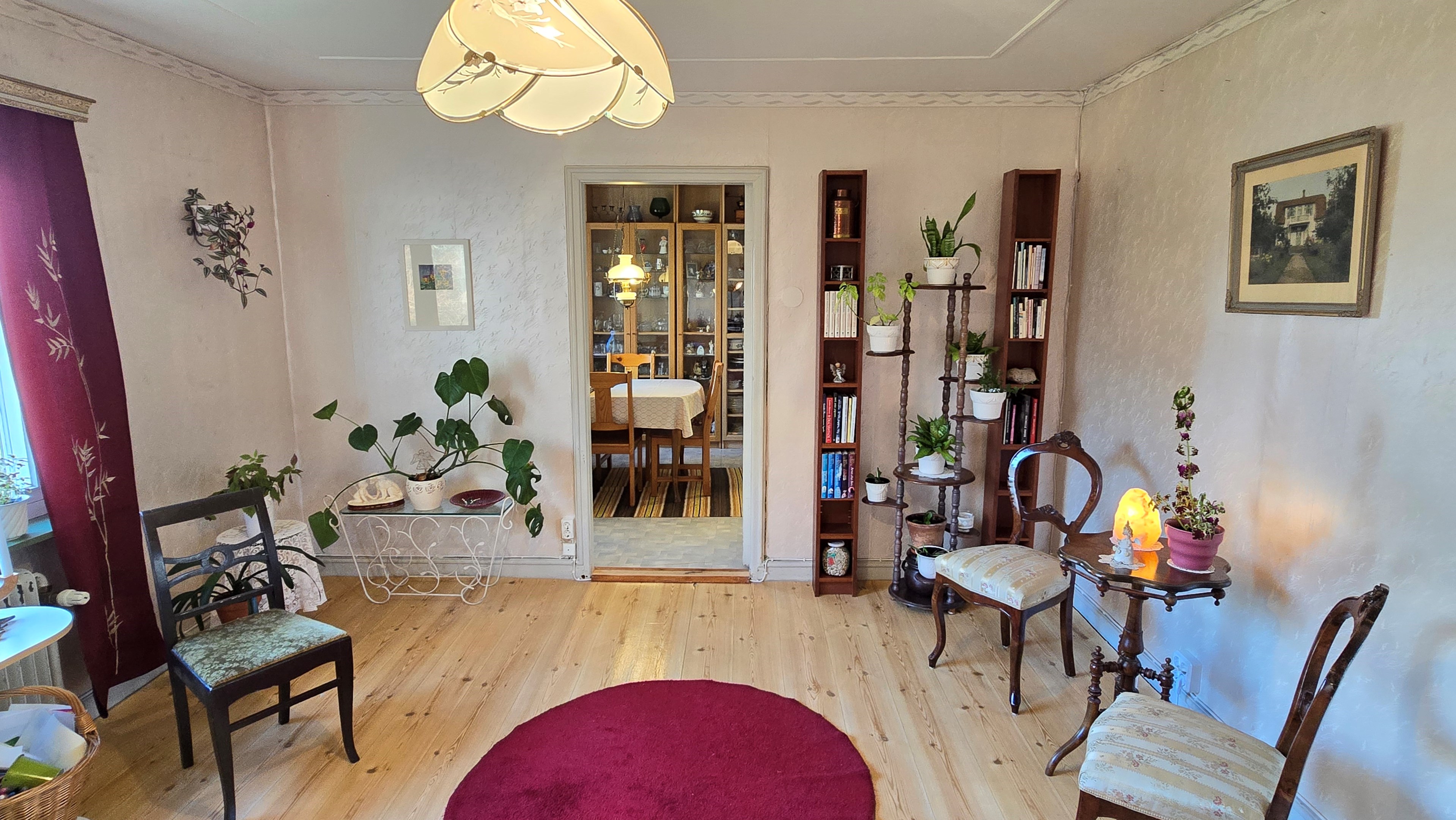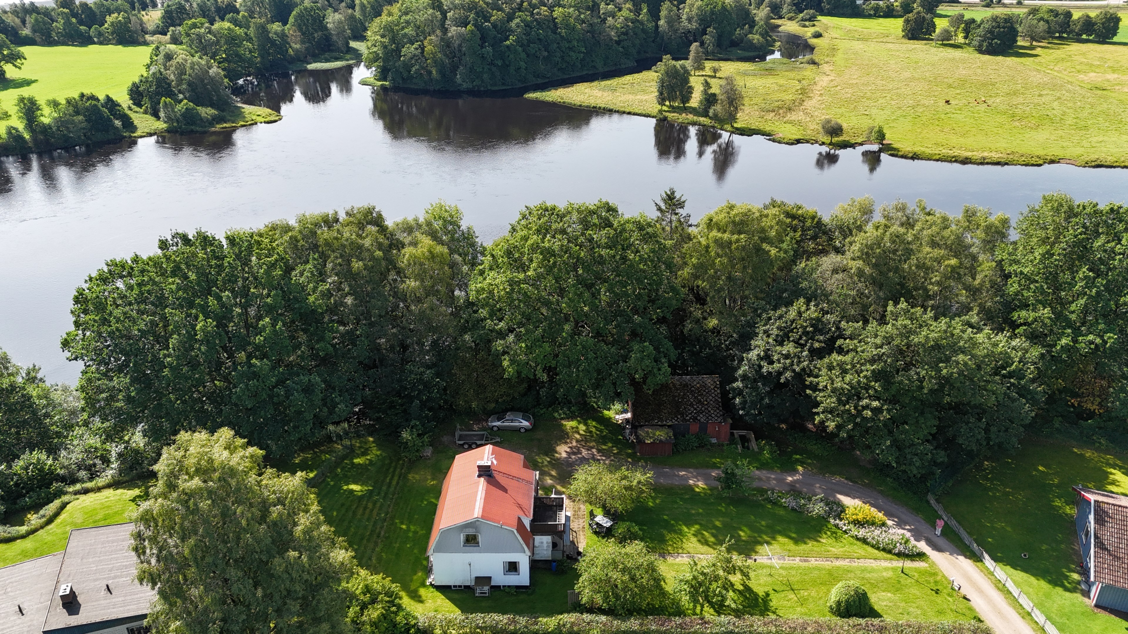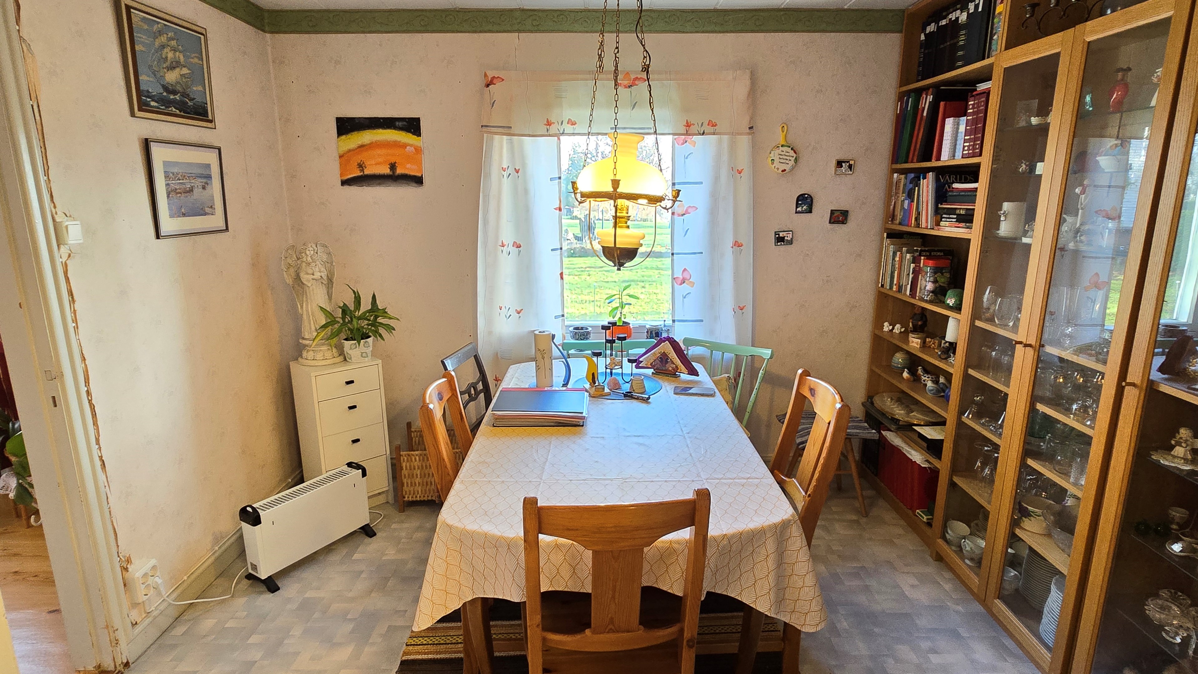 Villa från 1936 i utkanten av Knäred på 90 m2 + källare på 44 m2 och uthus på 50 m2. Kommunalt VA och vattenburen värme samt luftvärmepump. Kosmetiskt renoveringsbehov, men kan användas direkt och förbättras efterhand. 1 513 m2 tomt som det sista på vägen, 45 m. från Lagan. Ca. 1 km. från utomhus pool, vandringsleder, matbutik, skola, vårdcentral m.m. Filmvisning: https://youtu.be/Nx7RkrjWiyM Skansvägen 15 i Knäred är en villa från 1936 på ca. 90 m2 boyta + ca. 44 m2 källare. Härutöver finns en 8 m2 balkong i västerläge och en täckt terrass i söderläge på ca. 10 m2. Huset är plastbeklätt och en liten sektion vid entrén har eternit. På taket ligger ett äldre men tätt plåttak. Huset är väldigt lätt att underhålla, då ev. alger mm. lätt kan tvättas av plastklädseln. En bit hängränna saknas på kupan vid balkongen. Huset renoverades på 1990:talet, men det är dags att renovera igen, även om huset fungerar som det är och kan förbättras lite efterhand. Dubbelglasfönster i hela huset och huset är väl isolerat, så det är lätt att värma upp. Veto ved/pellets panna i källaren från 1990 med 500 liters ackumulatortank från 1993. Därutöver luftvärmepump från 2021. Alla elledningar och kontakter i huset är utbytta 2022 med nytt säkringsskåp med automatsäkringar och jordfelsbrytare. Kommunalt vatten och avlopp. Huset består av hall med laminatgolv (trä under), tretex i taket, träpanel på väggarna och trappa till källaren. Kök med laminatgolv, gott om skåp, diskbänk, elspis med keramisk häll (ca. 2014), spisfläkt, mikro och kyl/frys (2022). Matsal med plastmatta på golvet och tretex i taket. Vardagsrum med plastmatta, tretex i taket, luftvärmepumpen och valv som leder till möblerbart trapphallsrum med trappa till övervåningen. På övervåningen finns möblerbar trapphall med plastmatta på golvet, dörr till balkong i västerläge, toalett med WC och handfat (nya medföljer, men ej monterade) och en garderob bredvid toaletten, så det finns plats att bygga ett litet badrum i framtiden. Kontor eller sovrum med plastmatta på golvet, inbyggd garderob och valv in till ännu ett rum som nu används till lager. Man skulle lätt kunna dela upp detta i två separata rum vid behov. Sovrum med plastmatta på golvet, gott om plats för dubbelsäng och många inbyggda garderober. I källaren finns badrum från 1990:talet med våtrumsmatta på golv och väggar, WC, handfat och dusch. Badrummet skulle behöva renoveras, men fungerar som det är. Två skafferier. Pannrum med ved/pellets panna, ackumulatortank, pelletsförråd och två extra frysar. Tvättstuga med tvättmaskin, torktumlare, extra varmvattensberedare till när man inte använder pannan och en dörr direkt till trädgården. Huset säljs som utgångspunkt utan inventarier, men vissa möbler, verktyg och redskap kan köpas till eller medfölja, enl. önskemål och avtal med säljaren. Ut över huset finns här ett rejält uthus/liten lada på ca. 50 m2 + tillbyggt skjul på baksidan och på framsidan och ett garage och lagringsplats i källaren. Äldre eternittak. I uthuset finns verkstadsrum och gott om plats för lagring. Maskiner som står i och utanför uthuset kommer att tas bort innan tillträde. 1 513 m2 (friköpt) trädgårdstomt för ändan av Skansvägen, där marken sluttar brant ner till Lagan precis utanför tomten. Marken mellan tomten och ån ägs av kommunen och det är ok att tunna ut i buskar och snår, men man får inte fälla träd. En liten stig har fört ner till ån tidigare, men den är nu i stort sett borta, så det kan vara utmanande att gå raka vägen ner till ån från huset. Det finns dock flera stigar ner till ån och ca. 1 km. härifrån finns Flammabadet utomhus pool, där det även finns en liten strand och bålplats vid Lagan. På tomten finns gott om parkeringsplats, gräsmatta, äppelträd, körsbärsträd, rhododendron och björnbär. Träden ger mycket frukt. Väg 15 löper ca. 600 m. från huset, på andra sidan ån och den kan höras, beroende på väder, vind och årstid. På andra sidan väg 15 löper även en järnväg, "Markarydsbanan", och det planeras att bygga en station i Knäred, så man kan ta tåget in till Halmstad eller Hässleholm. Enligt planen ska detta vara klart till 2028. Vid Flammabadet, ca. 1 km. från huset finns även tennisbanor, campingplats och en naturskön vandringsled. Ca. 2 km. till Krokån, Kvarnfallet och den nya vandringsleden, "Krokåslingan", som hänger ihop med Prästaskogens naturreservat och ny gångbro över Krokån. Här ligger även Kvarnen i Knäred, som ibland håller musikarrangemang och sommarcafé. Knäred samhälle har ca. 1200 invånare och det finns bl.a. bra Coop matbutik, Hotell 1613 med restaurang, pizzeria, järnaffär, blomsterbutik, loppis, vårdcentral, skola och "Flammabadet" förstås. Området i stort bjuder också på många natur- och kulturupplevelser med ca. 7 km. till Kulturreservat Bollaltebygget med kringbyggd museumsgård på 1600-talet, ca. 8 km. till "Vippentorpet" hembygdsgård med våffelcafé om sommaren och ca. 7 km. till Hjörneredssjöarna med kanotuthyrning, vandringsleder, fricampning och flera badplatser. Ca. 10 km. till naturreservat Mästocka ljunghed och fin badplats i Björsjön och omkring samma avstånd till det stora naturreservatet Rönnö. Ca. 10 km. till Skogaby Golfklubb. Ca. 17 km. till Laholm samhälle och ca. 25 km. till havet, Mellbystrand och till Vallåsen Bike-Park på Hallandsås och till Kungsbyggets Äventyrspark med zipline och rodelbana sommartid. Ca. 35 km. till Halmstad och färjan till Grenå. Ca. 75 km. från Helsingborg och ca. 135 km. från Malmö.