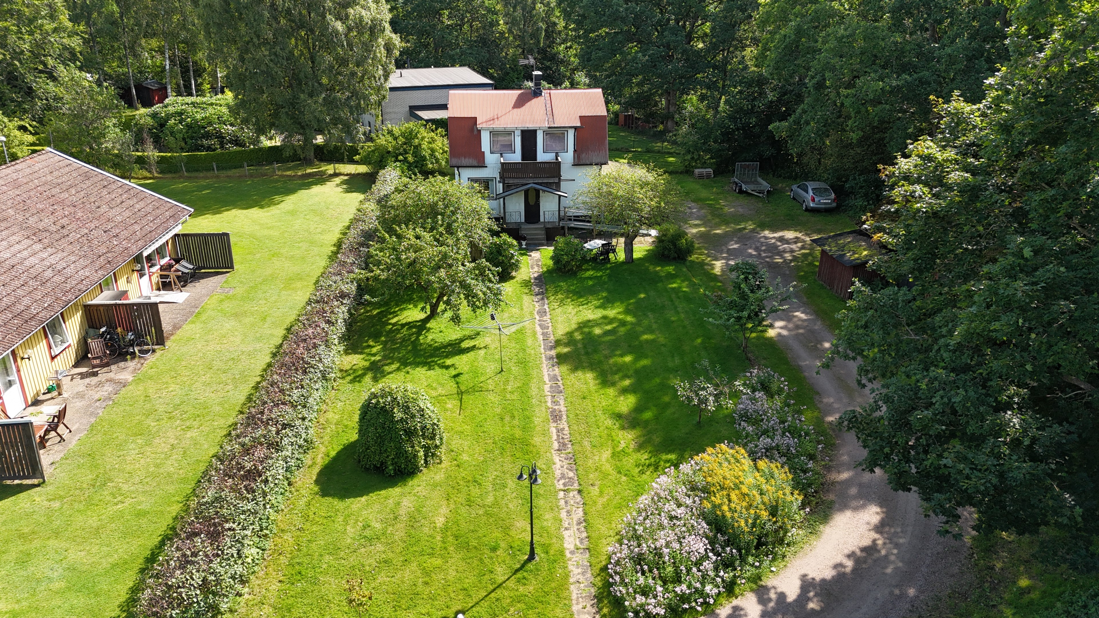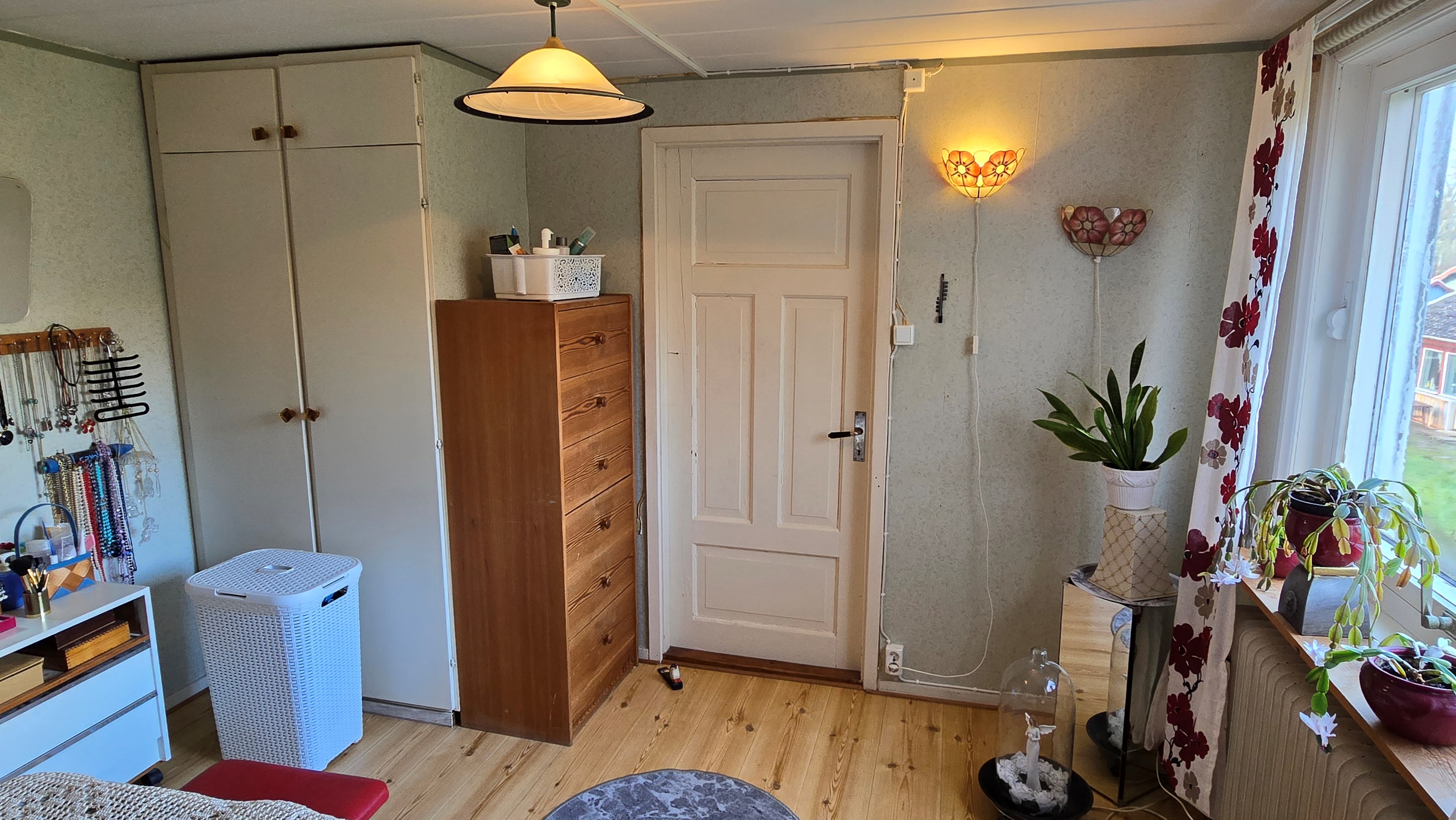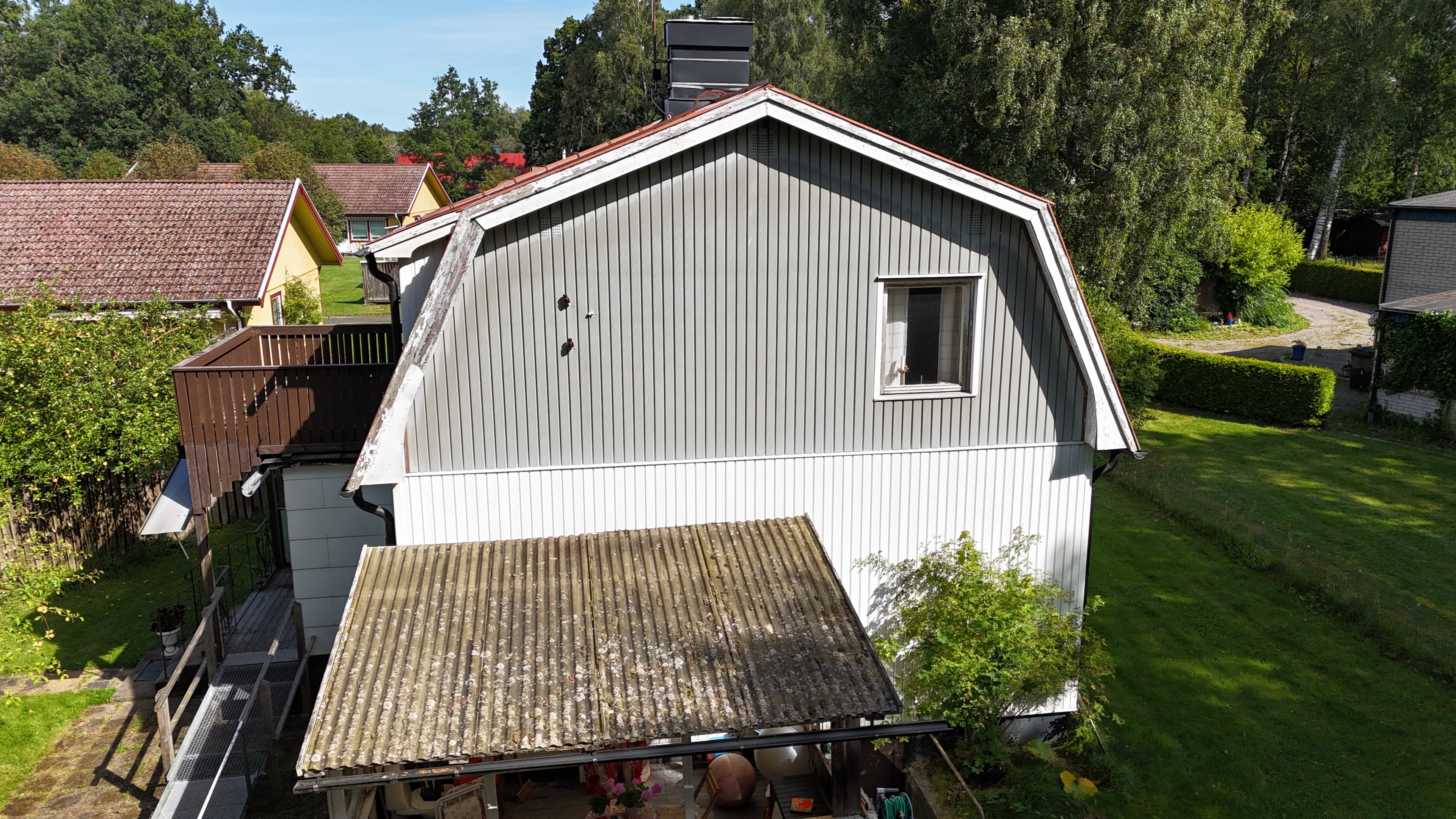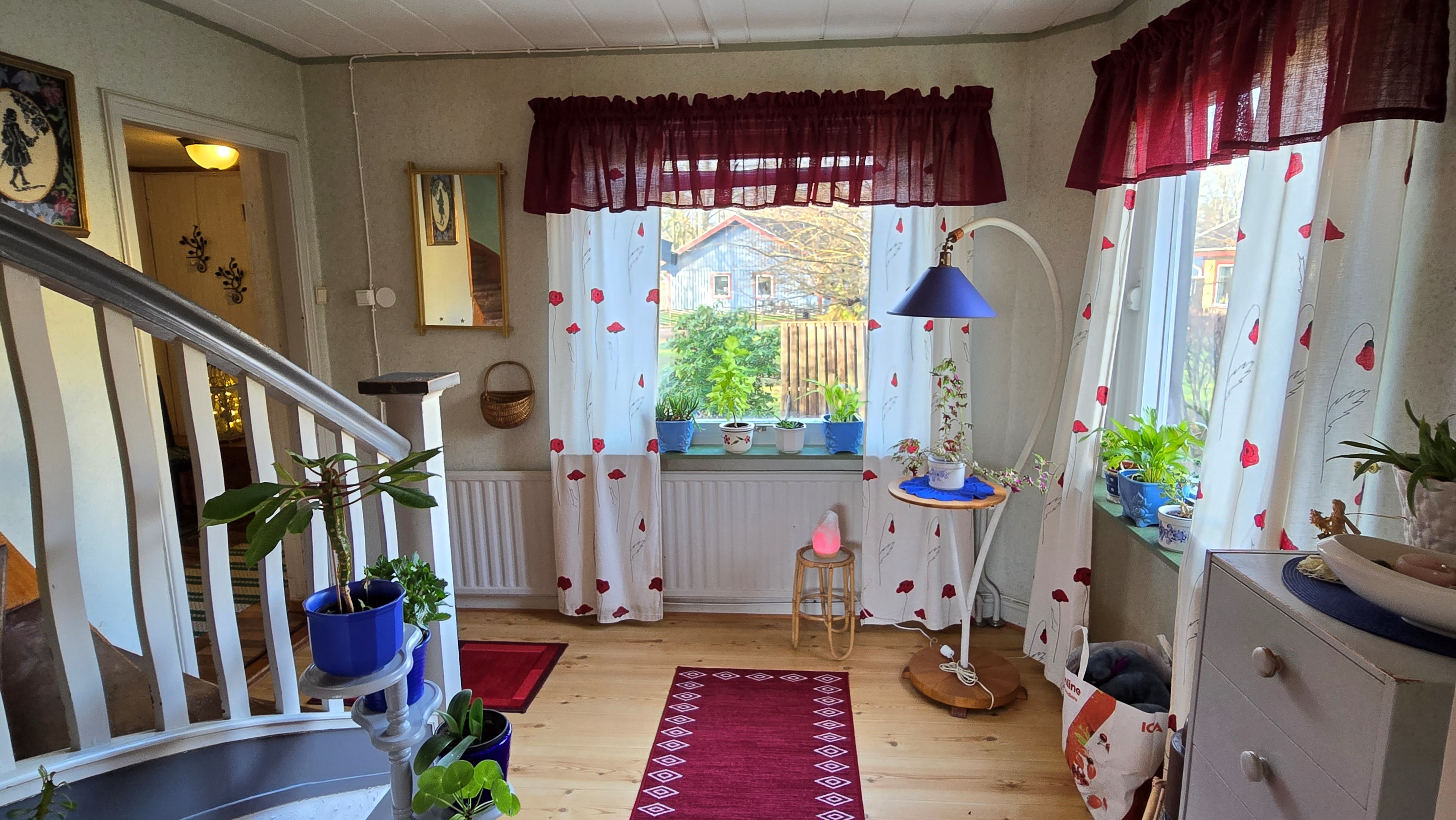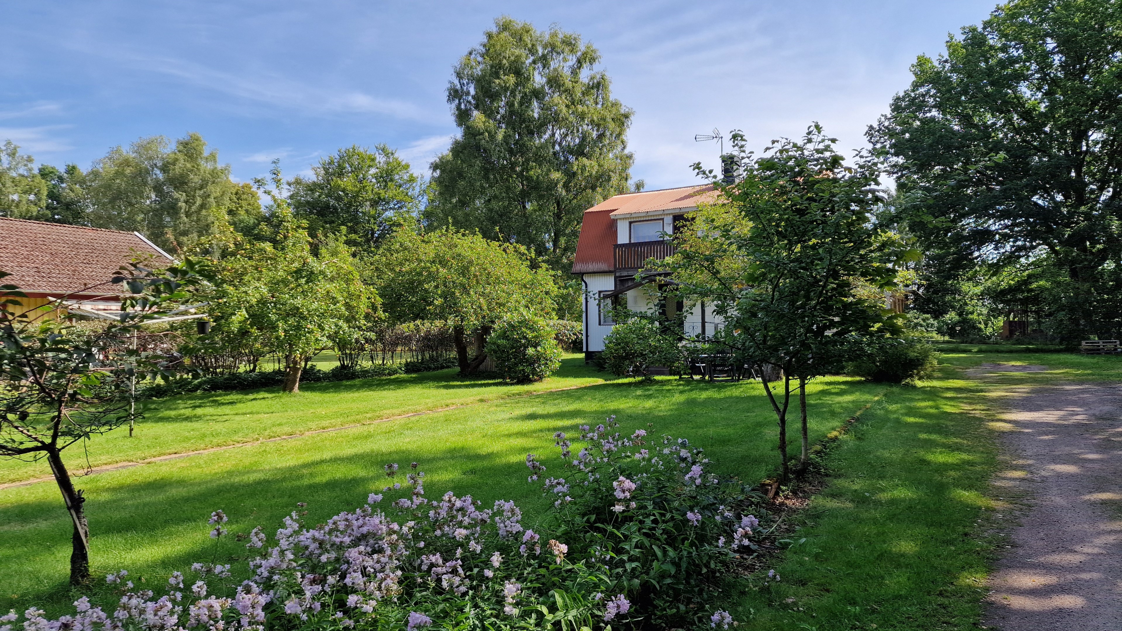 Villa från 1936 i utkanten av Knäred på 90 m2 + källare på 44 m2 och uthus på 50 m2. Kommunalt VA och vattenburen värme samt luftvärmepump. Kosmetiskt renoveringsbehov, men kan användas direkt och förbättras efterhand. 1 513 m2 tomt som det sista på vägen, 45 m. från Lagan. Ca. 1 km. från utomhus pool, vandringsleder, matbutik, skola, vårdcentral m.m. Filmvisning: https://youtu.be/Nx7RkrjWiyM Skansvägen 15 i Knäred är en villa från 1936 på ca. 90 m2 boyta + ca. 44 m2 källare. Härutöver finns en 8 m2 balkong i västerläge och en täckt terrass i söderläge på ca. 10 m2. Huset är plastbeklätt och en liten sektion vid entrén har eternit. På taket ligger ett äldre men tätt plåttak. Huset är väldigt lätt att underhålla, då ev. alger mm. lätt kan tvättas av plastklädseln. En bit hängränna saknas på kupan vid balkongen. Huset renoverades på 1990:talet, men det är dags att renovera igen, även om huset fungerar som det är och kan förbättras lite efterhand. Dubbelglasfönster i hela huset och huset är väl isolerat, så det är lätt att värma upp. Veto ved/pellets panna i källaren från 1990 med 500 liters ackumulatortank från 1993. Därutöver luftvärmepump från 2021. Alla elledningar och kontakter i huset är utbytta 2022 med nytt säkringsskåp med automatsäkringar och jordfelsbrytare. Kommunalt vatten och avlopp. Huset består av hall med laminatgolv (trä under), tretex i taket, träpanel på väggarna och trappa till källaren. Kök med laminatgolv, gott om skåp, diskbänk, elspis med keramisk häll (ca. 2014), spisfläkt, mikro och kyl/frys (2022). Matsal med plastmatta på golvet och tretex i taket. Vardagsrum med plastmatta, tretex i taket, luftvärmepumpen och valv som leder till möblerbart trapphallsrum med trappa till övervåningen. På övervåningen finns möblerbar trapphall med plastmatta på golvet, dörr till balkong i västerläge, toalett med WC och handfat (nya medföljer, men ej monterade) och en garderob bredvid toaletten, så det finns plats att bygga ett litet badrum i framtiden. Kontor eller sovrum med plastmatta på golvet, inbyggd garderob och valv in till ännu ett rum som nu används till lager. Man skulle lätt kunna dela upp detta i två separata rum vid behov. Sovrum med plastmatta på golvet, gott om plats för dubbelsäng och många inbyggda garderober. I källaren finns badrum från 1990:talet med våtrumsmatta på golv och väggar, WC, handfat och dusch. Badrummet skulle behöva renoveras, men fungerar som det är. Två skafferier. Pannrum med ved/pellets panna, ackumulatortank, pelletsförråd och två extra frysar. Tvättstuga med tvättmaskin, torktumlare, extra varmvattensberedare till när man inte använder pannan och en dörr direkt till trädgården. Huset säljs som utgångspunkt utan inventarier, men vissa möbler, verktyg och redskap kan köpas till eller medfölja, enl. önskemål och avtal med säljaren. Ut över huset finns här ett rejält uthus/liten lada på ca. 50 m2 + tillbyggt skjul på baksidan och på framsidan och ett garage och lagringsplats i källaren. Äldre eternittak. I uthuset finns verkstadsrum och gott om plats för lagring. Maskiner som står i och utanför uthuset kommer att tas bort innan tillträde. 1 513 m2 (friköpt) trädgårdstomt för ändan av Skansvägen, där marken sluttar brant ner till Lagan precis utanför tomten. Marken mellan tomten och ån ägs av kommunen och det är ok att tunna ut i buskar och snår, men man får inte fälla träd. En liten stig har fört ner till ån tidigare, men den är nu i stort sett borta, så det kan vara utmanande att gå raka vägen ner till ån från huset. Det finns dock flera stigar ner till ån och ca. 1 km. härifrån finns Flammabadet utomhus pool, där det även finns en liten strand och bålplats vid Lagan. På tomten finns gott om parkeringsplats, gräsmatta, äppelträd, körsbärsträd, rhododendron och björnbär. Träden ger mycket frukt. Väg 15 löper ca. 600 m. från huset, på andra sidan ån och den kan höras, beroende på väder, vind och årstid. På andra sidan väg 15 löper även en järnväg, "Markarydsbanan", och det planeras att bygga en station i Knäred, så man kan ta tåget in till Halmstad eller Hässleholm. Enligt planen ska detta vara klart till 2028. Vid Flammabadet, ca. 1 km. från huset finns även tennisbanor, campingplats och en naturskön vandringsled. Ca. 2 km. till Krokån, Kvarnfallet och den nya vandringsleden, "Krokåslingan", som hänger ihop med Prästaskogens naturreservat och ny gångbro över Krokån. Här ligger även Kvarnen i Knäred, som ibland håller musikarrangemang och sommarcafé. Knäred samhälle har ca. 1200 invånare och det finns bl.a. bra Coop matbutik, Hotell 1613 med restaurang, pizzeria, järnaffär, blomsterbutik, loppis, vårdcentral, skola och "Flammabadet" förstås. Området i stort bjuder också på många natur- och kulturupplevelser med ca. 7 km. till Kulturreservat Bollaltebygget med kringbyggd museumsgård på 1600-talet, ca. 8 km. till "Vippentorpet" hembygdsgård med våffelcafé om sommaren och ca. 7 km. till Hjörneredssjöarna med kanotuthyrning, vandringsleder, fricampning och flera badplatser. Ca. 10 km. till naturreservat Mästocka ljunghed och fin badplats i Björsjön och omkring samma avstånd till det stora naturreservatet Rönnö. Ca. 10 km. till Skogaby Golfklubb. Ca. 17 km. till Laholm samhälle och ca. 25 km. till havet, Mellbystrand och till Vallåsen Bike-Park på Hallandsås och till Kungsbyggets Äventyrspark med zipline och rodelbana sommartid. Ca. 35 km. till Halmstad och färjan till Grenå. Ca. 75 km. från Helsingborg och ca. 135 km. från Malmö.
