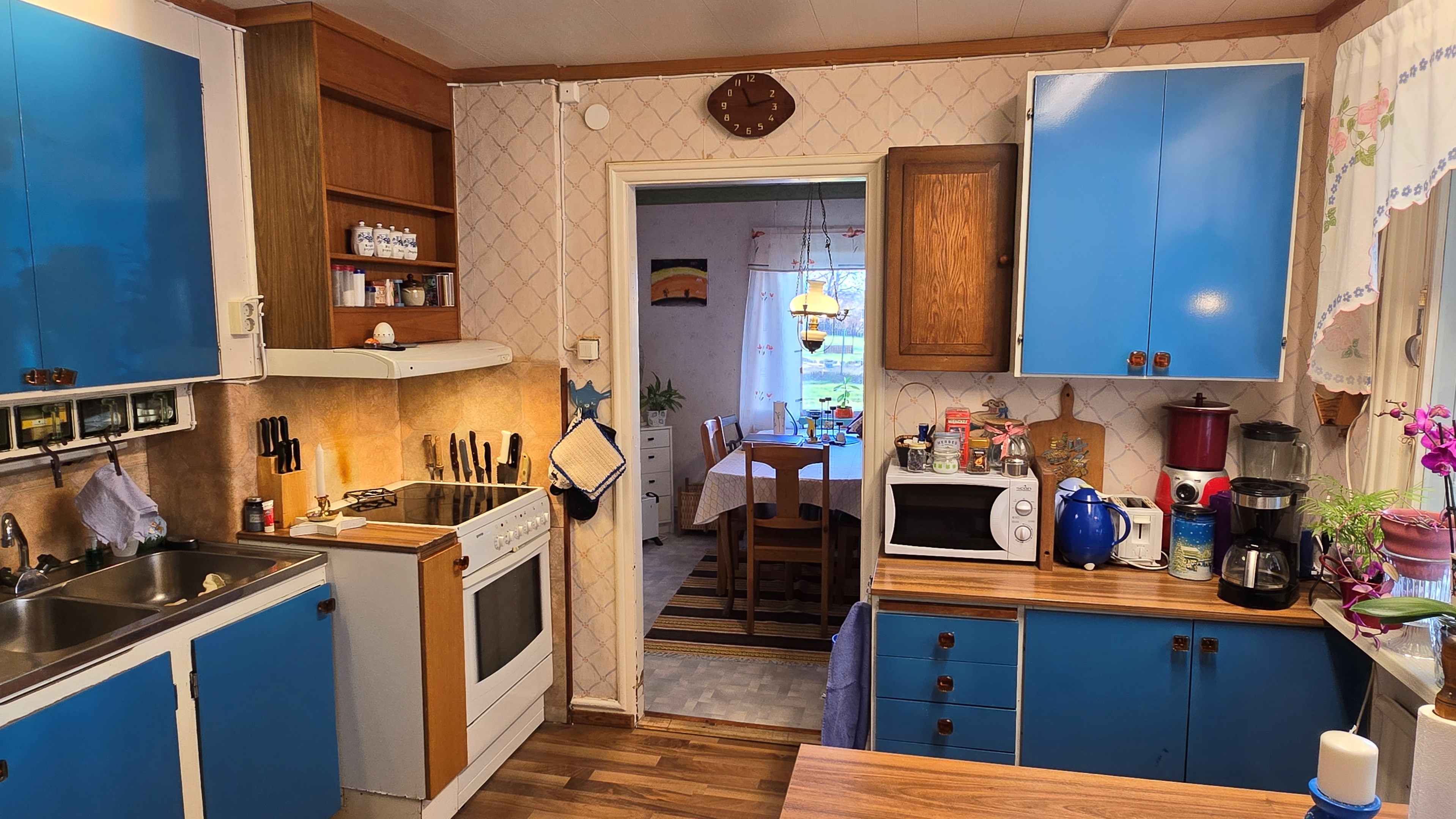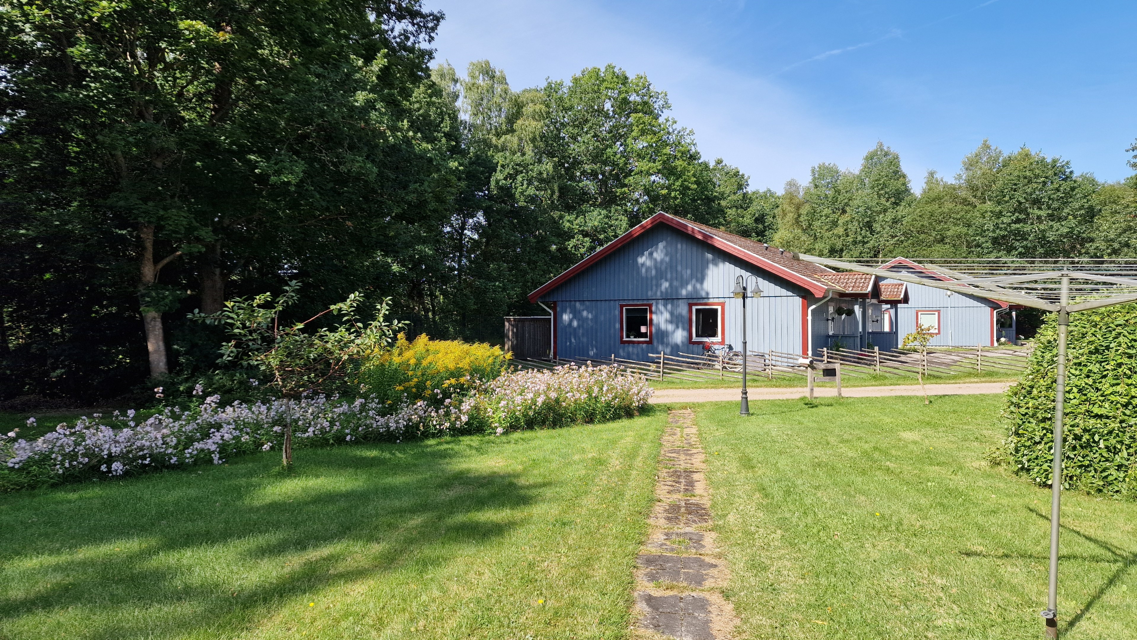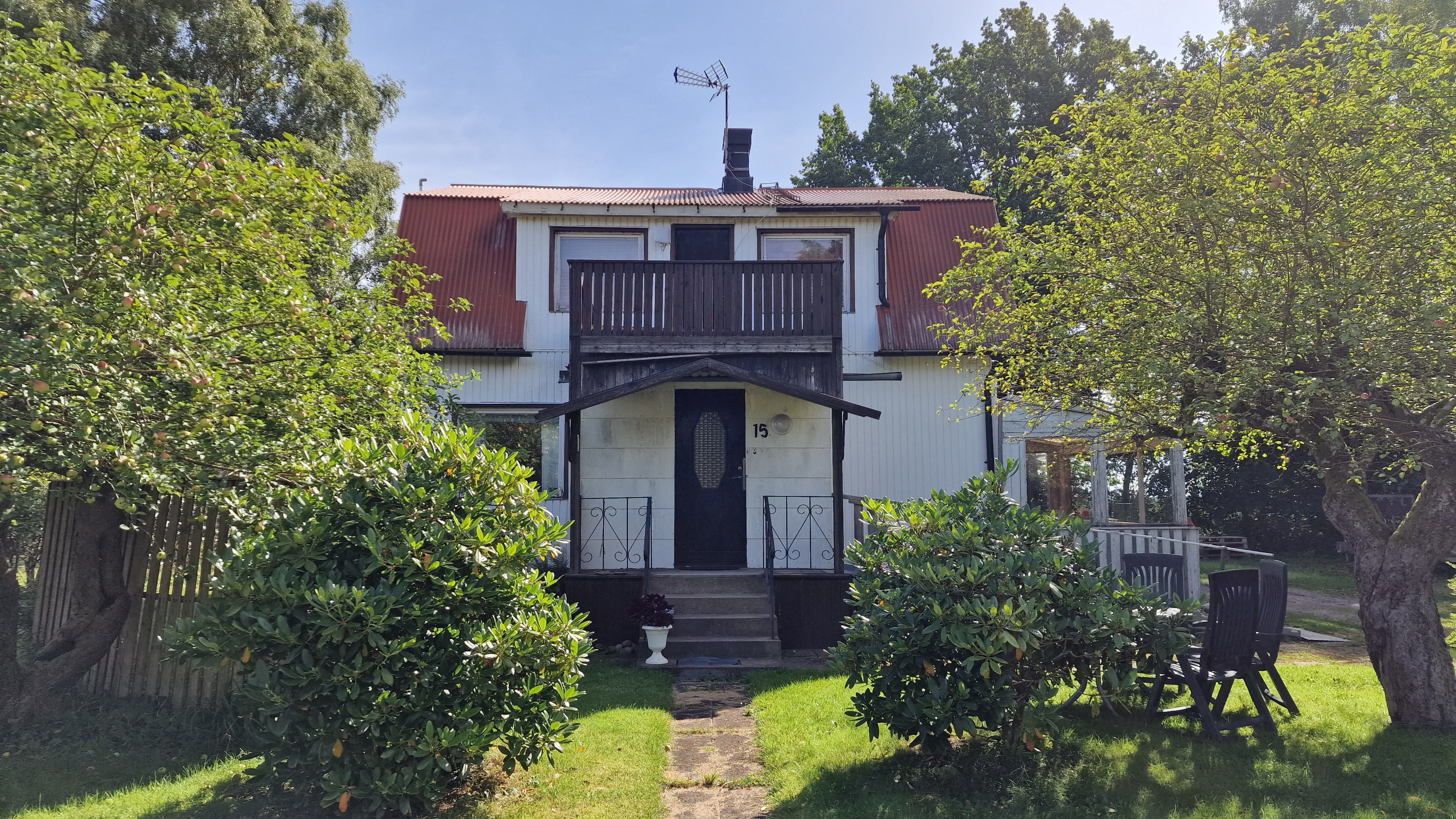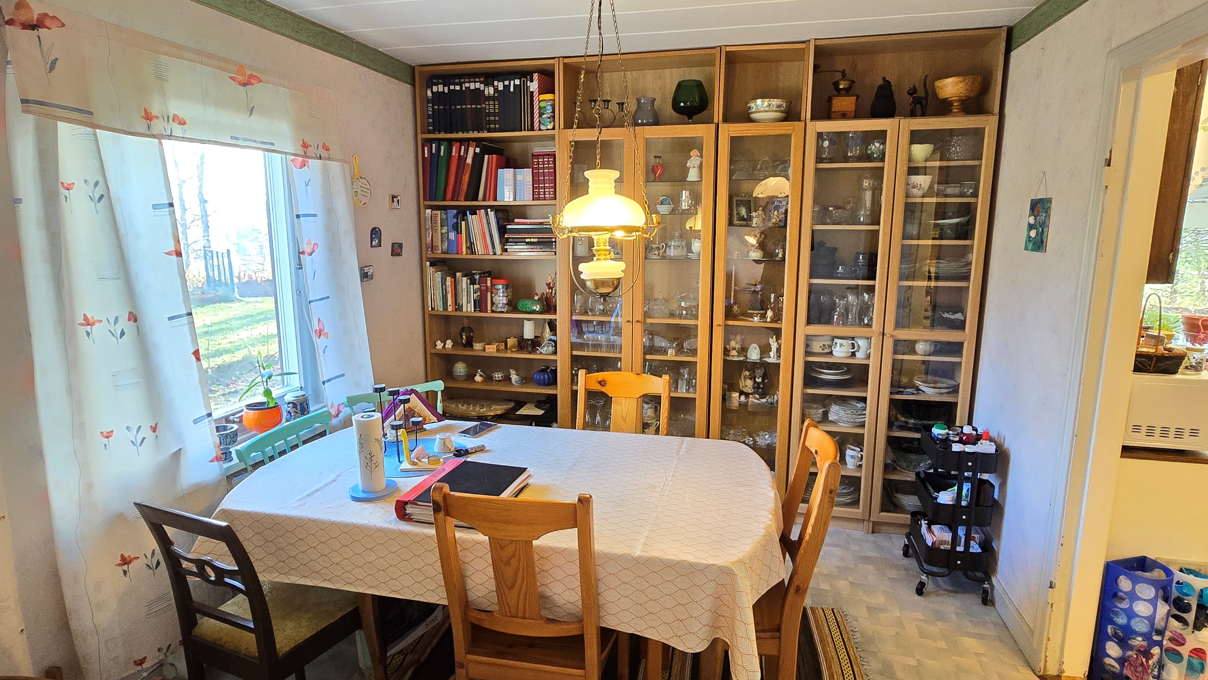 Villa från 1936 i utkanten av Knäred på 90 m2 + källare på 44 m2 och uthus på 50 m2. Kommunalt VA och vattenburen värme samt luftvärmepump. Kosmetiskt renoveringsbehov, men kan användas direkt och förbättras efterhand. 1 513 m2 tomt som det sista på vägen, 45 m. från Lagan. Ca. 1 km. från utomhus pool, vandringsleder, matbutik, skola, vårdcentral m.m. Filmvisning: https://youtu.be/Nx7RkrjWiyM Skansvägen 15 i Knäred är en villa från 1936 på ca. 90 m2 boyta + ca. 44 m2 källare. Härutöver finns en 8 m2 balkong i västerläge och en täckt terrass i söderläge på ca. 10 m2. Huset är plastbeklätt och en liten sektion vid entrén har eternit. På taket ligger ett äldre men tätt plåttak. Huset är väldigt lätt att underhålla, då ev. alger mm. lätt kan tvättas av plastklädseln. En bit hängränna saknas på kupan vid balkongen. Huset renoverades på 1990:talet, men det är dags att renovera igen, även om huset fungerar som det är och kan förbättras lite efterhand. Dubbelglasfönster i hela huset och huset är väl isolerat, så det är lätt att värma upp. Veto ved/pellets panna i källaren från 1990 med 500 liters ackumulatortank från 1993. Därutöver luftvärmepump från 2021. Alla elledningar och kontakter i huset är utbytta 2022 med nytt säkringsskåp med automatsäkringar och jordfelsbrytare. Kommunalt vatten och avlopp. Huset består av hall med laminatgolv (trä under), tretex i taket, träpanel på väggarna och trappa till källaren. Kök med laminatgolv, gott om skåp, diskbänk, elspis med keramisk häll (ca. 2014), spisfläkt, mikro och kyl/frys (2022). Matsal med plastmatta på golvet och tretex i taket. Vardagsrum med plastmatta, tretex i taket, luftvärmepumpen och valv som leder till möblerbart trapphallsrum med trappa till övervåningen. På övervåningen finns möblerbar trapphall med plastmatta på golvet, dörr till balkong i västerläge, toalett med WC och handfat (nya medföljer, men ej monterade) och en garderob bredvid toaletten, så det finns plats att bygga ett litet badrum i framtiden. Kontor eller sovrum med plastmatta på golvet, inbyggd garderob och valv in till ännu ett rum som nu används till lager. Man skulle lätt kunna dela upp detta i två separata rum vid behov. Sovrum med plastmatta på golvet, gott om plats för dubbelsäng och många inbyggda garderober. I källaren finns badrum från 1990:talet med våtrumsmatta på golv och väggar, WC, handfat och dusch. Badrummet skulle behöva renoveras, men fungerar som det är. Två skafferier. Pannrum med ved/pellets panna, ackumulatortank, pelletsförråd och två extra frysar. Tvättstuga med tvättmaskin, torktumlare, extra varmvattensberedare till när man inte använder pannan och en dörr direkt till trädgården. Huset säljs som utgångspunkt utan inventarier, men vissa möbler, verktyg och redskap kan köpas till eller medfölja, enl. önskemål och avtal med säljaren. Ut över huset finns här ett rejält uthus/liten lada på ca. 50 m2 + tillbyggt skjul på baksidan och på framsidan och ett garage och lagringsplats i källaren. Äldre eternittak. I uthuset finns verkstadsrum och gott om plats för lagring. Maskiner som står i och utanför uthuset kommer att tas bort innan tillträde. 1 513 m2 (friköpt) trädgårdstomt för ändan av Skansvägen, där marken sluttar brant ner till Lagan precis utanför tomten. Marken mellan tomten och ån ägs av kommunen och det är ok att tunna ut i buskar och snår, men man får inte fälla träd. En liten stig har fört ner till ån tidigare, men den är nu i stort sett borta, så det kan vara utmanande att gå raka vägen ner till ån från huset. Det finns dock flera stigar ner till ån och ca. 1 km. härifrån finns Flammabadet utomhus pool, där det även finns en liten strand och bålplats vid Lagan. På tomten finns gott om parkeringsplats, gräsmatta, äppelträd, körsbärsträd, rhododendron och björnbär. Träden ger mycket frukt. Väg 15 löper ca. 600 m. från huset, på andra sidan ån och den kan höras, beroende på väder, vind och årstid. På andra sidan väg 15 löper även en järnväg, "Markarydsbanan", och det planeras att bygga en station i Knäred, så man kan ta tåget in till Halmstad eller Hässleholm. Enligt planen ska detta vara klart till 2028. Vid Flammabadet, ca. 1 km. från huset finns även tennisbanor, campingplats och en naturskön vandringsled. Ca. 2 km. till Krokån, Kvarnfallet och den nya vandringsleden, "Krokåslingan", som hänger ihop med Prästaskogens naturreservat och ny gångbro över Krokån. Här ligger även Kvarnen i Knäred, som ibland håller musikarrangemang och sommarcafé. Knäred samhälle har ca. 1200 invånare och det finns bl.a. bra Coop matbutik, Hotell 1613 med restaurang, pizzeria, järnaffär, blomsterbutik, loppis, vårdcentral, skola och "Flammabadet" förstås. Området i stort bjuder också på många natur- och kulturupplevelser med ca. 7 km. till Kulturreservat Bollaltebygget med kringbyggd museumsgård på 1600-talet, ca. 8 km. till "Vippentorpet" hembygdsgård med våffelcafé om sommaren och ca. 7 km. till Hjörneredssjöarna med kanotuthyrning, vandringsleder, fricampning och flera badplatser. Ca. 10 km. till naturreservat Mästocka ljunghed och fin badplats i Björsjön och omkring samma avstånd till det stora naturreservatet Rönnö. Ca. 10 km. till Skogaby Golfklubb. Ca. 17 km. till Laholm samhälle och ca. 25 km. till havet, Mellbystrand och till Vallåsen Bike-Park på Hallandsås och till Kungsbyggets Äventyrspark med zipline och rodelbana sommartid. Ca. 35 km. till Halmstad och färjan till Grenå. Ca. 75 km. från Helsingborg och ca. 135 km. från Malmö.