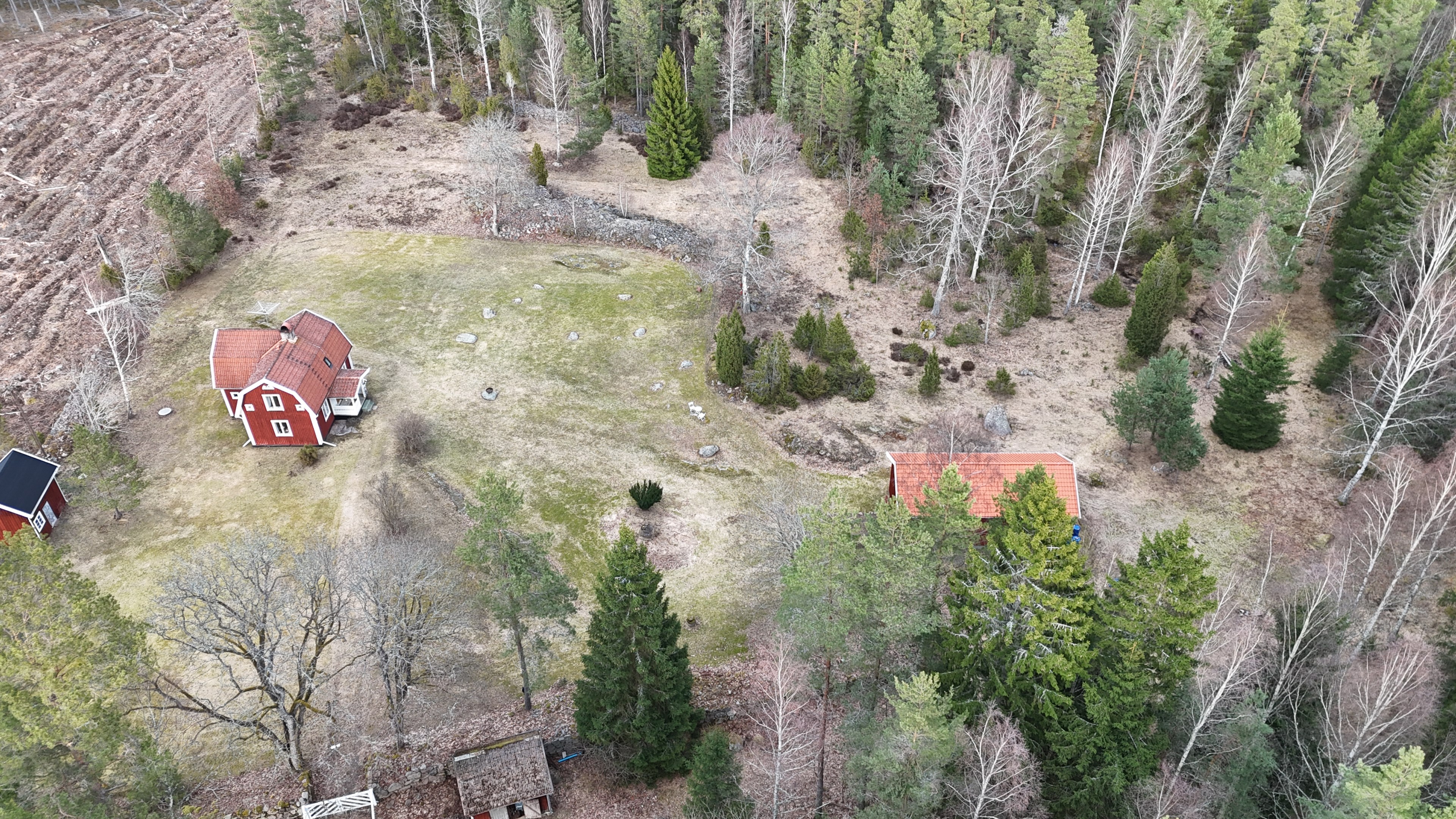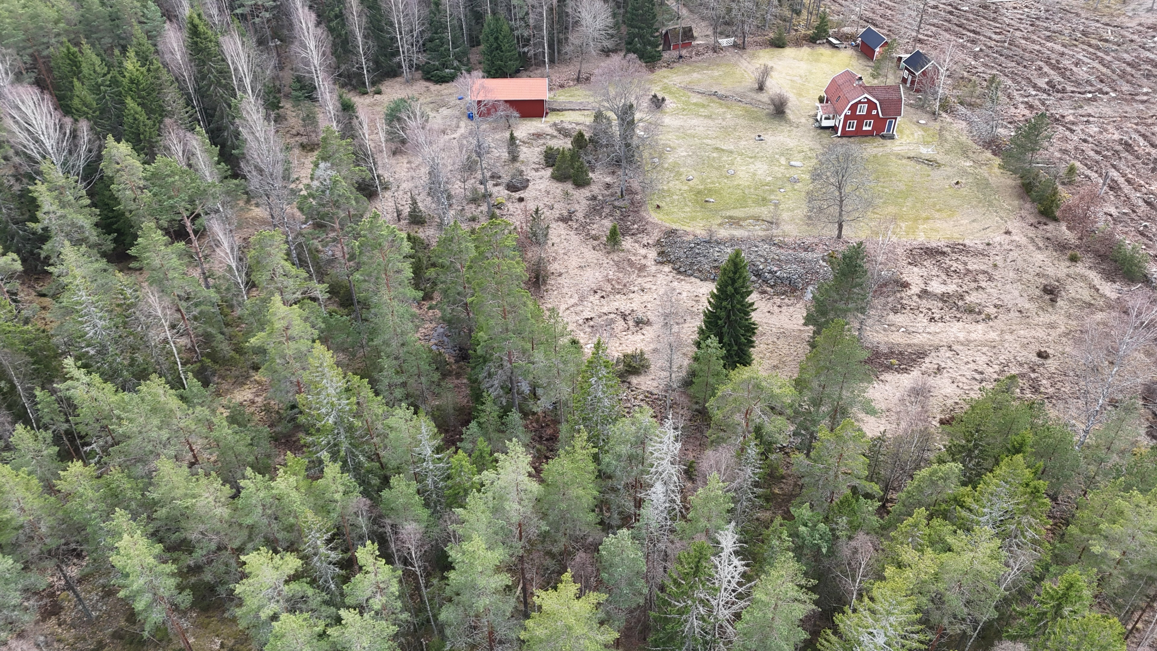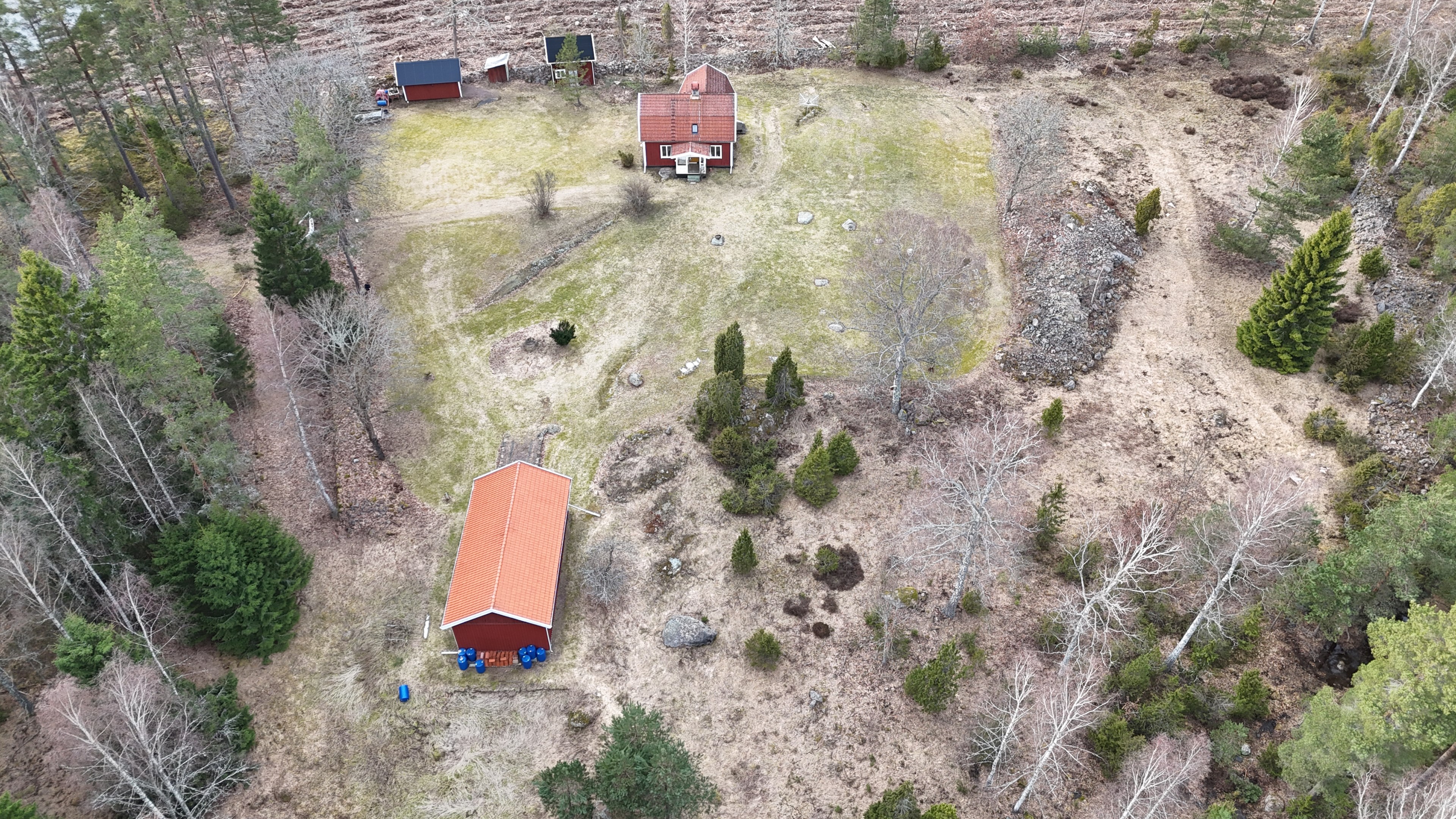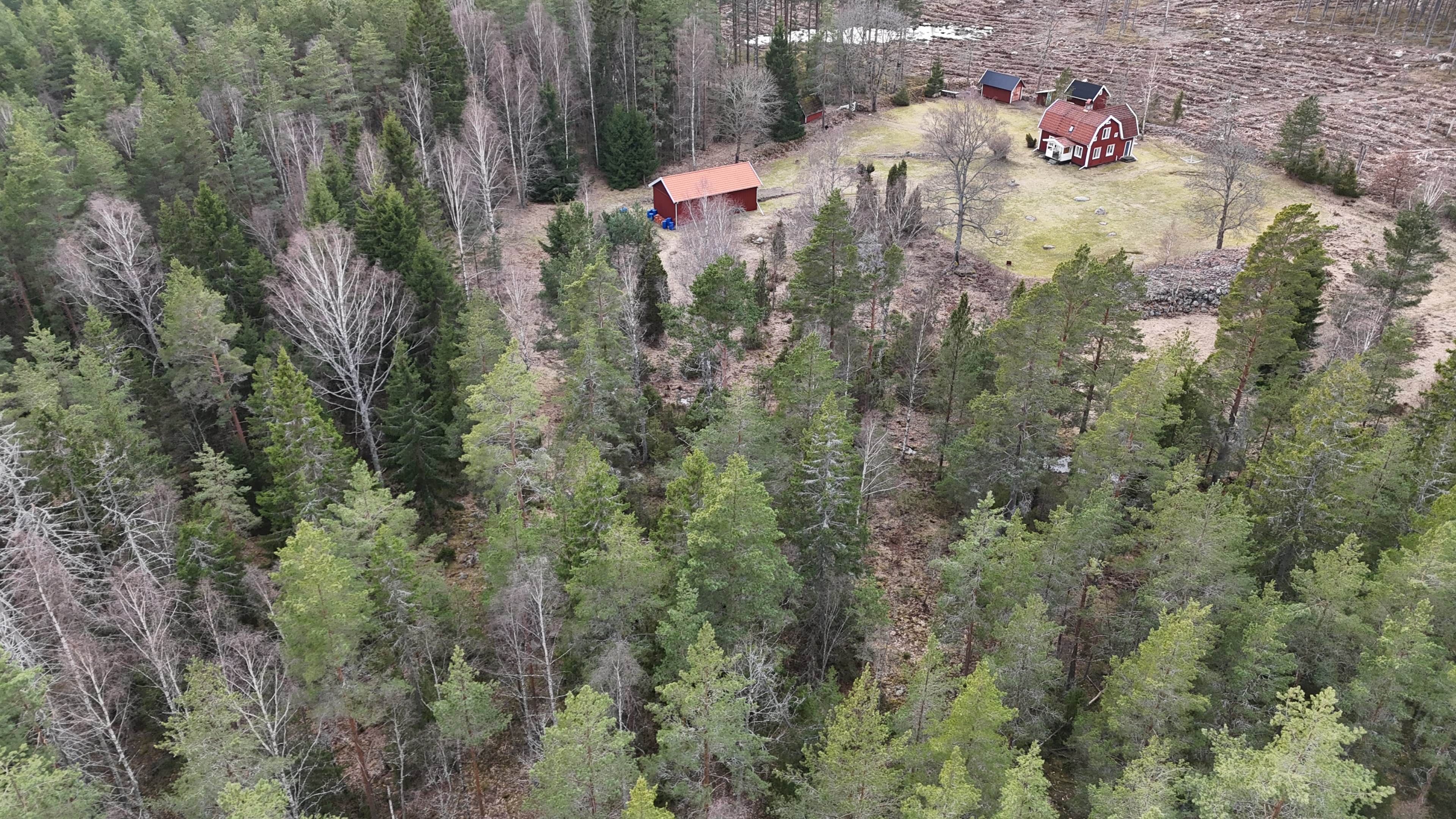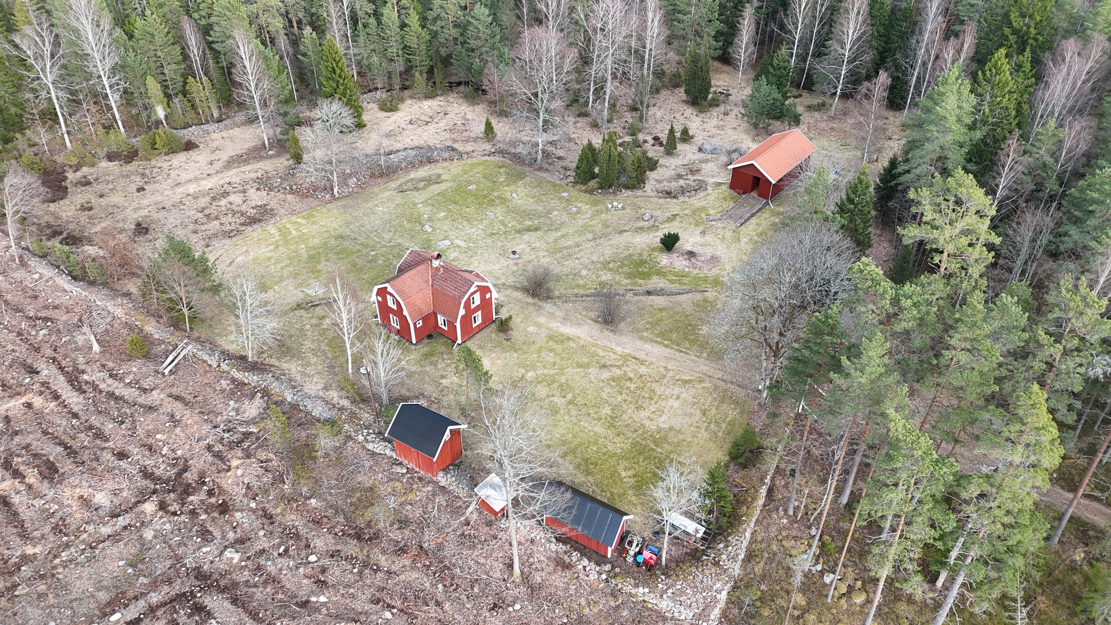 Torp från mitten på 1800-talet på ca 130 m², tillbyggt 1936, samt löpande renoverat under de senaste ca. 20 åren. Uppvärmning via luftvärmepump, elvärme och flera braskaminer och rörspisar. Vatten från borrad brunn (35 m djup), avlopp till trekammarbrunn med infiltration. Ny lada på 72 m² med garageplats och verkstad, uthus/museum ca 10 m² + vind, uthus med inbyggd container på ca. 15 m² och vedbod på ca 10 m². 14 500 m² helt enslig tomt med öppna gräsytor omkring byggnaderna, en del vedskog och vackra stengärdsgårdar. 600 m. till närmaste granne. Ca 1,5 km till stora sjön Algunnen med båtplats och omkringliggande naturreservat. Ca 270 km från Helsingborg. Filmrundvisning: https://youtu.be/s7994qFqB64 "Skogslund" - Mjöshyltan 180 vid Alsterbro är ett klassiskt småländskt torp med anor från 1800-talets mitt, tillbyggt och renoverat 1936, med mansardtak och därefter löpande renoverat under de senaste 20 åren. Huset är på ca. 130 m² boyta och i gott skick och redo att använda direkt. Lite utvändig målning och kosmetisk renovering här och var, men inget akut. På taket ligger betongpannor och med taktegel på den nyare verandan. Taket på veranda har skador på teglet, där några pannor behöver bytas. Fönstren är huvudsakligen kopplade tvåglasfönster, några enstaka med spricka i ett av glasen. Elsystemet har äldre porslinssäkringar och saknar jordfelsbrytare, men fungerar väl. Uppvärmningen sker via luftvärmepump (2023), direktverkande elvärme samt två braskaminer, en vedspis och två rörspisar, samtliga godkända och i bruk. Vatten tas från en 35 meter djup borrad brunn (lite järn, men ej filter) och avloppet är en trekammarbrunn med infiltration. Huset är sanerat mot husbock och har extra husbockförsäkring av Anticimex. Läs även mer om husets historia under "dokument" rubriken. Entré från mysig veranda via pardörrar in till hall med nyare plankgolv, synliga timmerväggar och träpanel i taket. Mindre sovrum eller lounge med nyare trägolv, platsbyggda sängar, bröstpanel och tapet på väggarna och en öppen rörspis. Vardagsrummet har trägolv, äldre brädor i taket, nya tapeter och extra isolering och ytterligare en fin vitputsad rörspis. Rymligt lantkök med matplats, nyare trägolv, träpanel i taket, gott om skåp, diskbänk, elspis med keramisk häll, kyl/frys, diskmaskin (ej fungerande), vedspis och braskamin. Luftvärmepumpens innerdel finns även i köket och så finns ett litet skafferi. Köksentrén har nyare trägolv och ytterdörr. På övervåningen finns en rymlig trapphall med garderob, trägolv och inspektionslucka till vinden. Hela övervåningen inreddes för ca. 20 år sedan. Badrum med målat plankgolv, duschkabin, WC, handfat, mekanisk ventilation, infällda spotlights i taket, Velux takfönster och tvättmaskin. Badrummet saknar våtrumsmatta, vilket innebär att försäkringsbolagens krav inte är uppfyllda, men det har fungerat fint i alla år. Stort master bedroom med trägolv, dubbelsäng, garderob, Morsø braskamin och öppet till nock med synliga takbjälkar. Sovrum med trägolv, dubbelsäng, öppet till nocken med liten plattform för lagring under taket och ytterligare en plattform lämplig för lagring eller barn. Mindre sovrum med trägolv och två enkelsängar. En del inventarier och maskiner kan köpas till eller medfölja, enl. önskemål och avtal med säljaren. På tomten finns en nyuppförd lada om ca 72 m² med garage, verkstad, el indraget med 3-fas kontakt och avfuktare i grunden. Byggnaden har tegeltak, god takhöjd och inspektionslucka till krypgrund. Här finns plats för flera fordon, traktor och trädgårdsmaskiner (köp av traktor mm kan förhandlas). Uthus med nytt papptak om ca 10 m² samt vind som idag används som litet museum med många gamla lantbruksredskap utställda och även plats för grill, trädgårdsmöbler och förvaring. Uthus på ca 15 m² med plåttak med inbyggd container för säker förvaring av verktyg och maskiner. Vedbod på ca. 10 m². Gammalt utedass i dåligt skick. 14 500 m² (friköpt) trädgård och skogstomt med öppna gräsytor omkring byggnaderna, en del vedskog, så man kan hålla sig självförsörjande med ved och fina stengärdsgårdar samt stora klippor och stenar som tittar fram. Området är mycket stenrikt och bjuder på genuin småländsk natur. Fastigheten ligger helt avskilt, inne på sin egen sidoväg till grusväg utan genomfartstrafik och med närmaste granne ca 600 meter bort. Skogen angränsade tomten på ena sidan har nyligen fällts, vilket ger en massa ljus och luft till tomten och resten av skogen runt fastigheten är ekopark med naturskyddsavtal och kan också komma att bli naturreservat. Ca. 800 m. till den lilla sjön Trehörningen och ca. 1,5 km till den stora sjön Algunnen med bad- och båtplats (båt och kanot kan köpas till). Stora delar av sjön Algunnen är också naturreservat och reservatet börjar ca. 600 m. fågelvägen från huset. Ca. 14 km till Alsterbro med närmaste service och ytterligare badplats. Ca. 12 km. till det otroligt vackra Aboda Klint med storslagen utsikt över landskapet och flera sjöar. Ca 42 km till Nybro samhälle och ca. 62 km till Kalmar och Ölandsbron. Ca. 110 km. från Astrid Lindgrens Värld. Ca. 270 km från Helsingborg och ca. 290 km från Malmö.